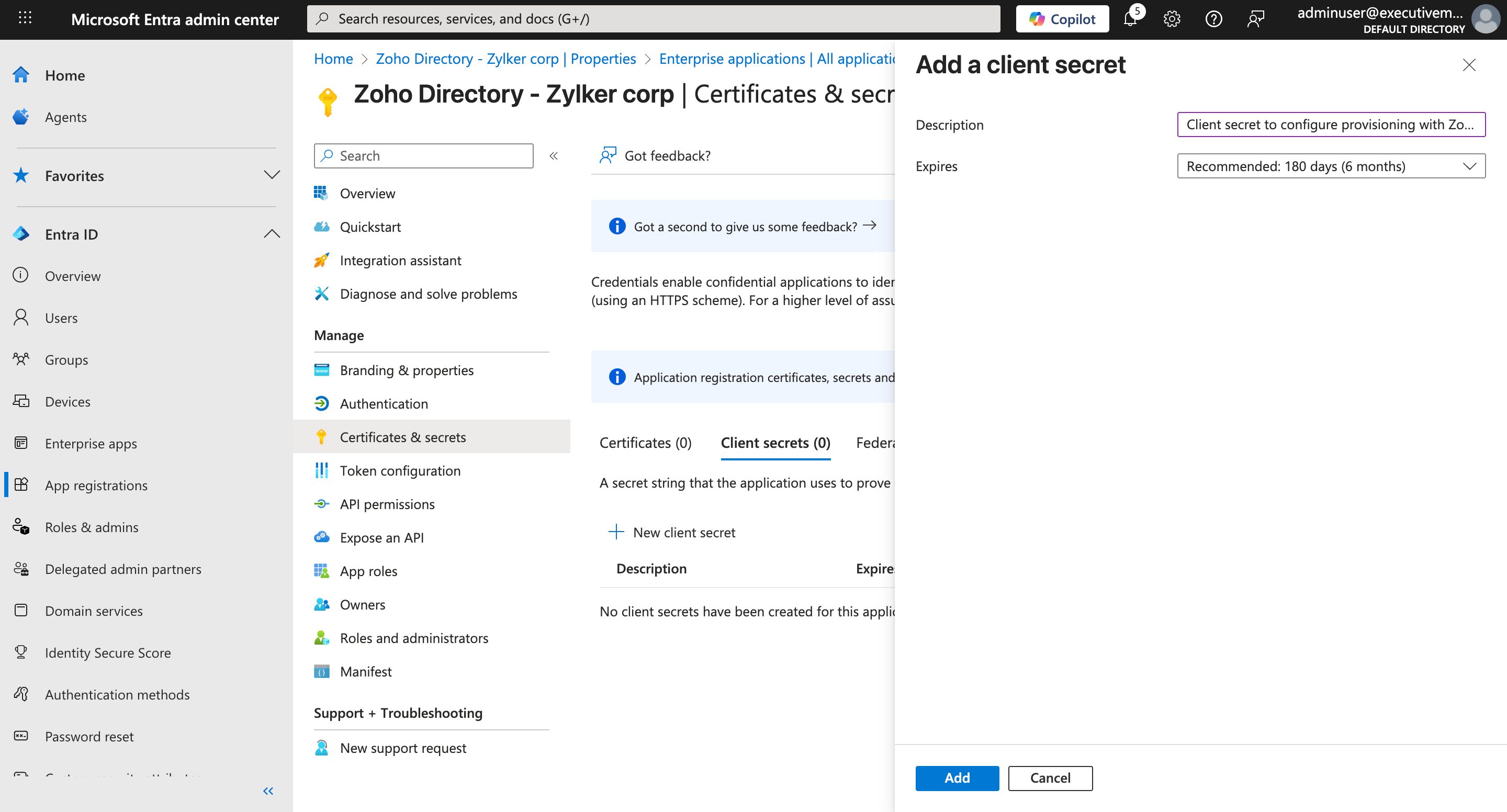 - Click Certificates & secrets, then click New client secret.
