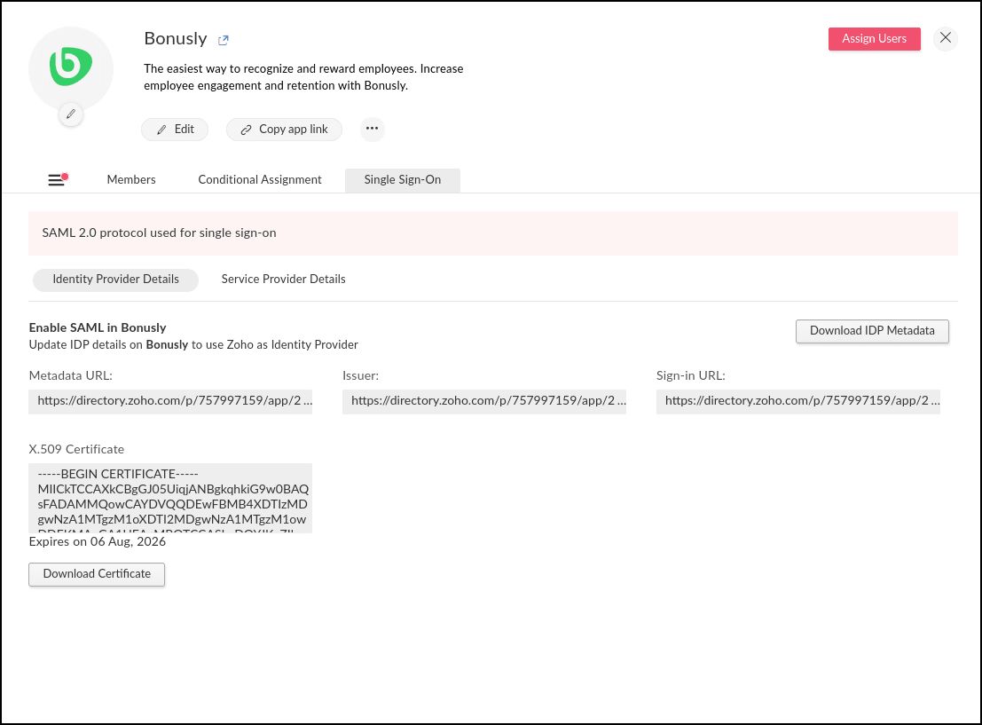 If you want to test the SAML configuration before allowing users to access Bonusly, uncheck Display app to users.