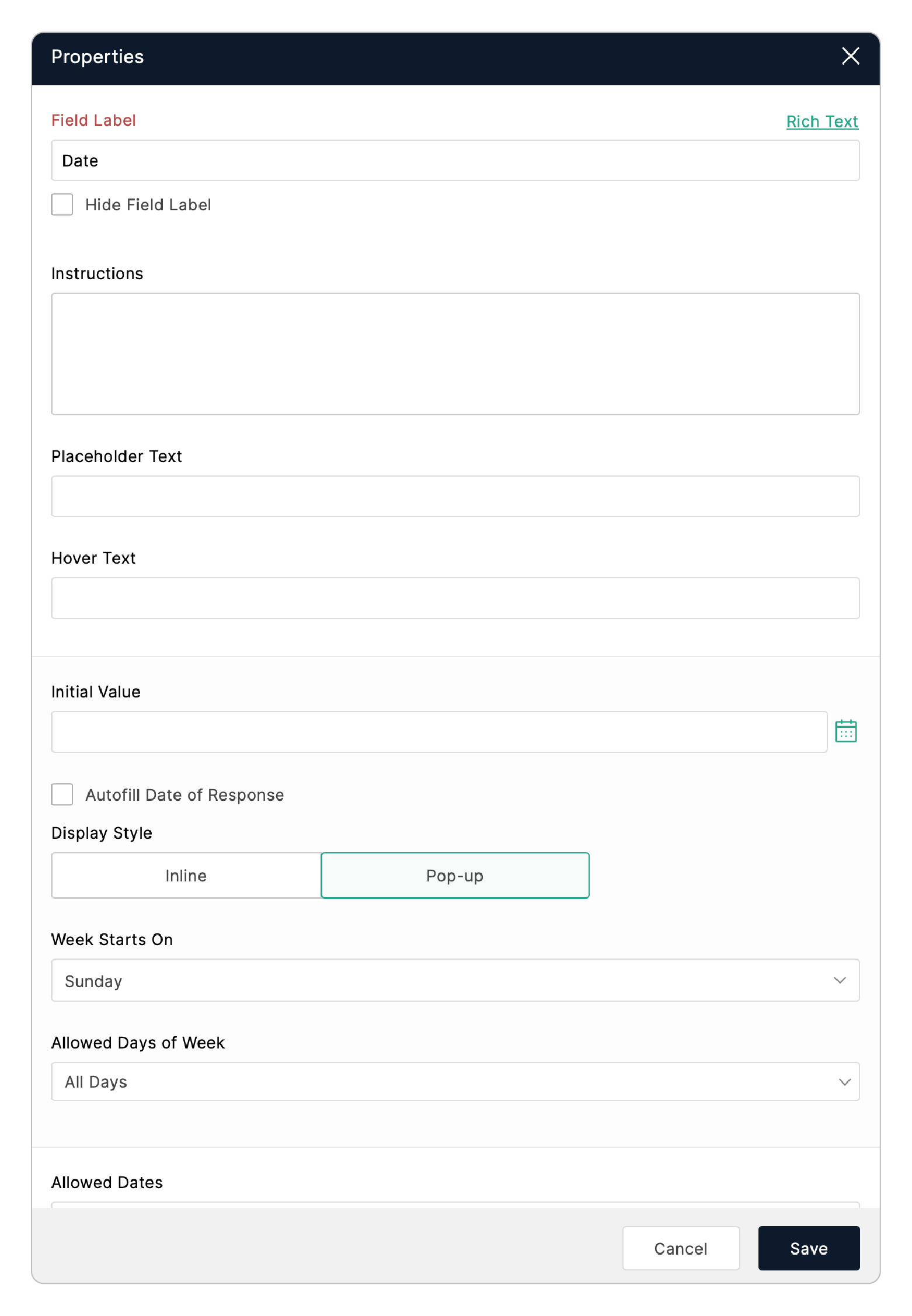 Note: You can only select the Date fields that are configured above the Date field that you are setting up.Additional Options in Allowed Dates