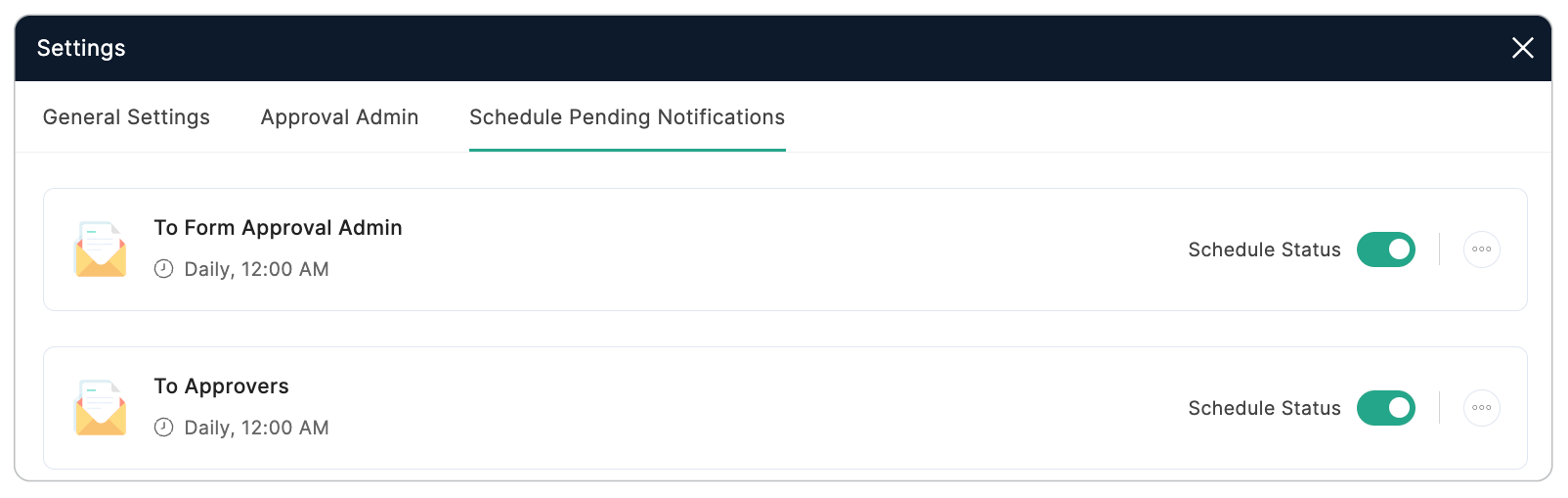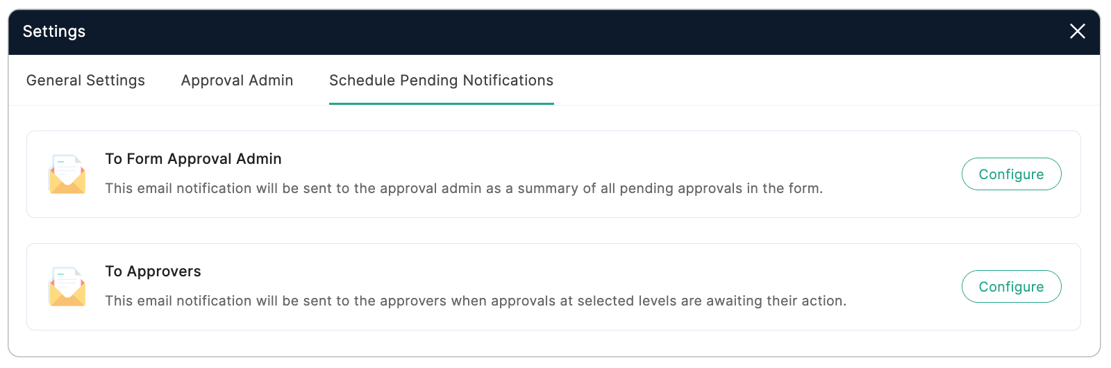 Under Schedule Pending Notifications, you can schedule email notifications for pending approvals to both the Form Approval Admin and Approvers.