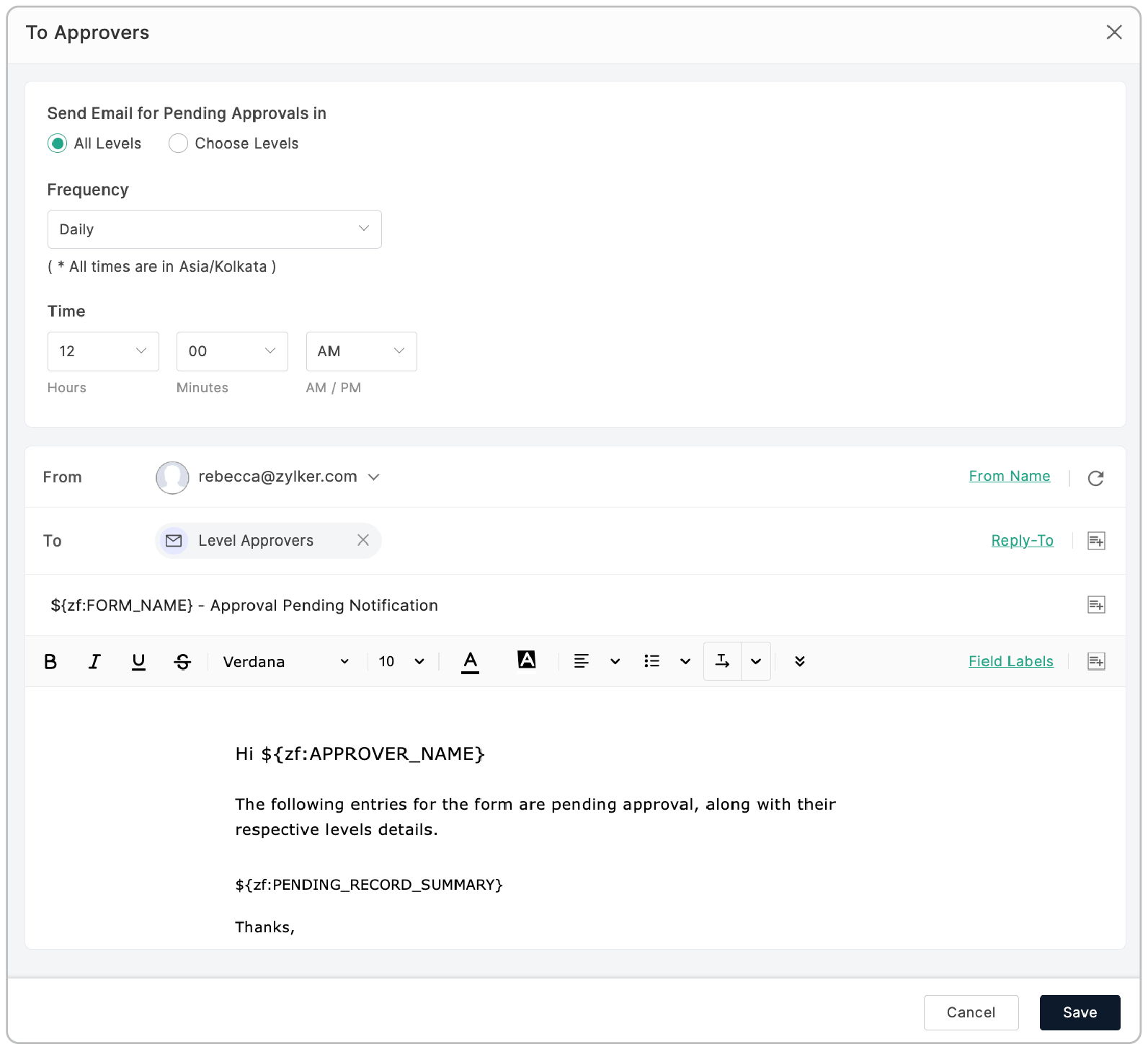 1. You can send email notifications for approvals pending at All Levels or Choose Specific Levels.
