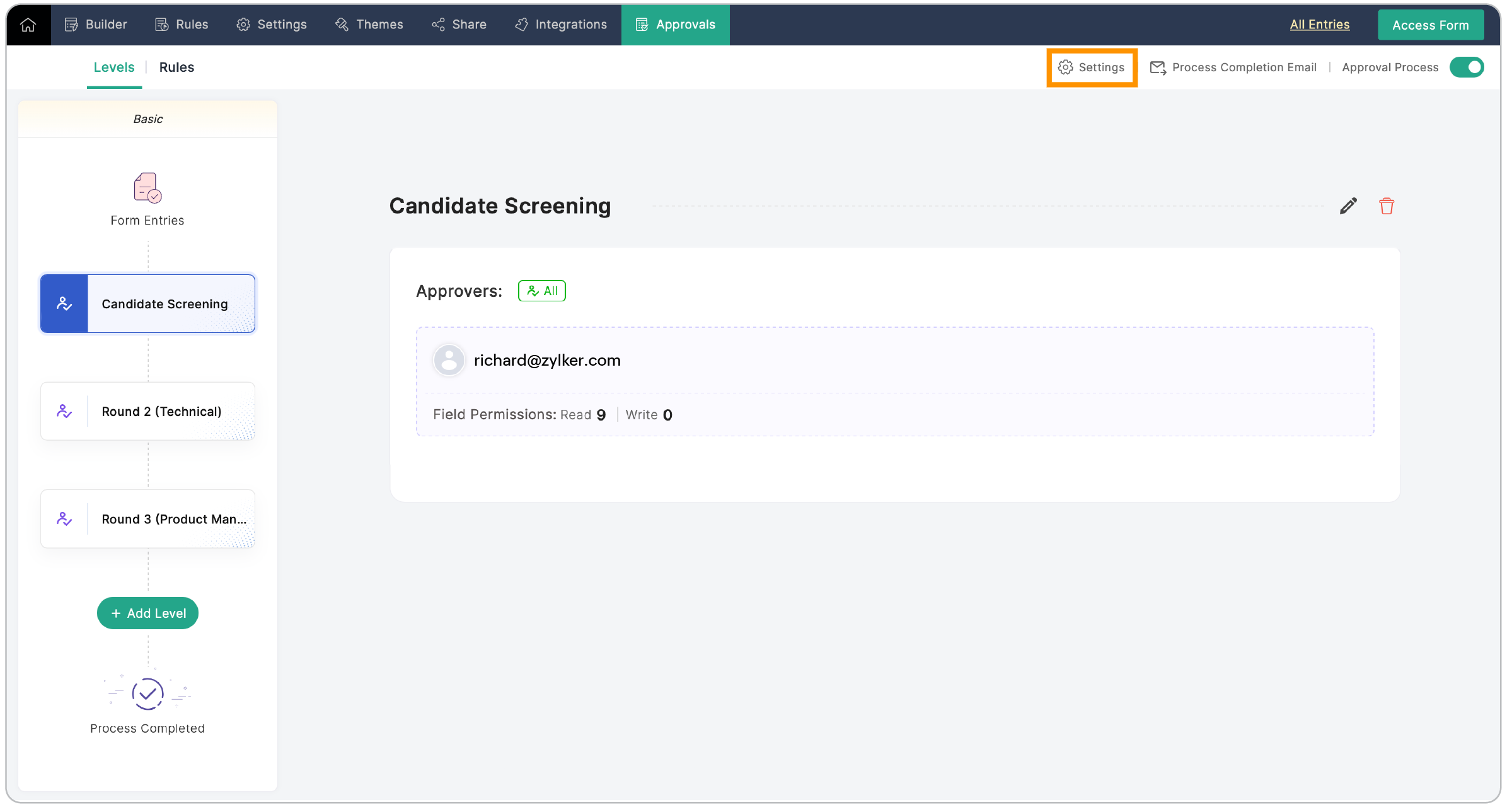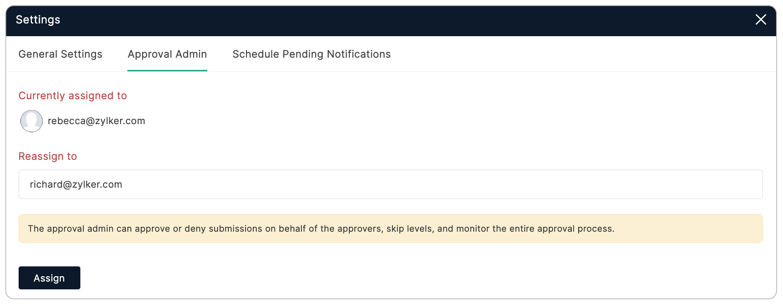 Under Approval Settings, you can customize button labels, process integrations configured with your form only on successful approval of entries, re-assign approval admin to approve or deny the entries on behalf of the approvers and schedule notifications for pending approvals.