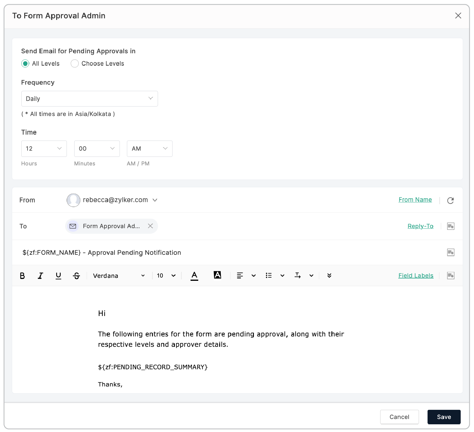 Subject: The subject is automatically mapped with the Form Name and the Approval Pending Notification text. However, it can be customised as needed to suit your requirements.