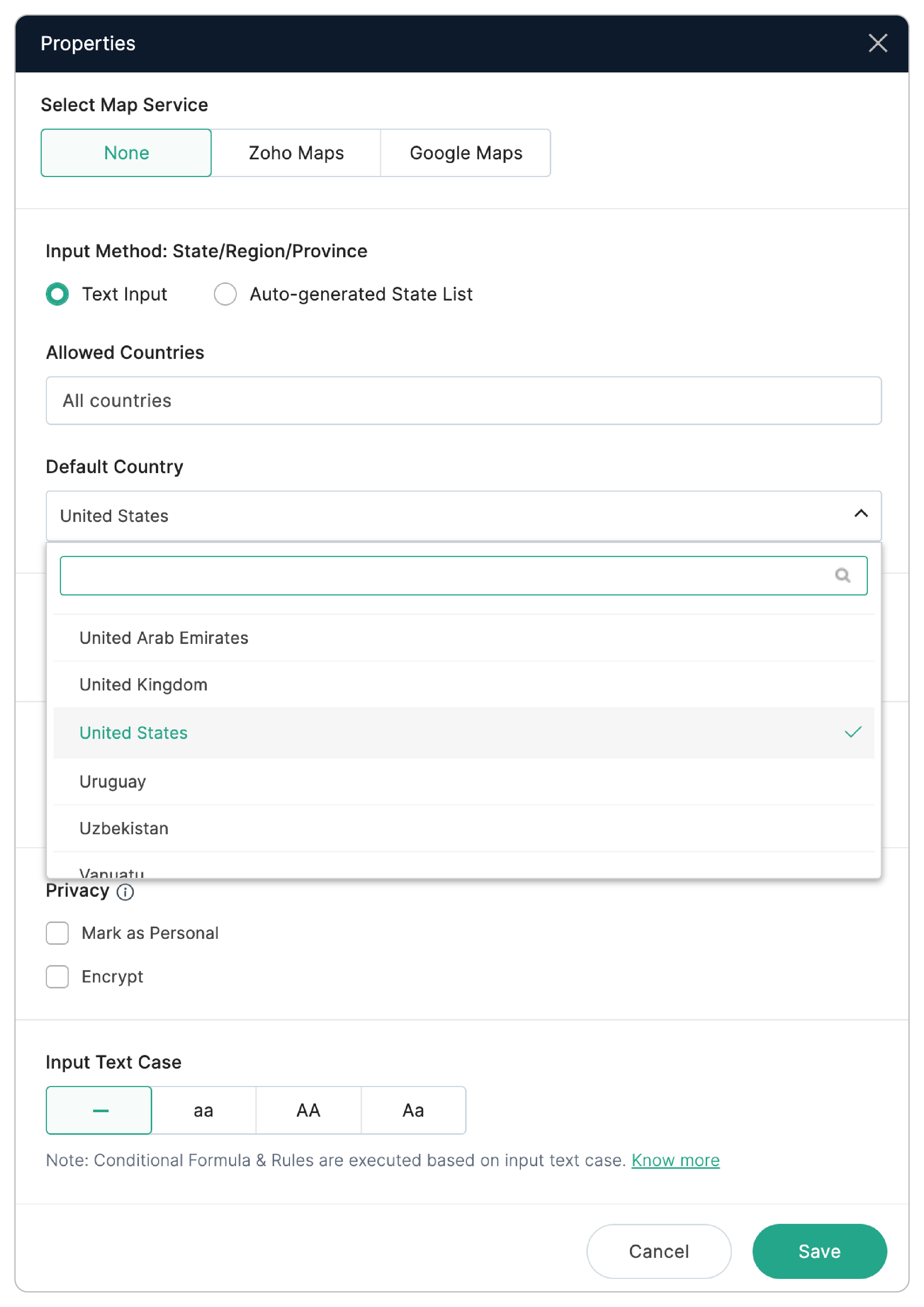 You can select the countries to be listed in the Country dropdown. For forms targeted at a specific audience, you can limit the Country dropdown to only include the countries that are relevant to that audience.