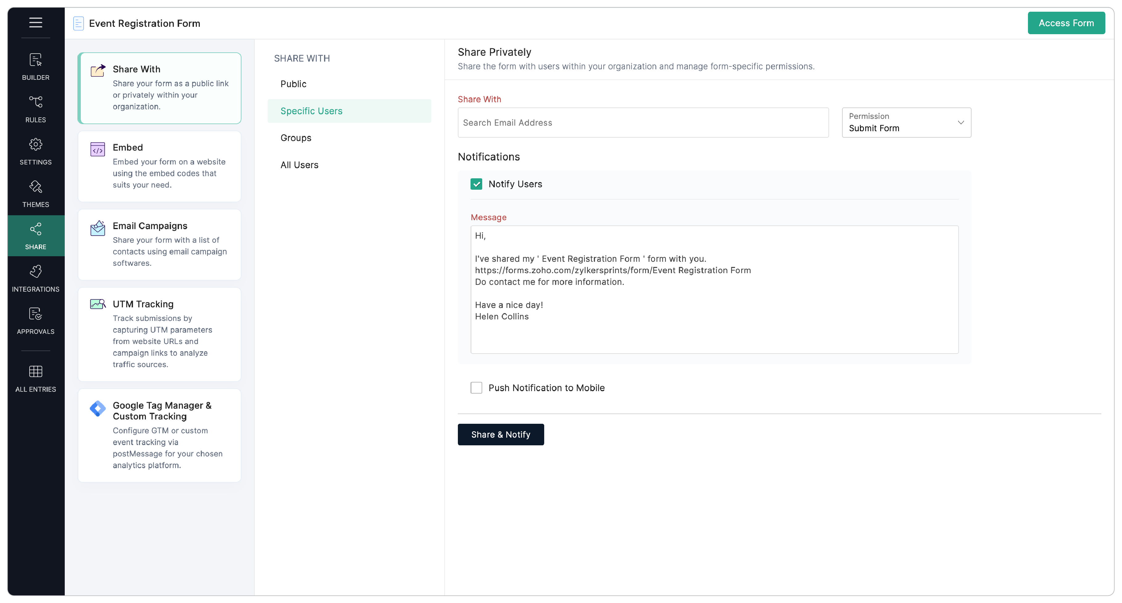 - To notify your users about the shared form via email, select the Notify Users option. You can change the default message which is provided with a link to the shared form.