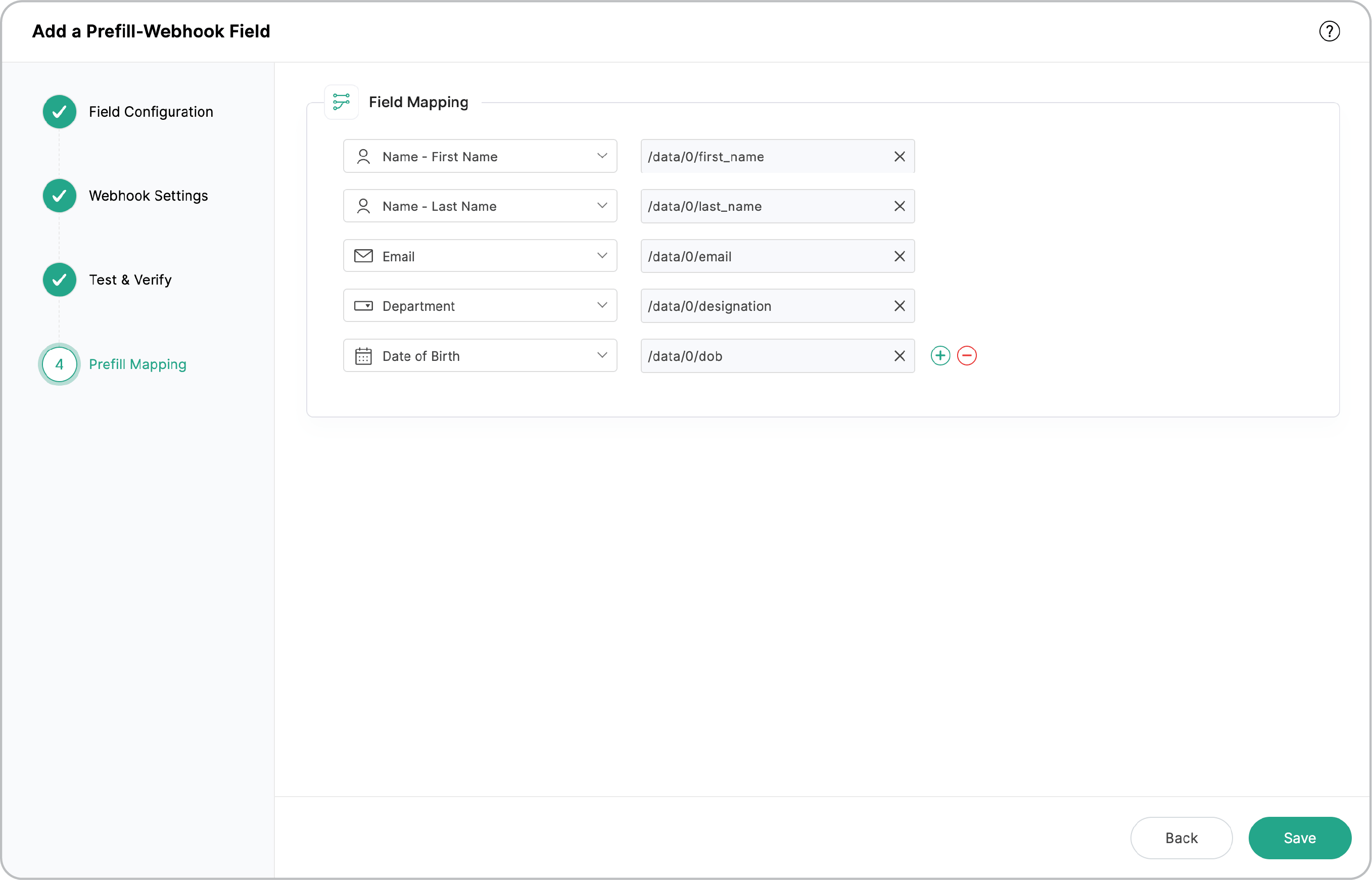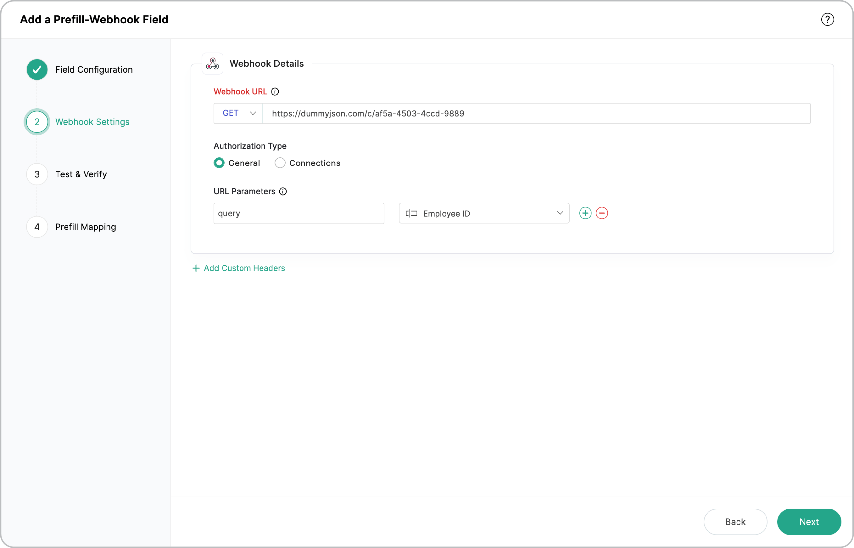 Open your form builder in Zoho Forms. Go to Prefill section and add a Prefill-Webhook field.