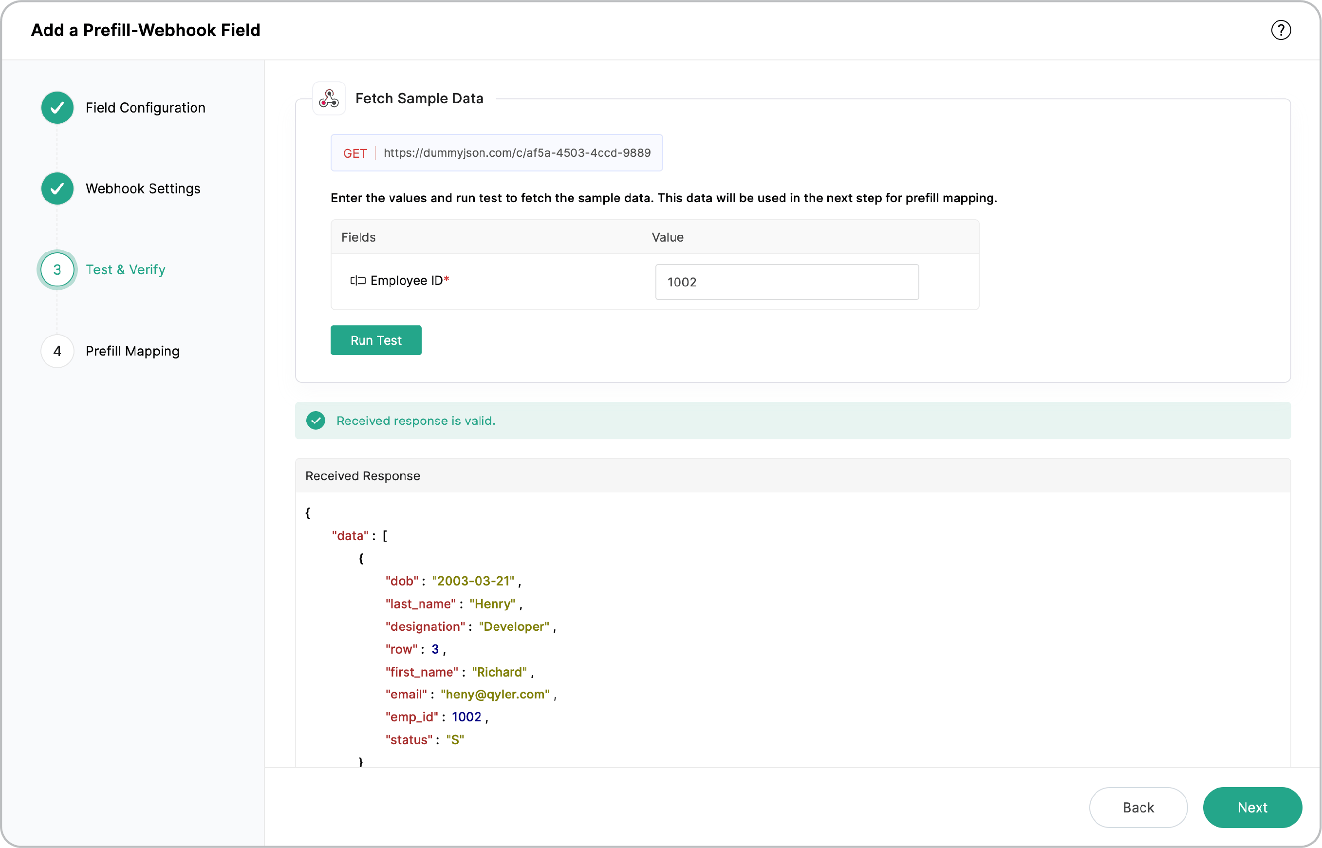 Test the webhook with search field value like 1002 and check if the received response is valid.