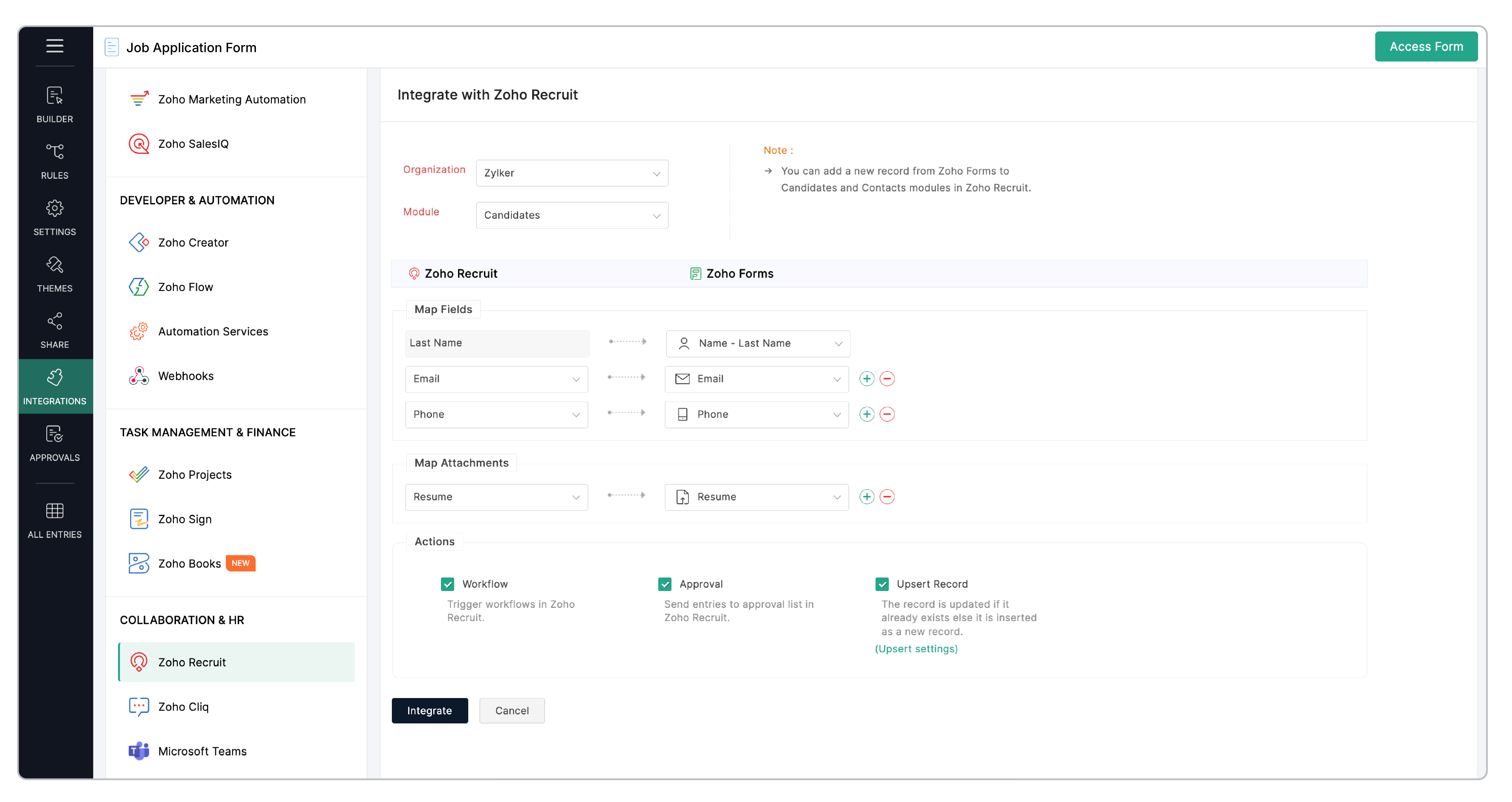 You can choose to trigger certain actions in Zoho Recruit each time a form entry is pushed to Zoho Recruit.