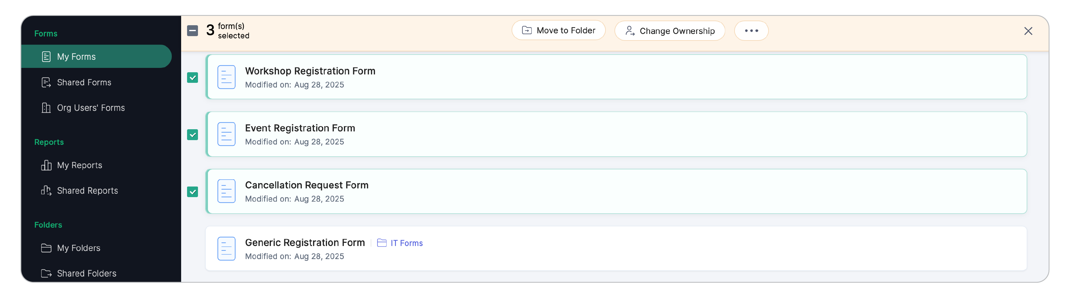 In some organizations, the forms are designed by dedicated developers and may be required to be used by other employees. In such scenarios, developers can create a form, configure the settings and once the form is ready, they can transfer the entire ownership to the intended user. The form owner or the super admin can transfer the form ownership from one user to another.