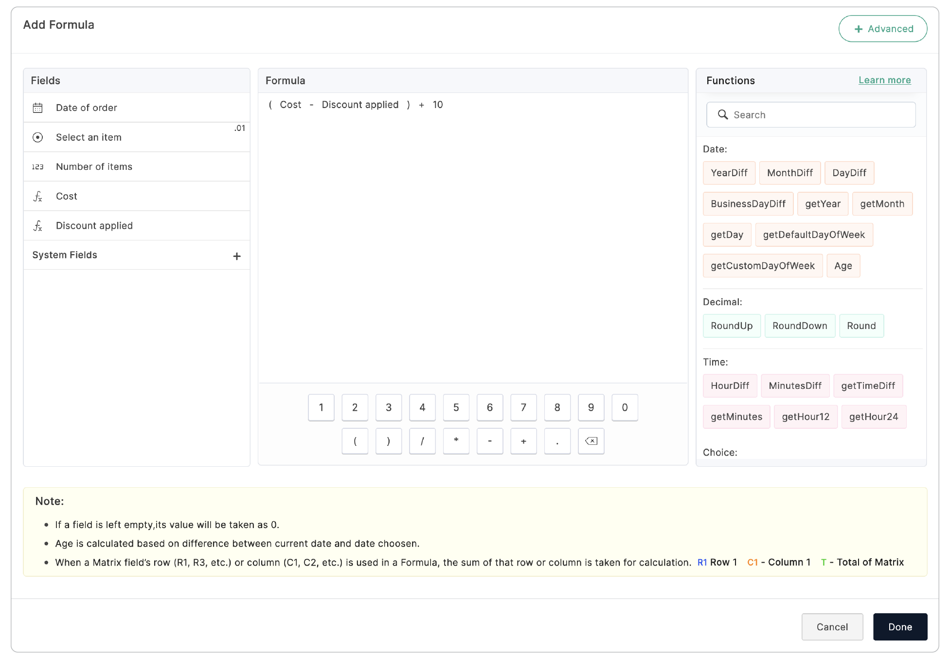 Overview Make your form a math wiz by allowing it to perform calculations. You can total up costs, process grade quizzes, apply discounts, and more! Use the Formula field to set up any form calculation. When your respondents fill in the form, ...