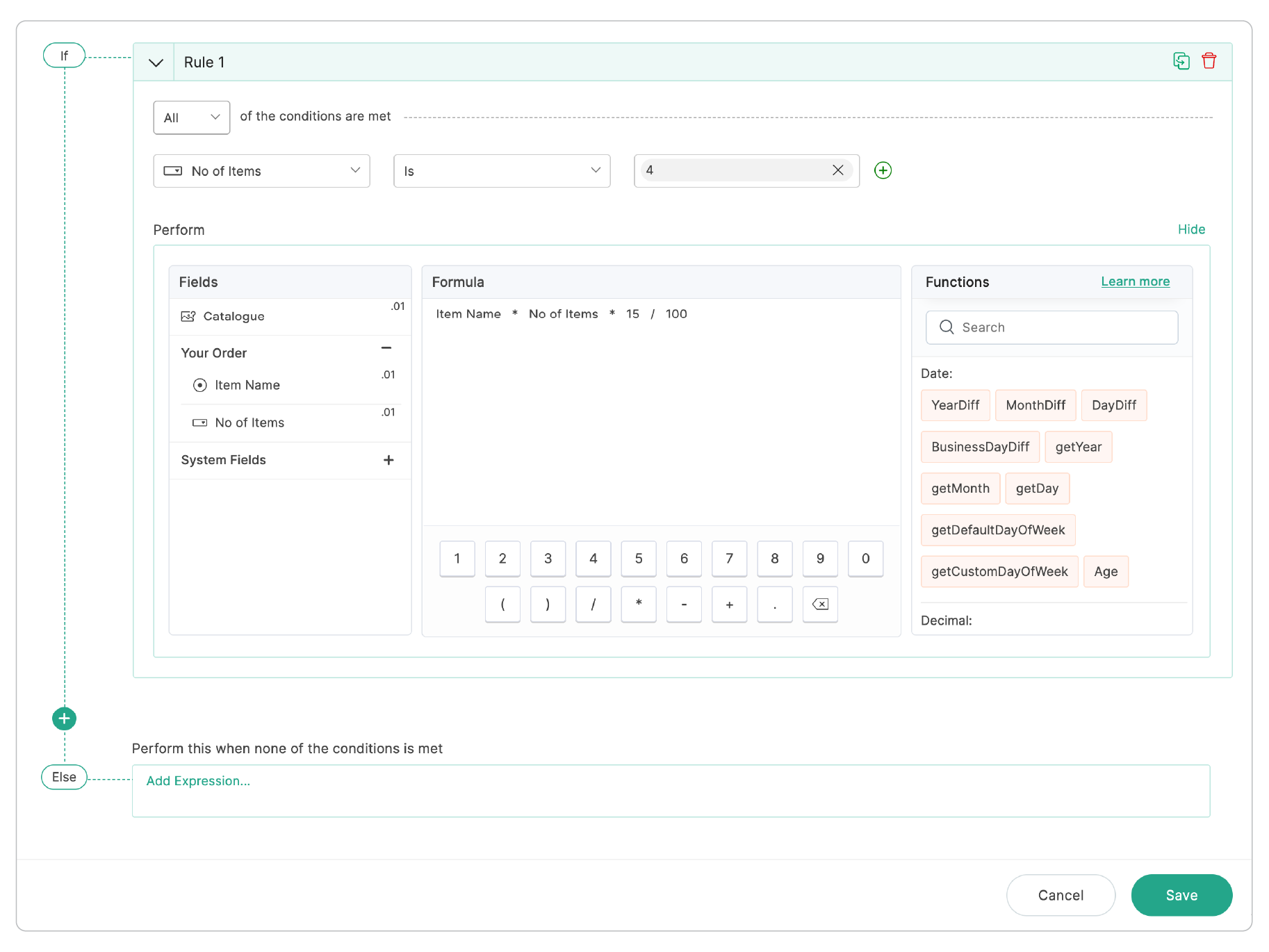 - Under Perform when none of the conditions is met, set up the formula that will be performed when none of the conditions is found to be true. This is also referred to as a default expression.