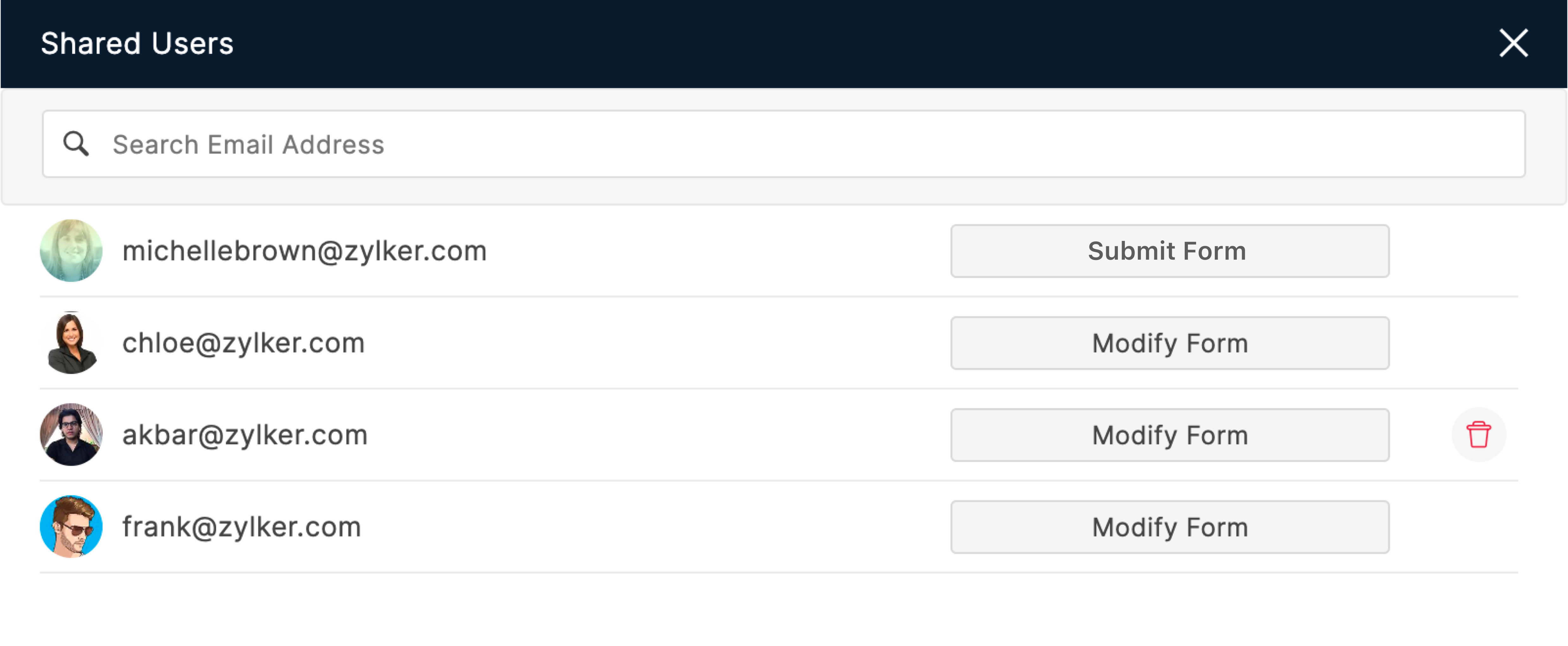 You can choose to share the form with a specific set of users in your organization with specific permissions. Zoho Forms allows you to grant the following permissions while sharing a form privately:
