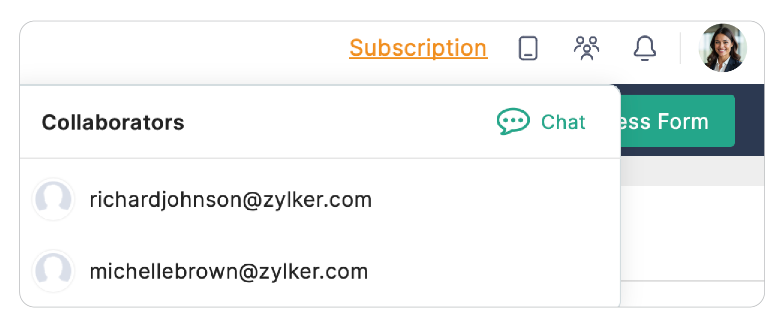 To start a group chat with the users having Modify Form / Modify Form, Entries, Reports permission, click the   icon in the top-right corner of your form builder and click Chat. A chat window with the name of the form including all the users having Modify Form/Modify Form, Entries, Reports permission will popup.