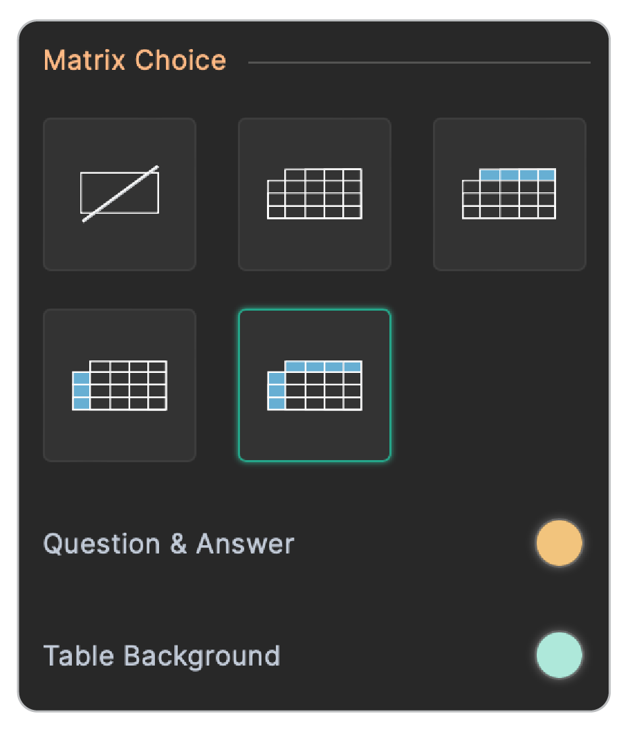 You can customize the overall appearance of the matrix choice by choosing the appropriate table style. Options to choose background colors for the