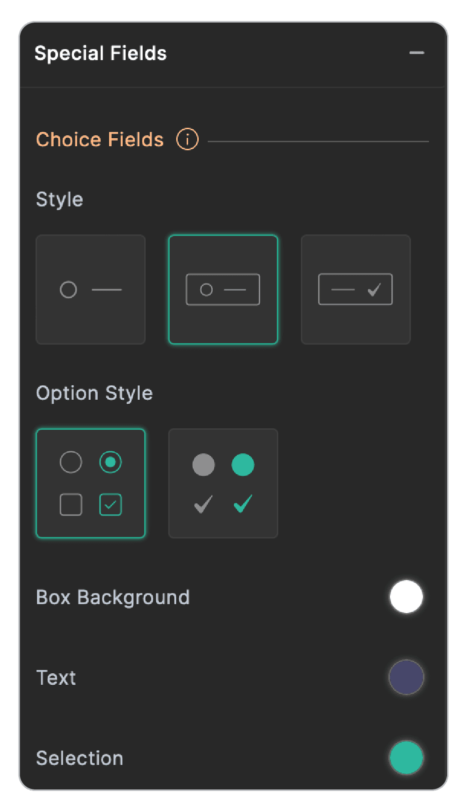 - Text: Text allows you to choose the color of the text associated with choice field options, to ensure readability against the background.