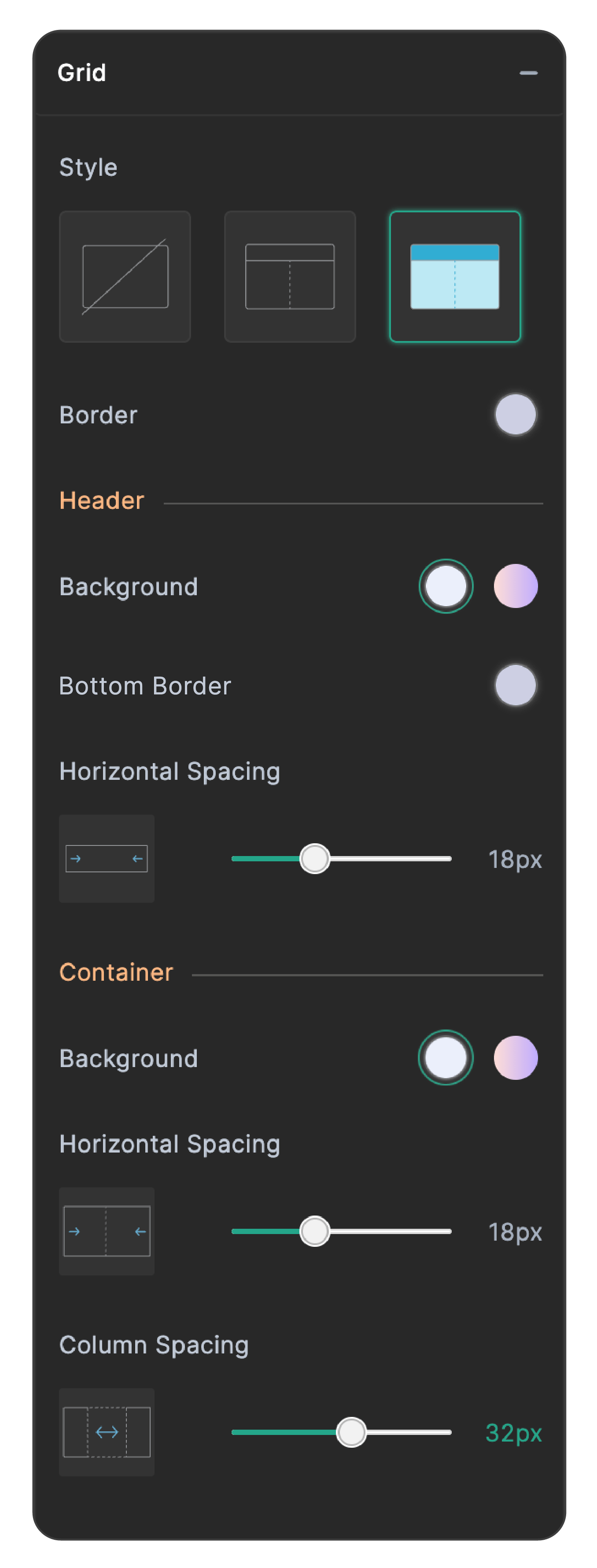 - Style 3: This style provides a background color to the Grid's header and container, in addition to the borders. Upon selecting this style, customization options are provided for the border color, header background color, header's bottom border color and container background.
