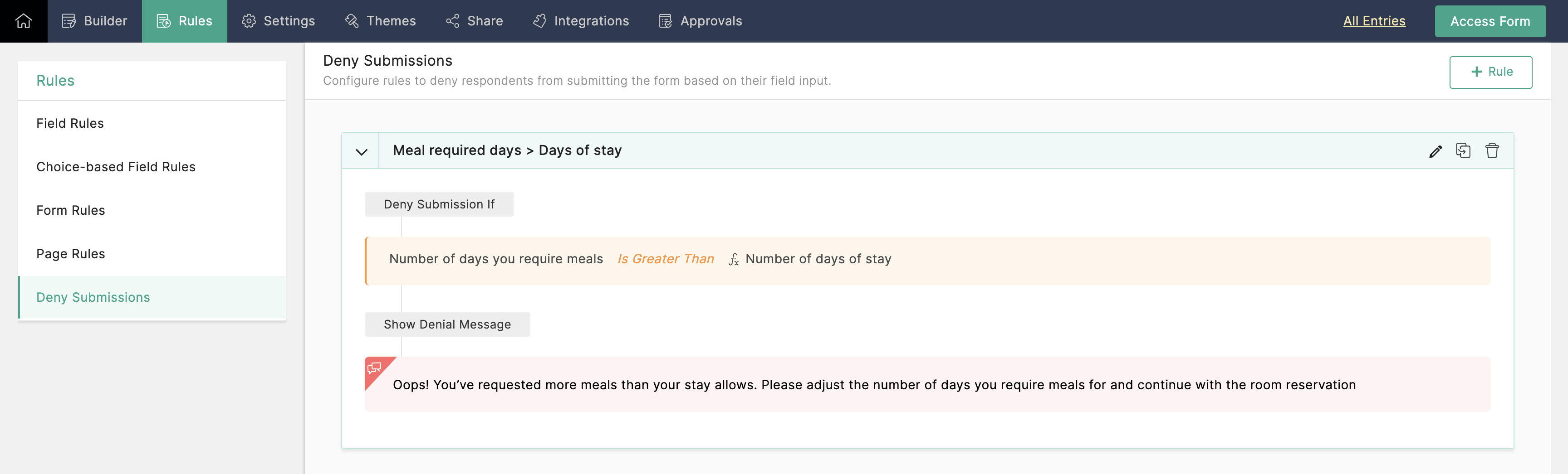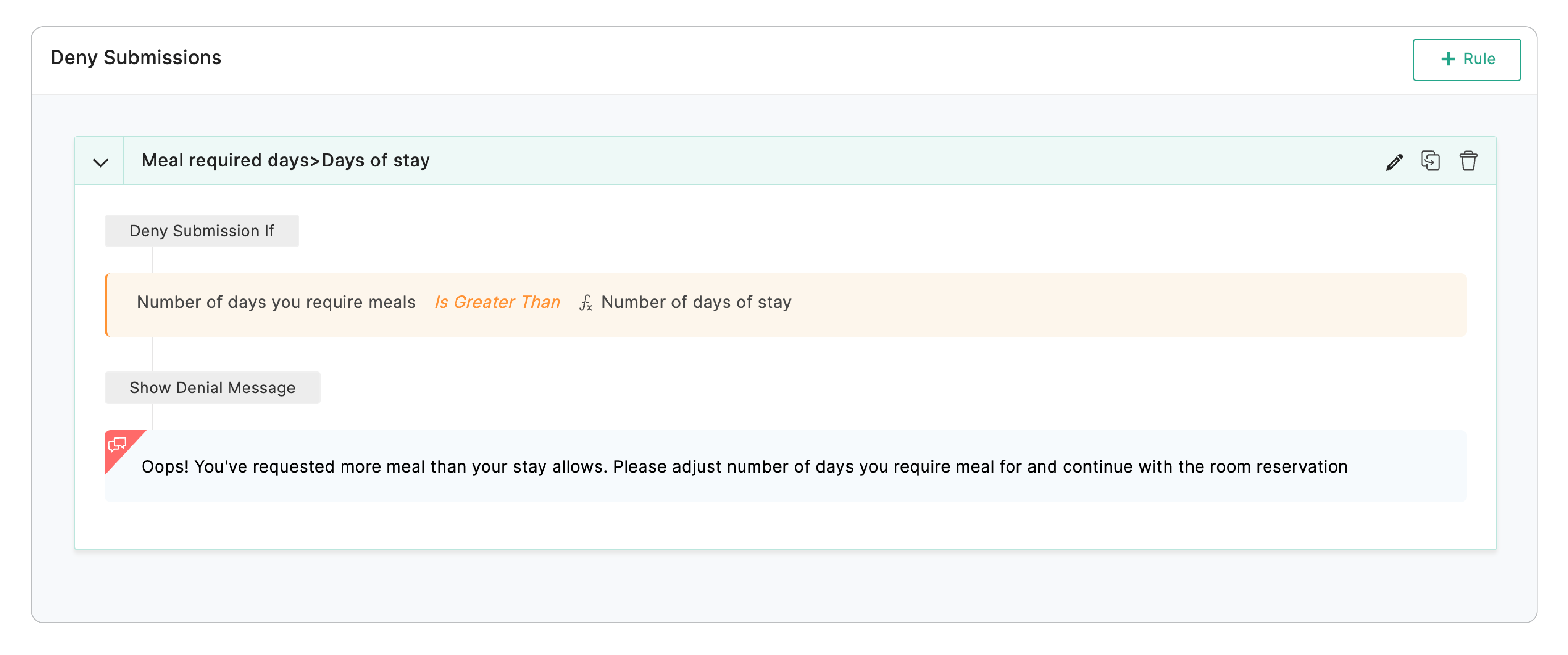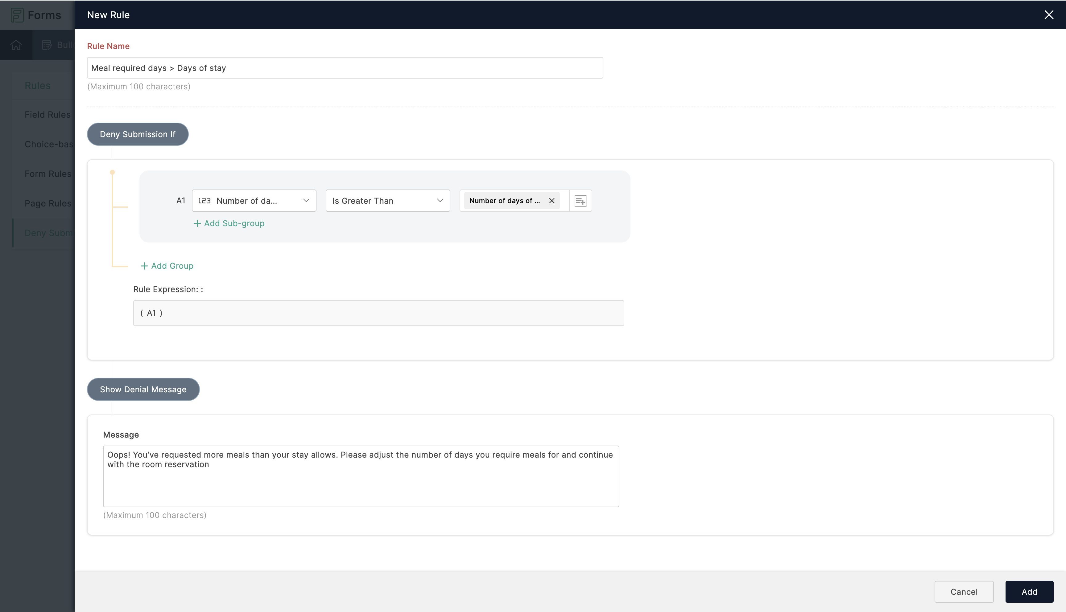 If Number of Days you require meals is greater than Number of days of stay (select the Formula field), then show the denial message.