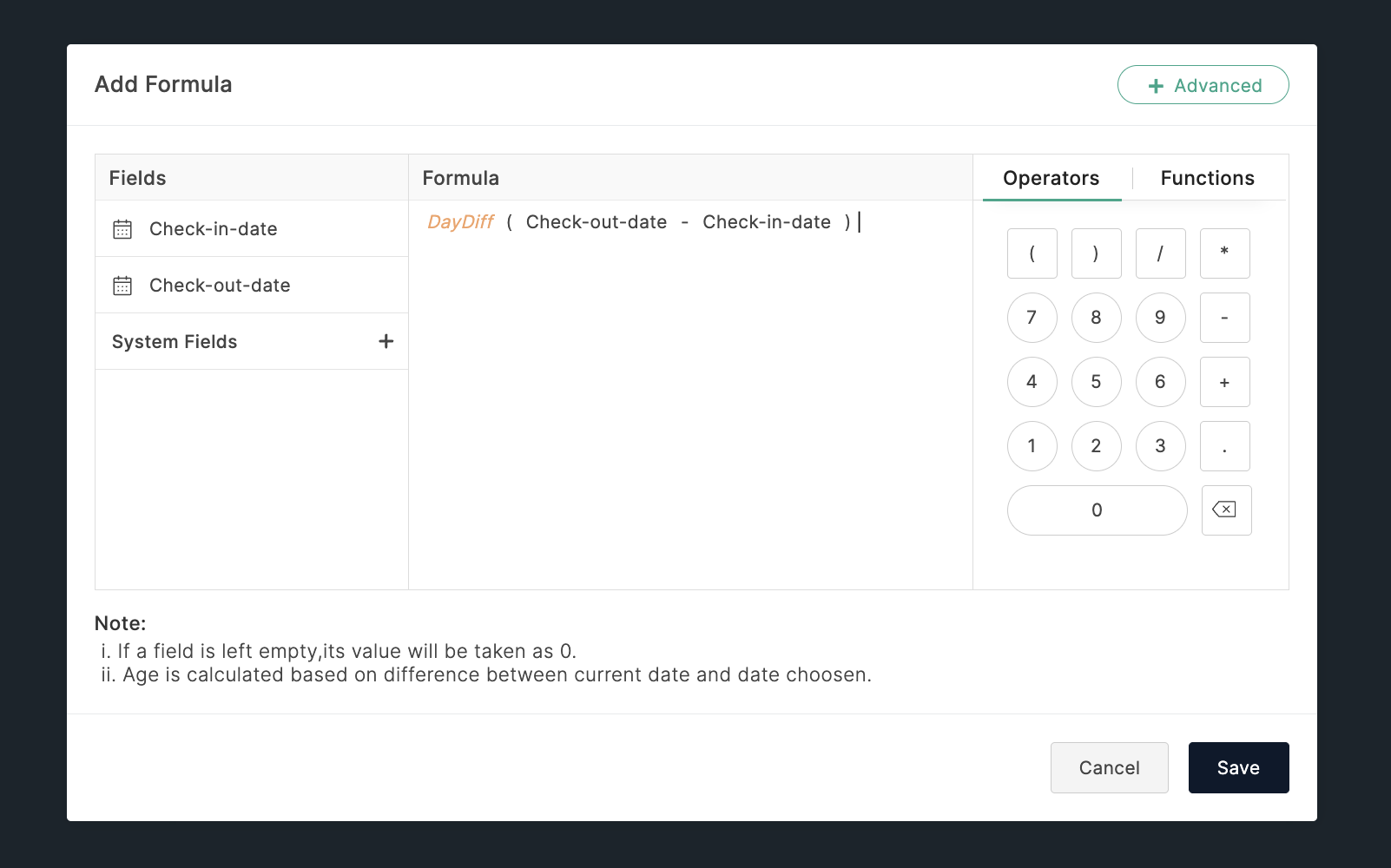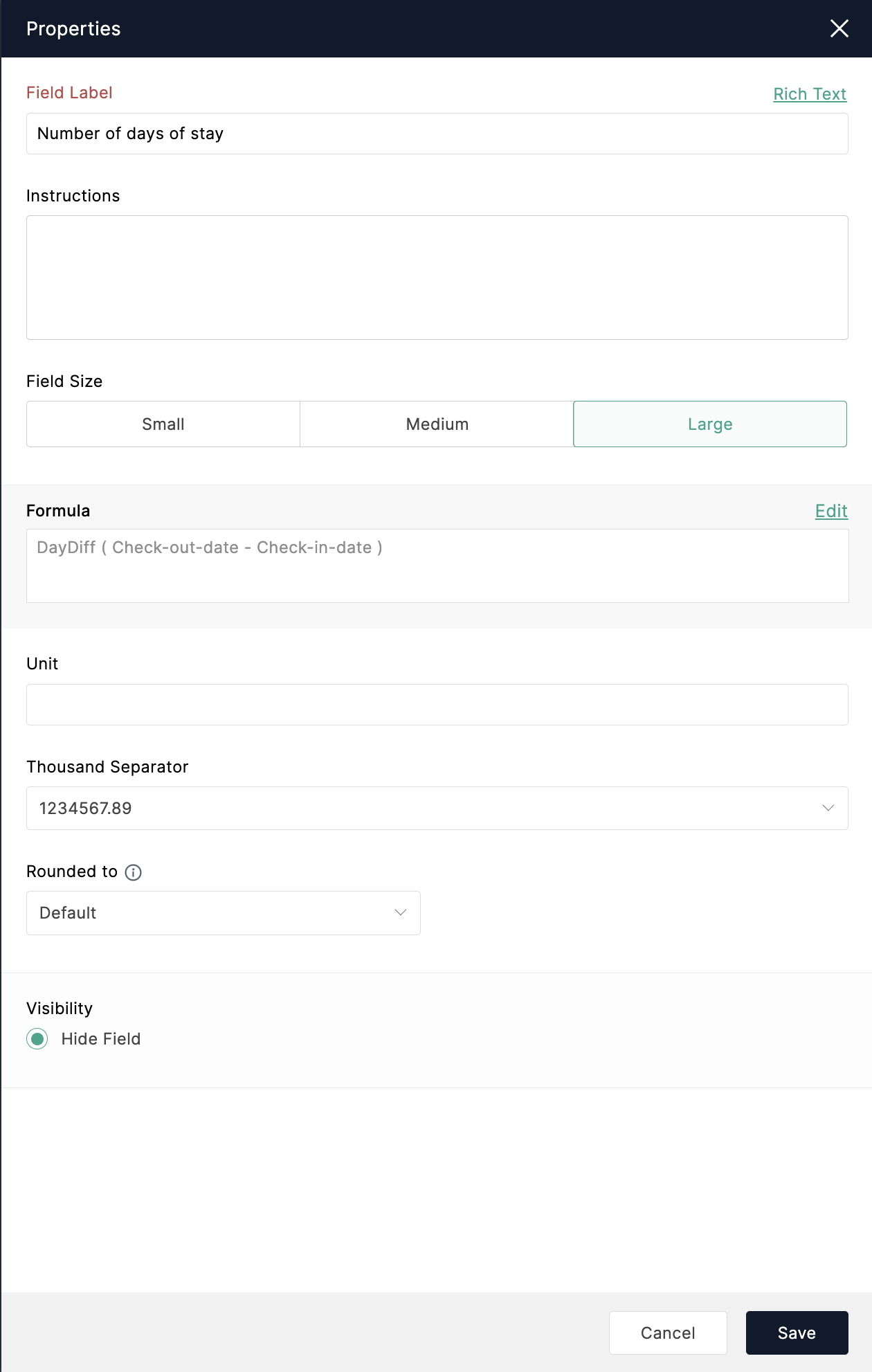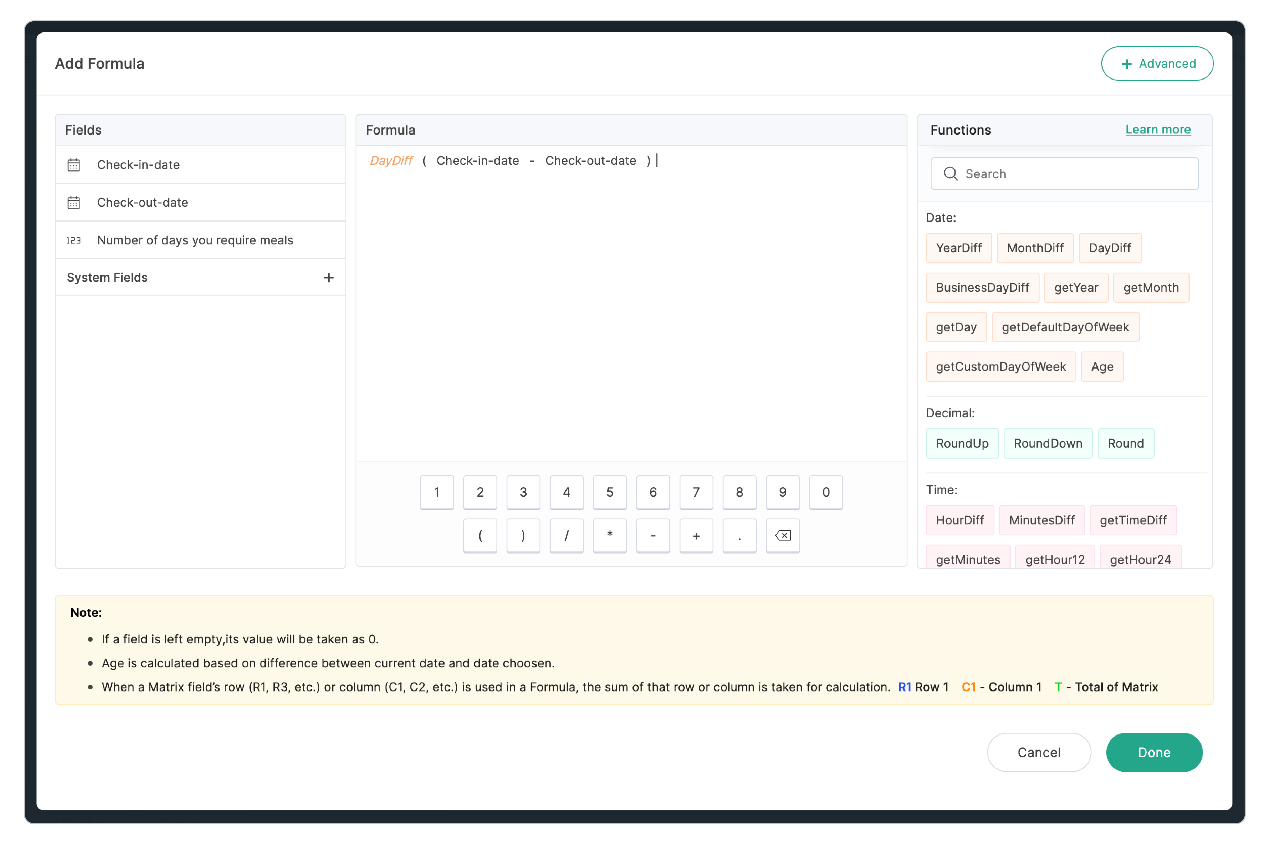 If Number of Days you require meals is greater than Number of days of stay (select the Formula field), then show the denial message.