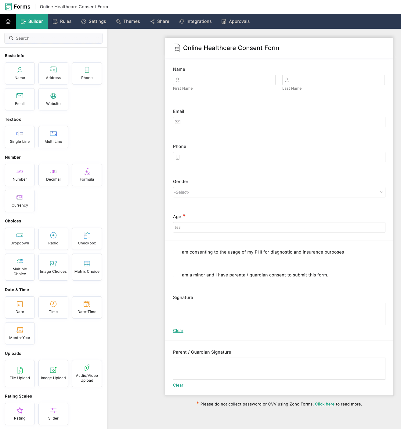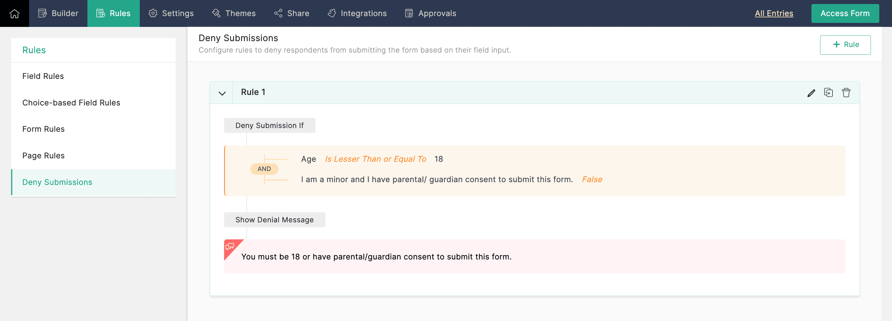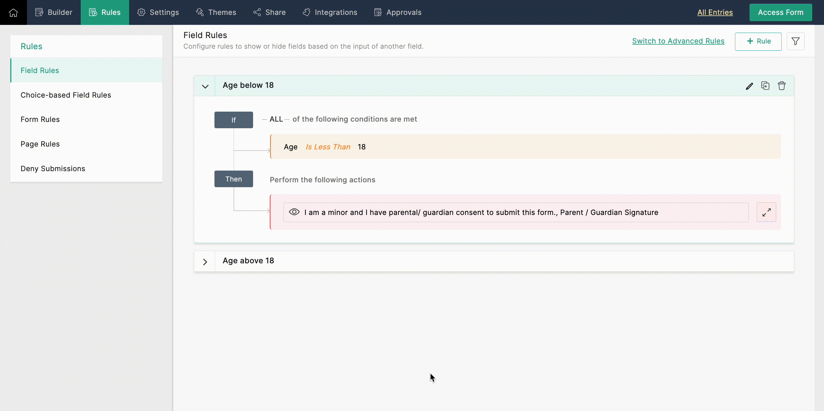 At EverCare Clinic, Lisa, the clinic’s digital administrator, is tasked with setting up an online healthcare consent form using Zoho Forms. The clinic has a strict policy: anyone under the age of 18 must have parental or guardian consent to submit a form.