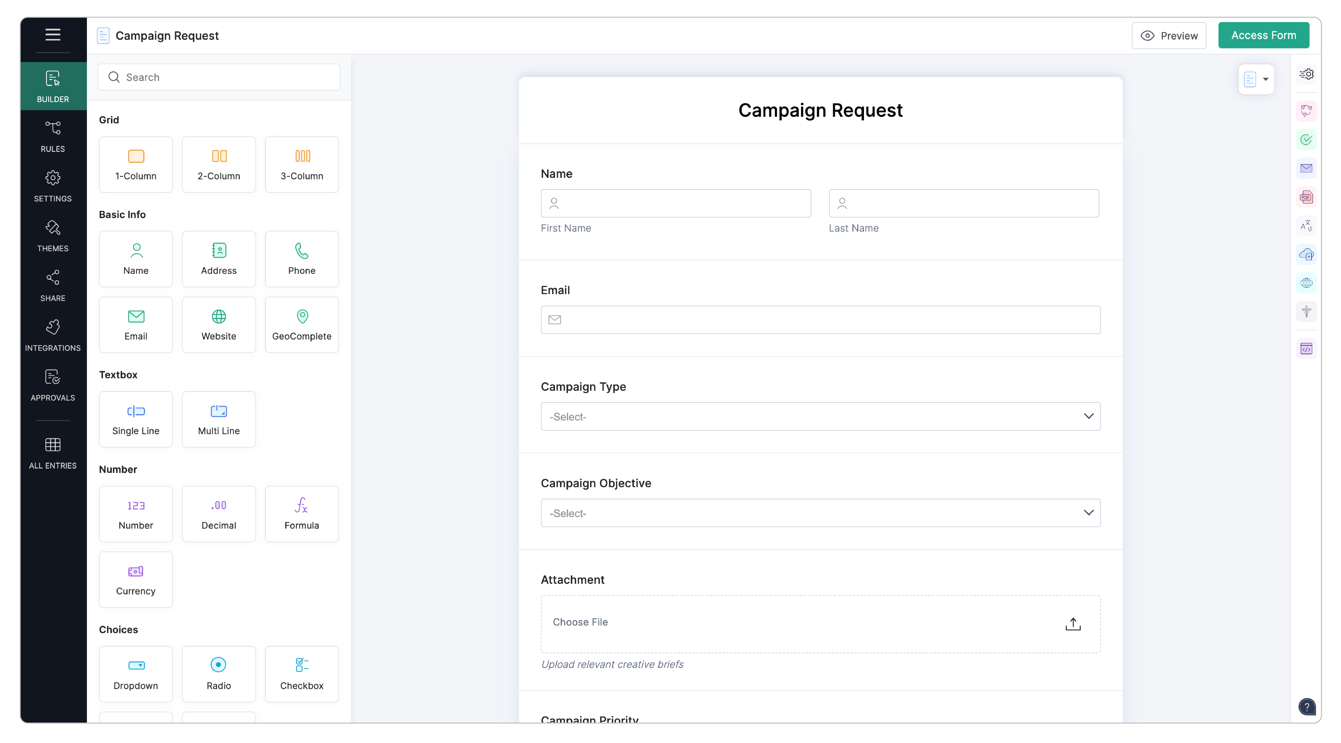 Zylker created a form with fields such as name, email, a dropdown field for Campaign Type, and Campaign Objective, a file upload field for Attachment related to campaign and a radio field for getting the Campaign Priority.