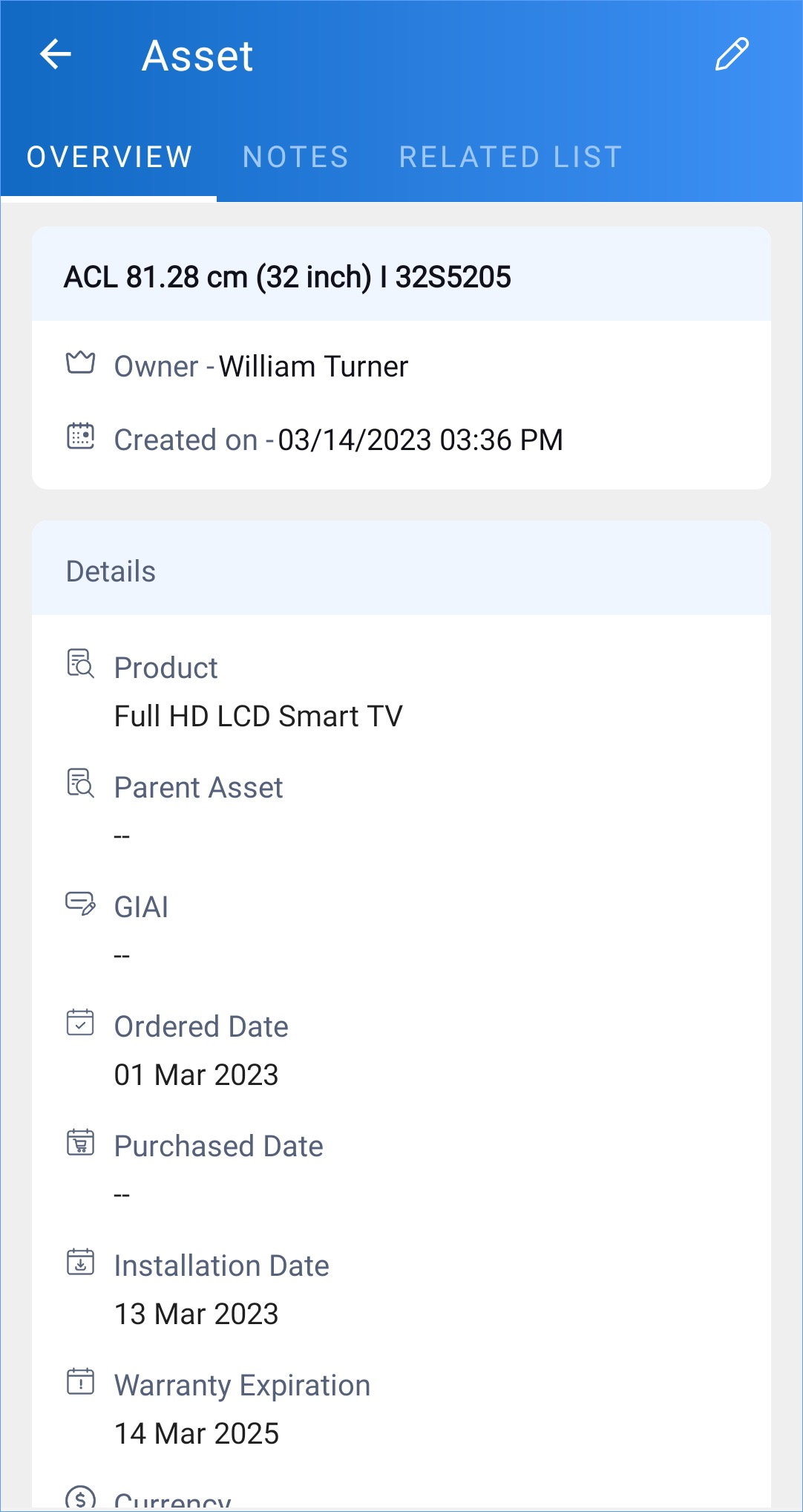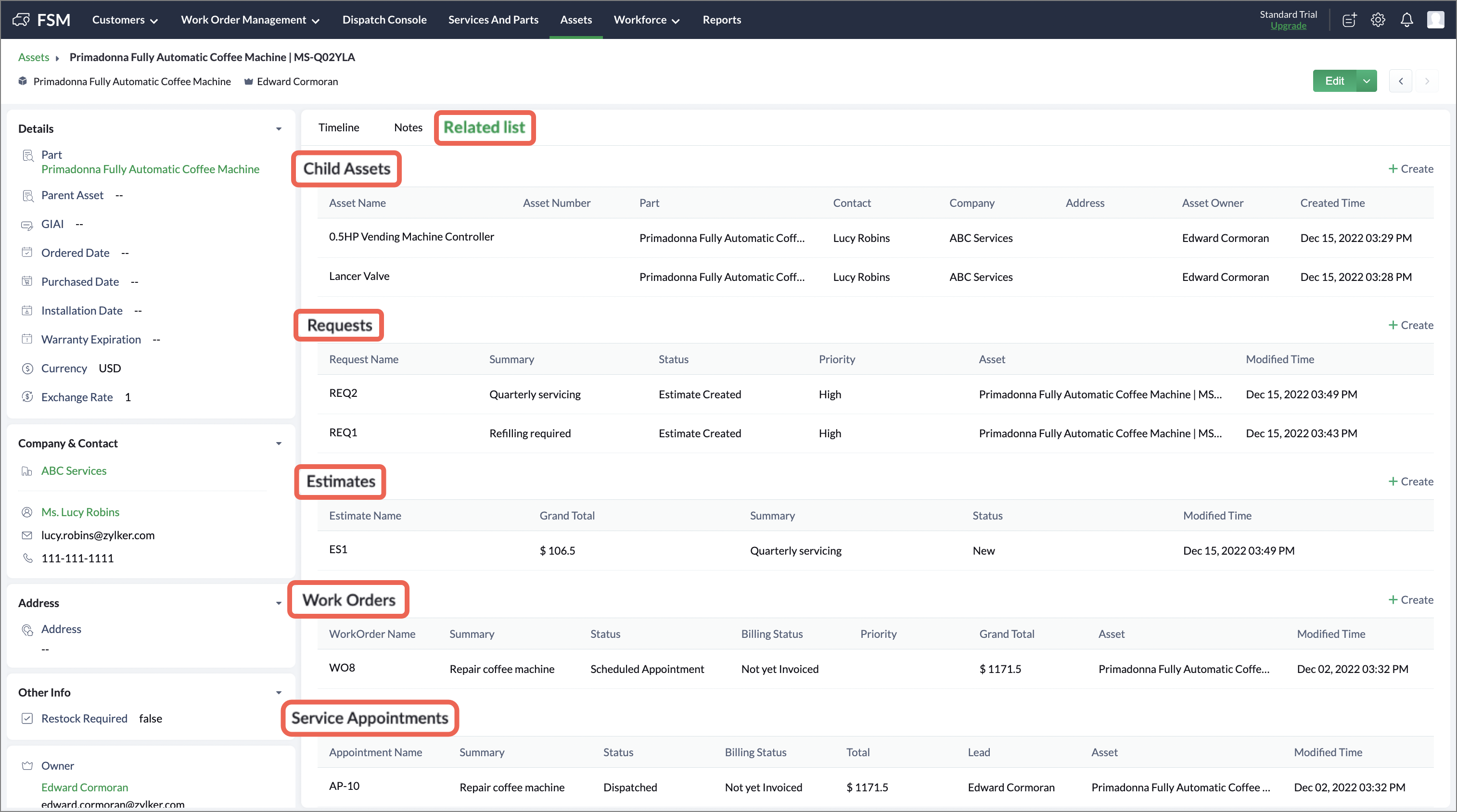 Child Assets, Requests, Estimates, Work Orders, and Service Appointments can be created for an asset. These details can be found under the Related List tab of the Assets View page.