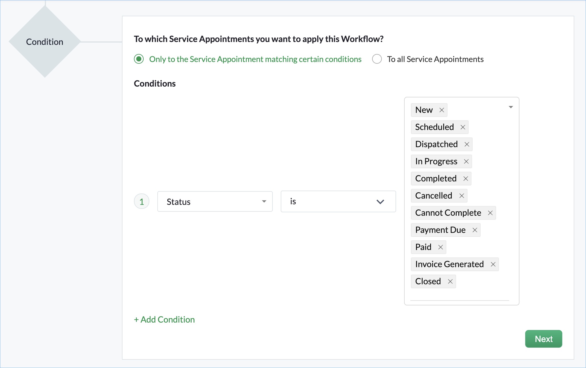 - Select the rule criteria as Only to the Service Appointment matching certain conditions and add a condition as shown below. Click Next.