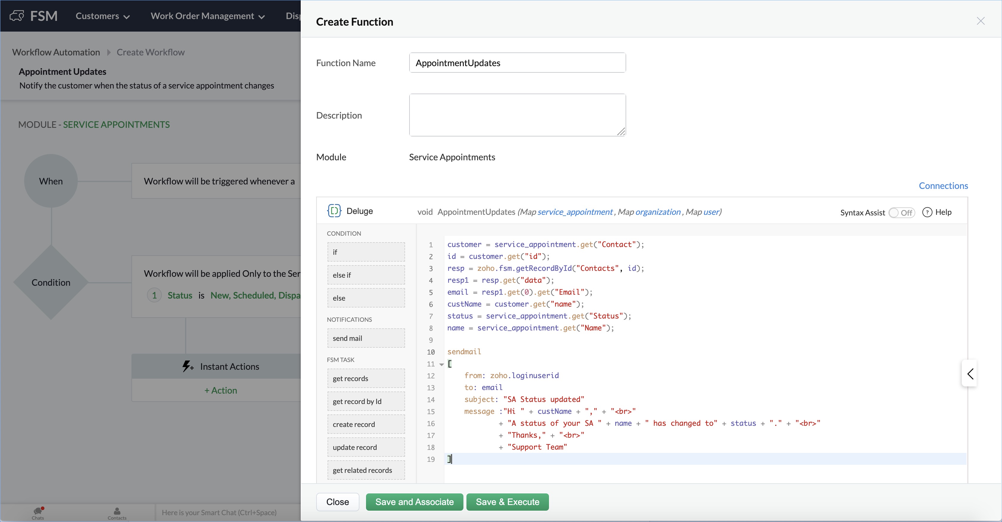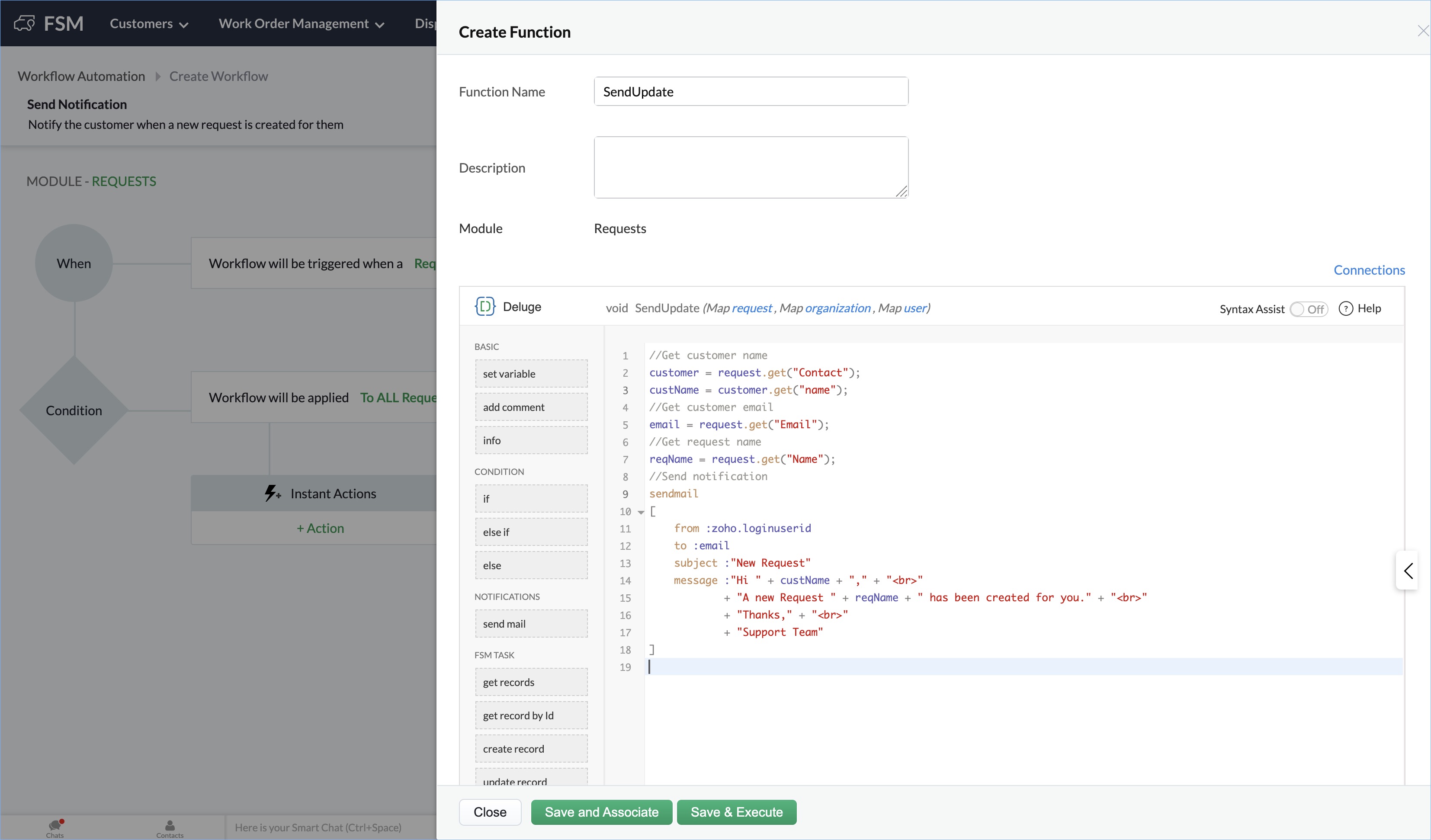 - Enter a Function Name and add the function in the Deluge Script Editor. Click Save and Associate to add the function.