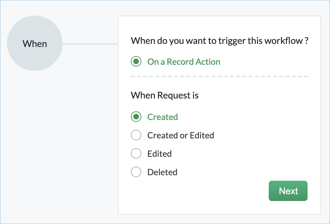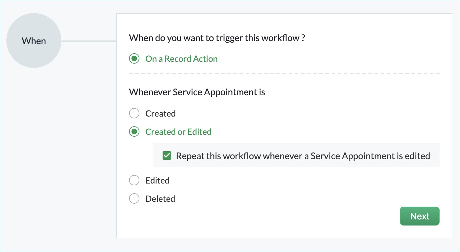 Specify when and on what conditions the workflow rule should be triggered for a record. Workflow rules can be triggered when records are created, edited, created/edited, or deleted. Workflow rules are executed when one of the following record actions occurs: