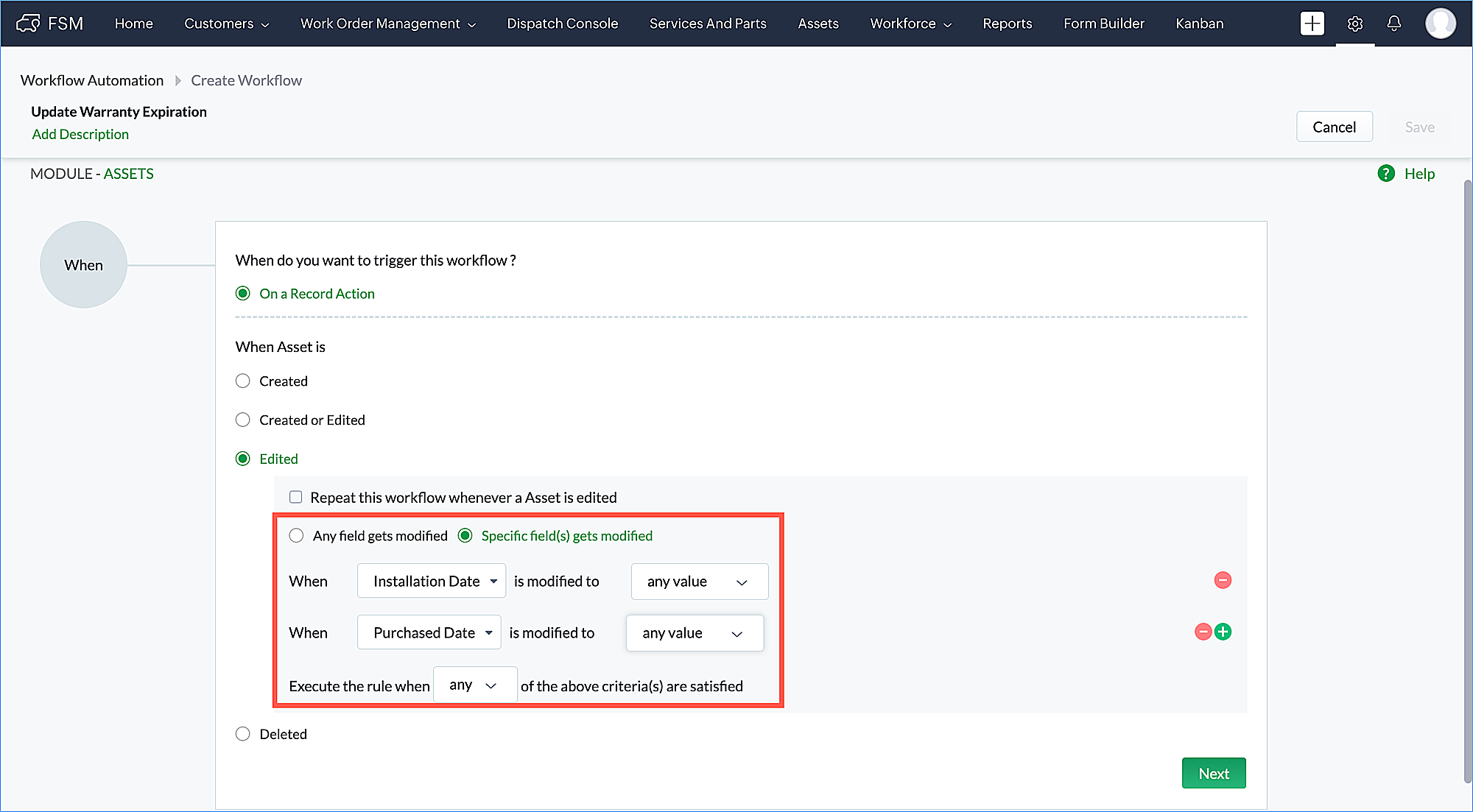 Here is an example for the rule trigger based on field modification. If the Installation Date or Purchased Date of an asset is modified, then the Warranty Expiration of the asset should be modified accordingly. A workflow rule can be created whose rule trigger uses conditions based on field updates (refer to the screenshot below).