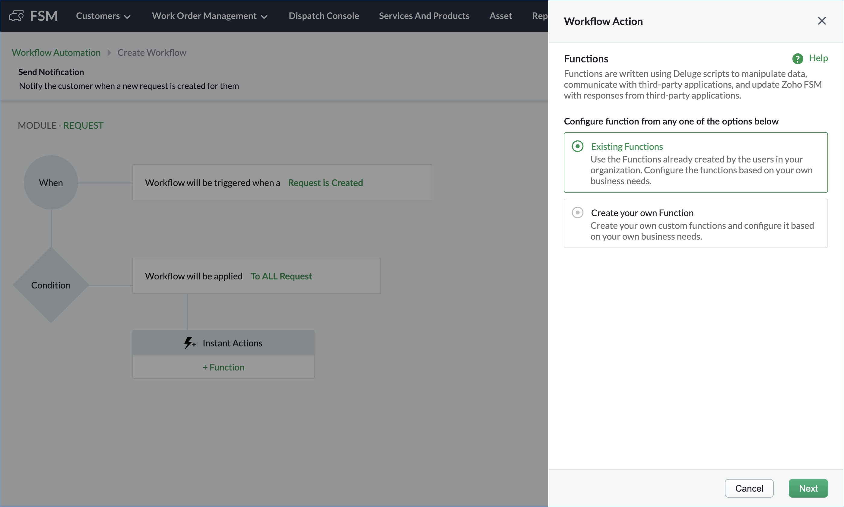 Custom Function: This is a program used for formulating processes, defining business logic and automating repetitive tasks. For example, notifying the customer when a new request is created for them.