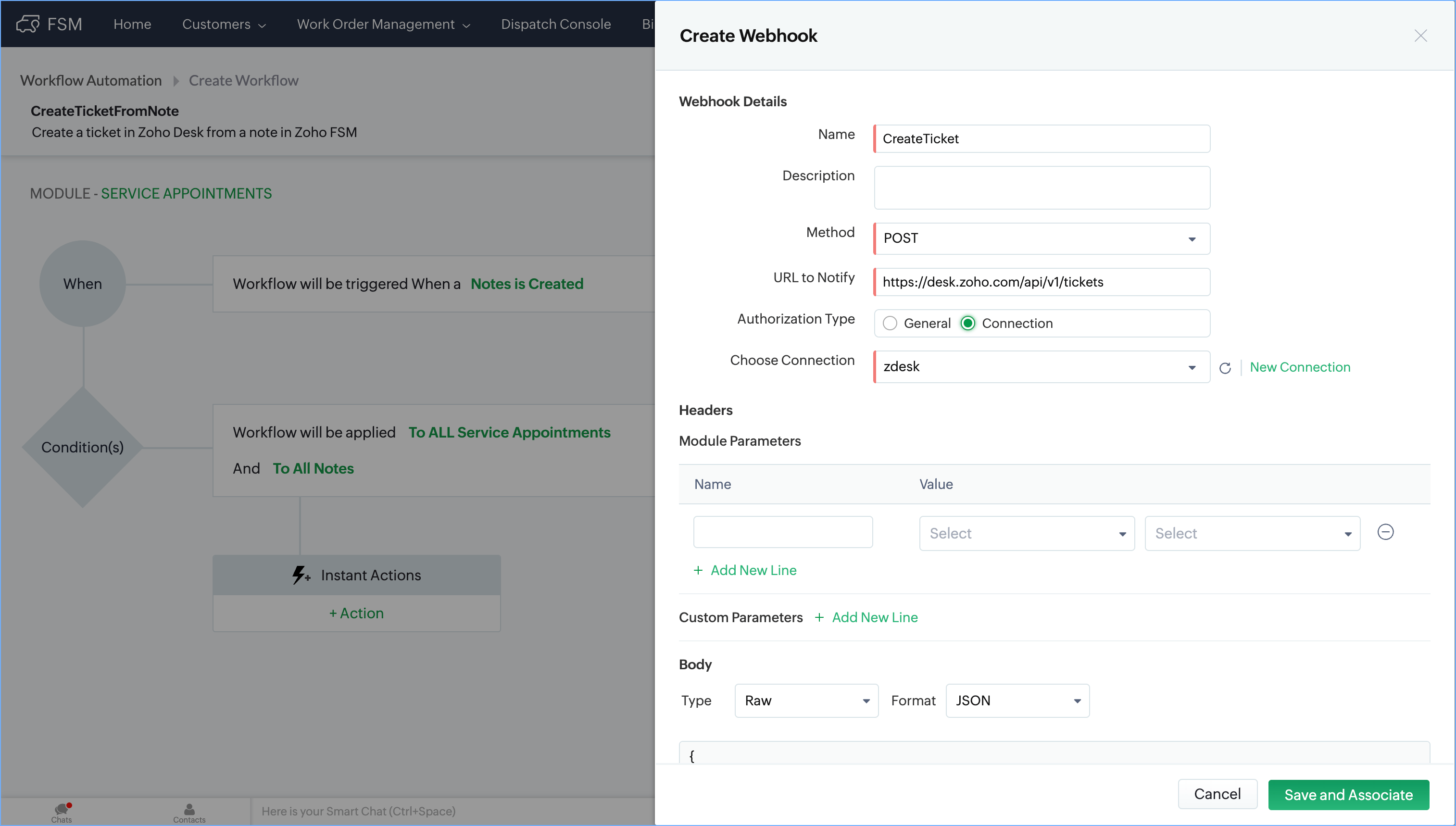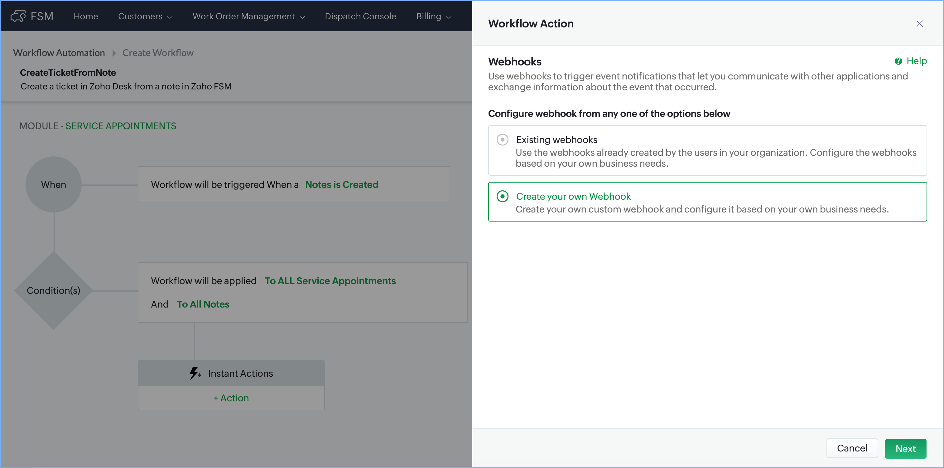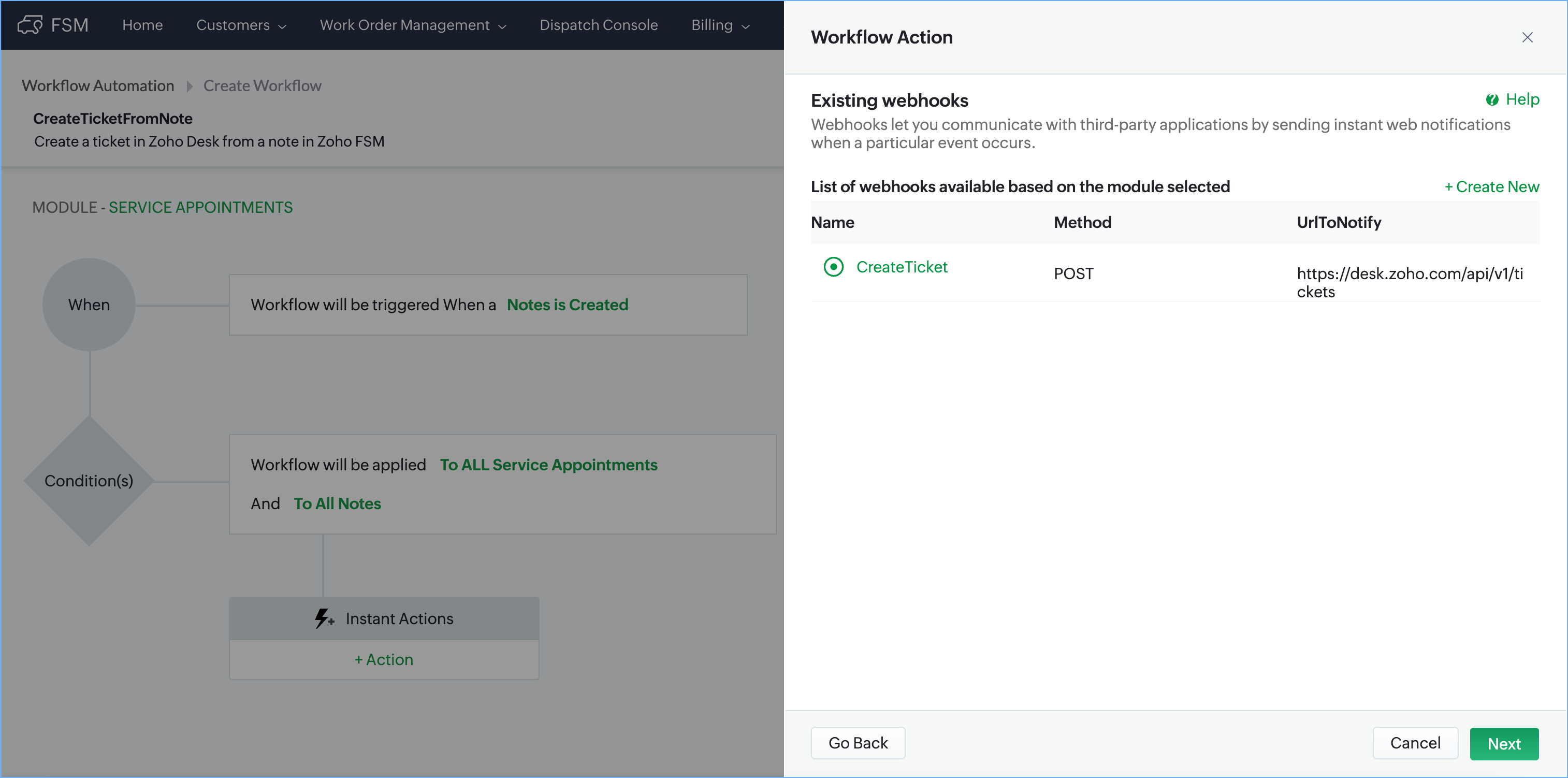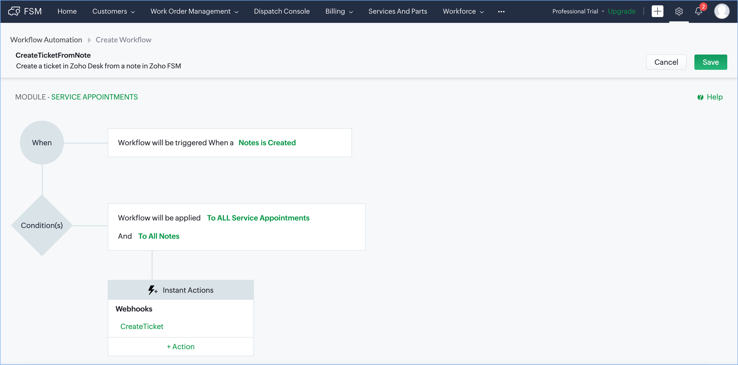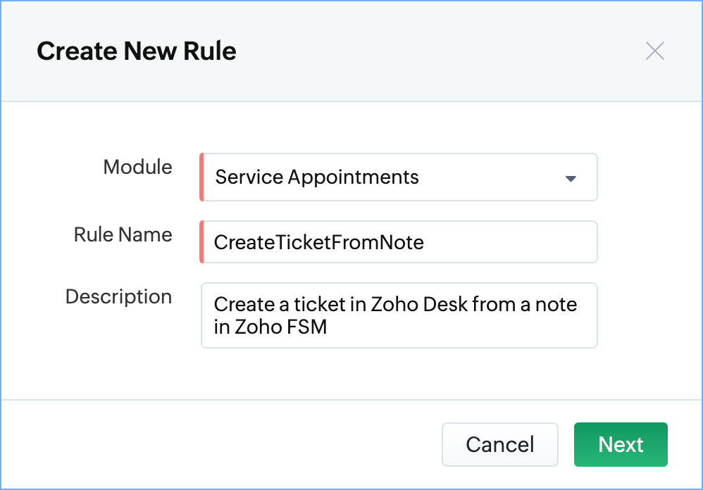 A sample workflow rule has been used to explain the steps involved in creating one. This workflow will create a ticket in Zoho Desk from a note in Zoho FSM. Here, we are assuming that Zoho FSM and Zoho Desk are integrated.