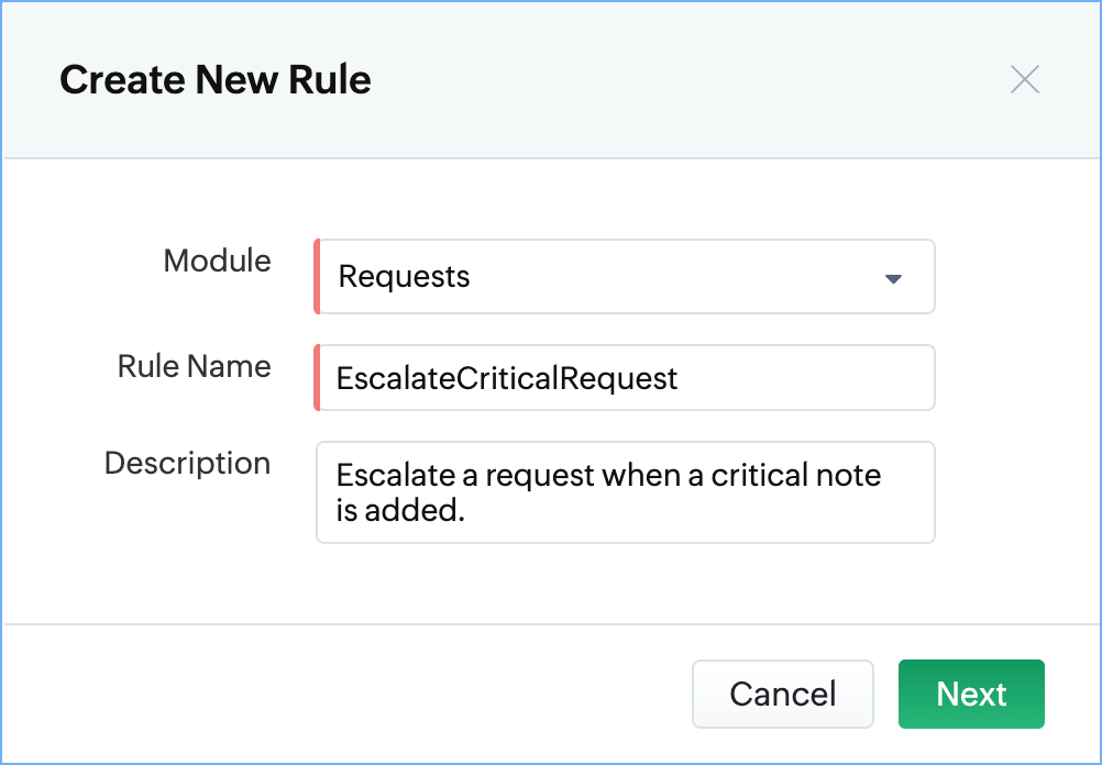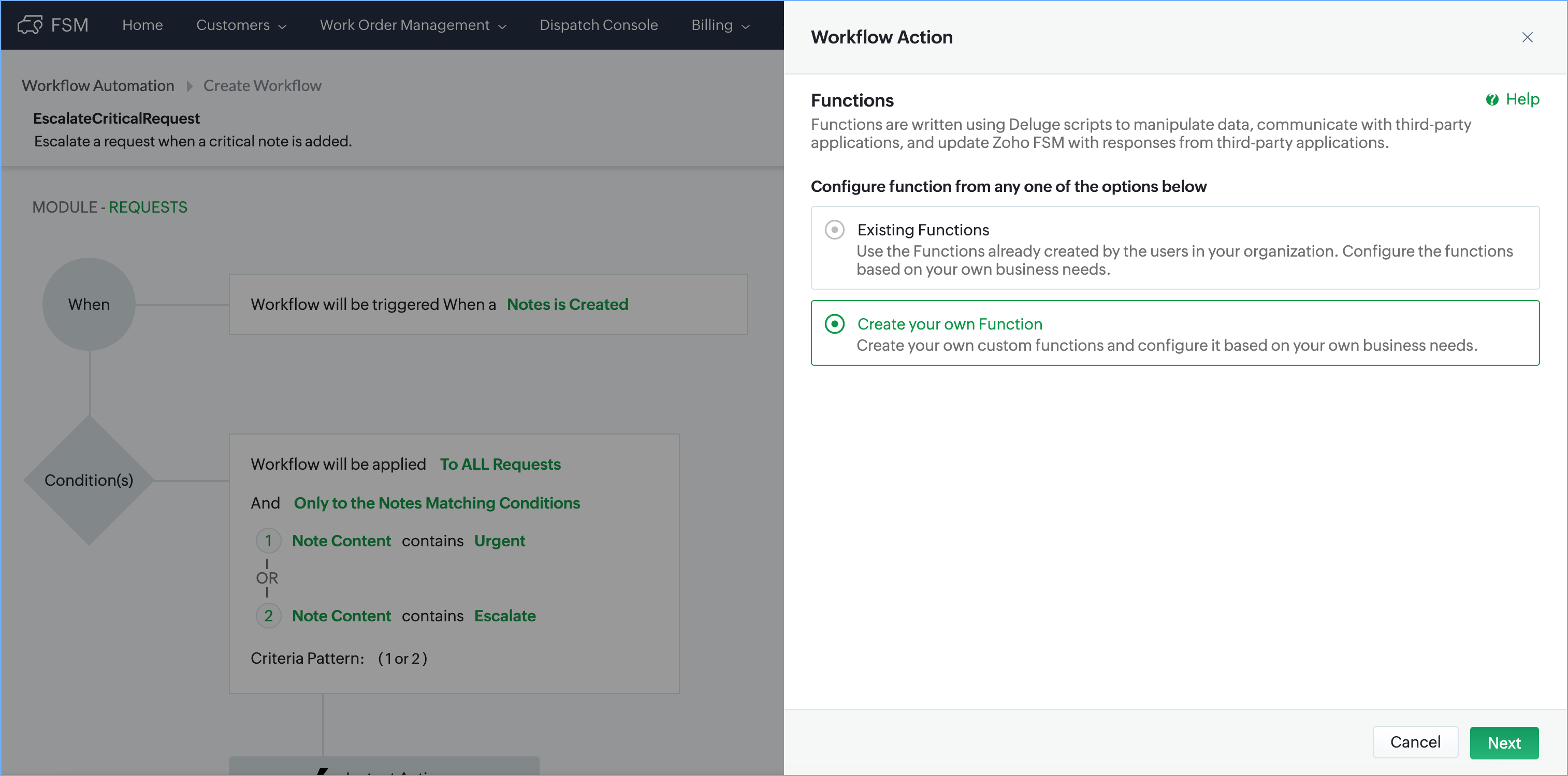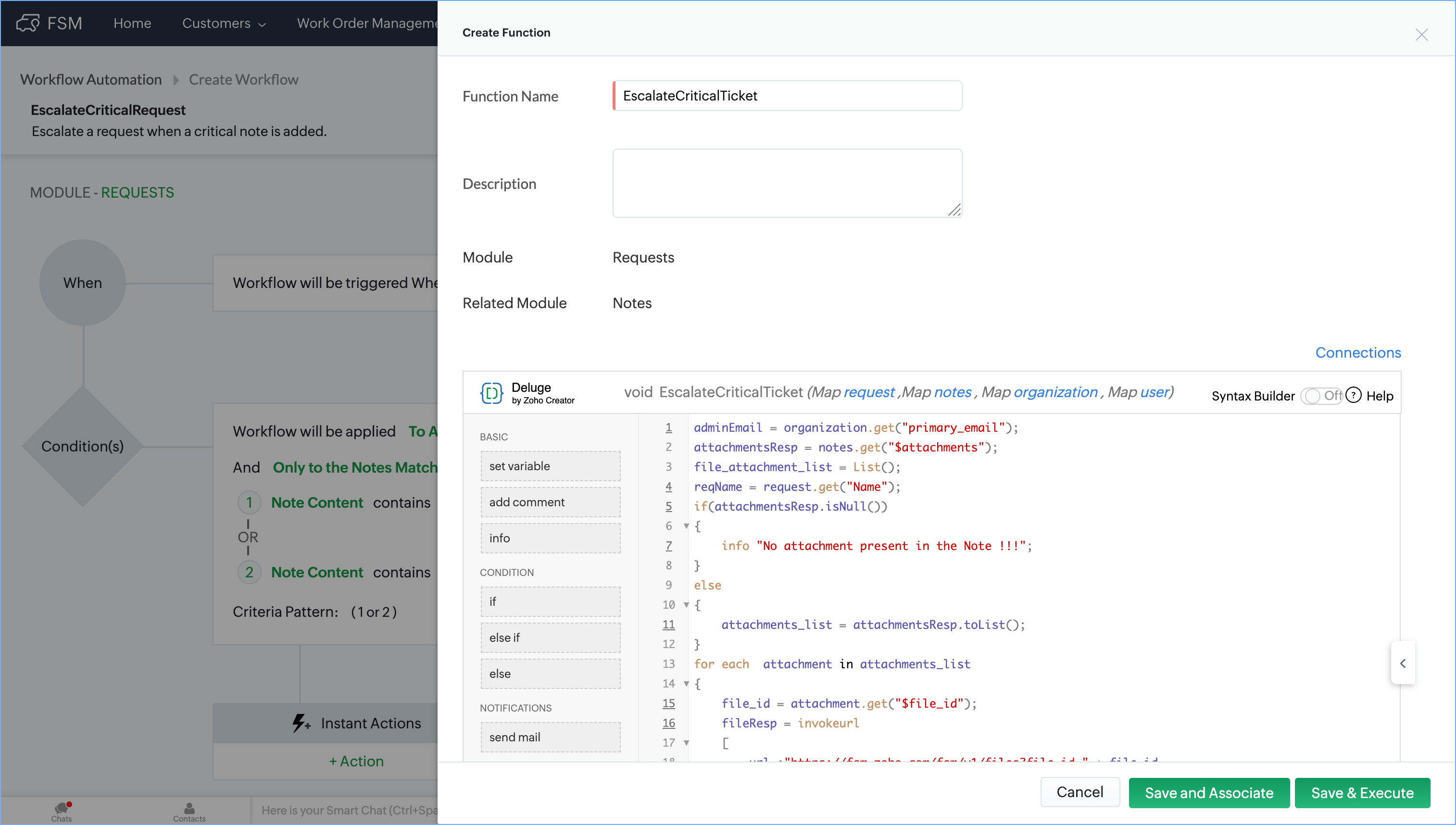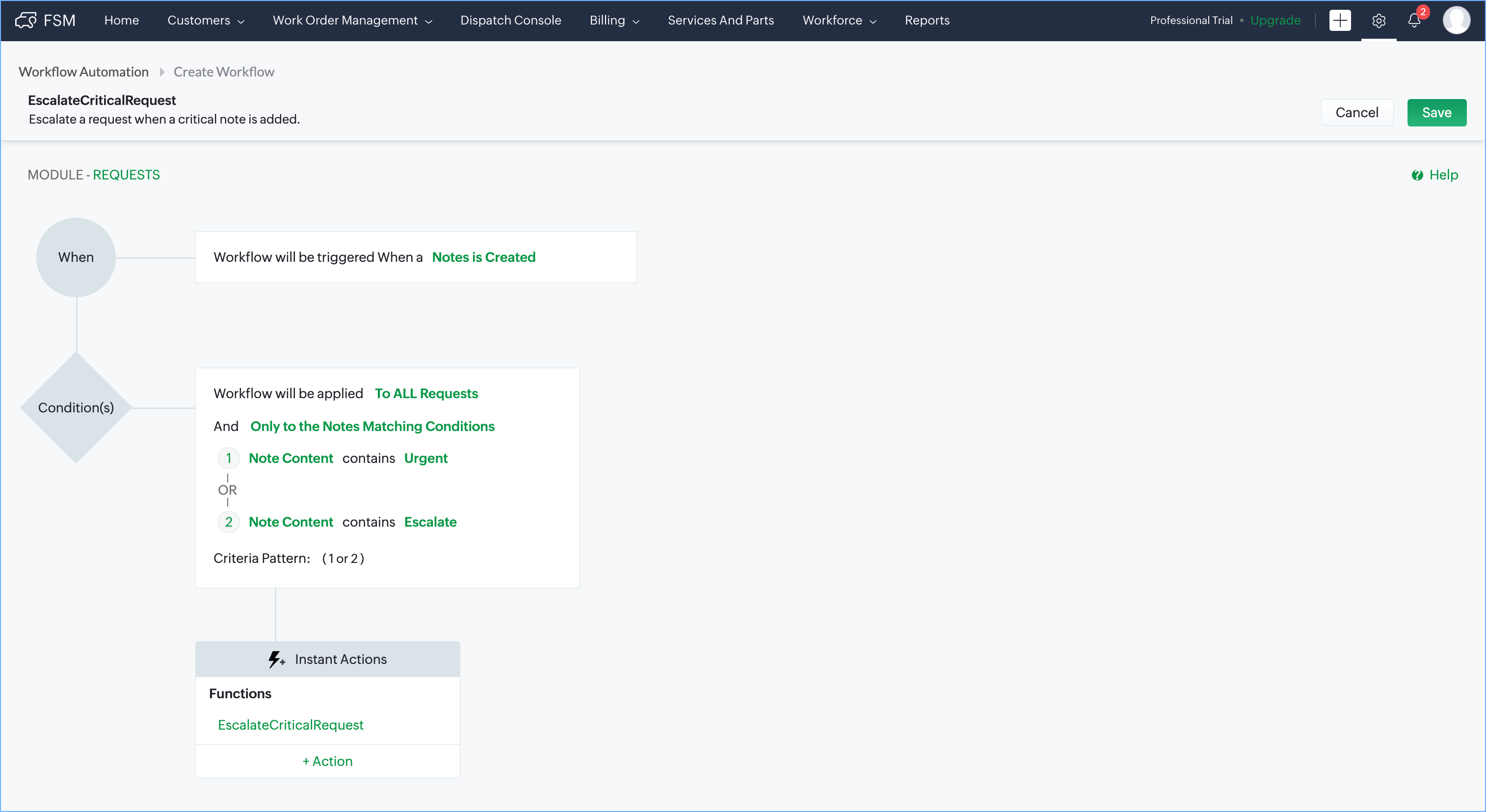 In Zoho FSM, workflow rules using notes help automate actions based on information added to records. By leveraging notes in workflow automation, teams can streamline communication, escalate issues, and automate service processes. The following are some of the examples that illustrate this: