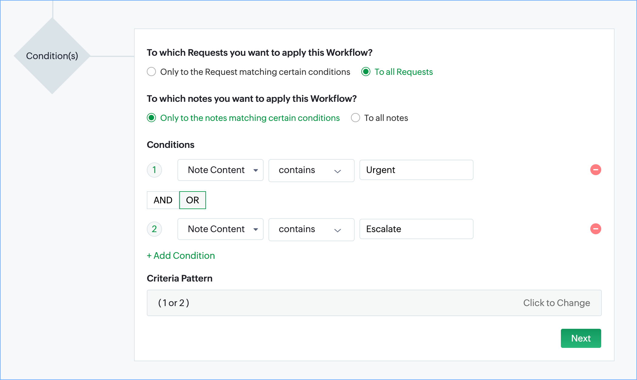 This workflow is used to notify the admin whenever a critical note (e.g., mentioning "urgent" or "escalate") is added to a request.