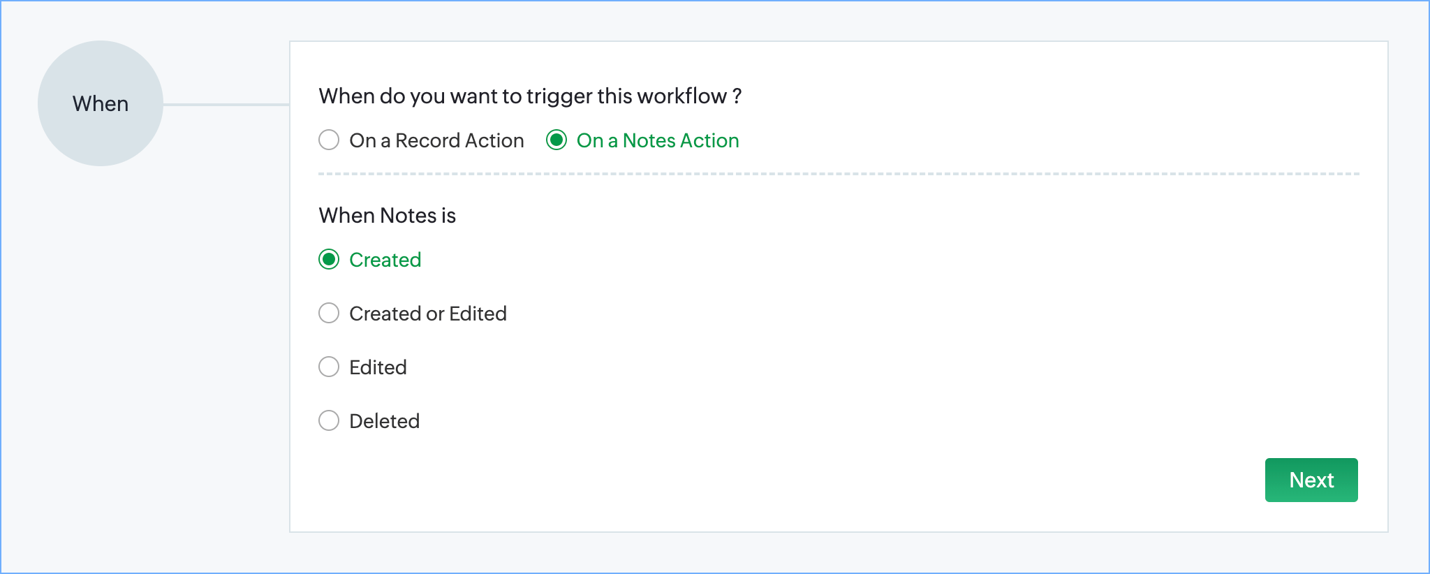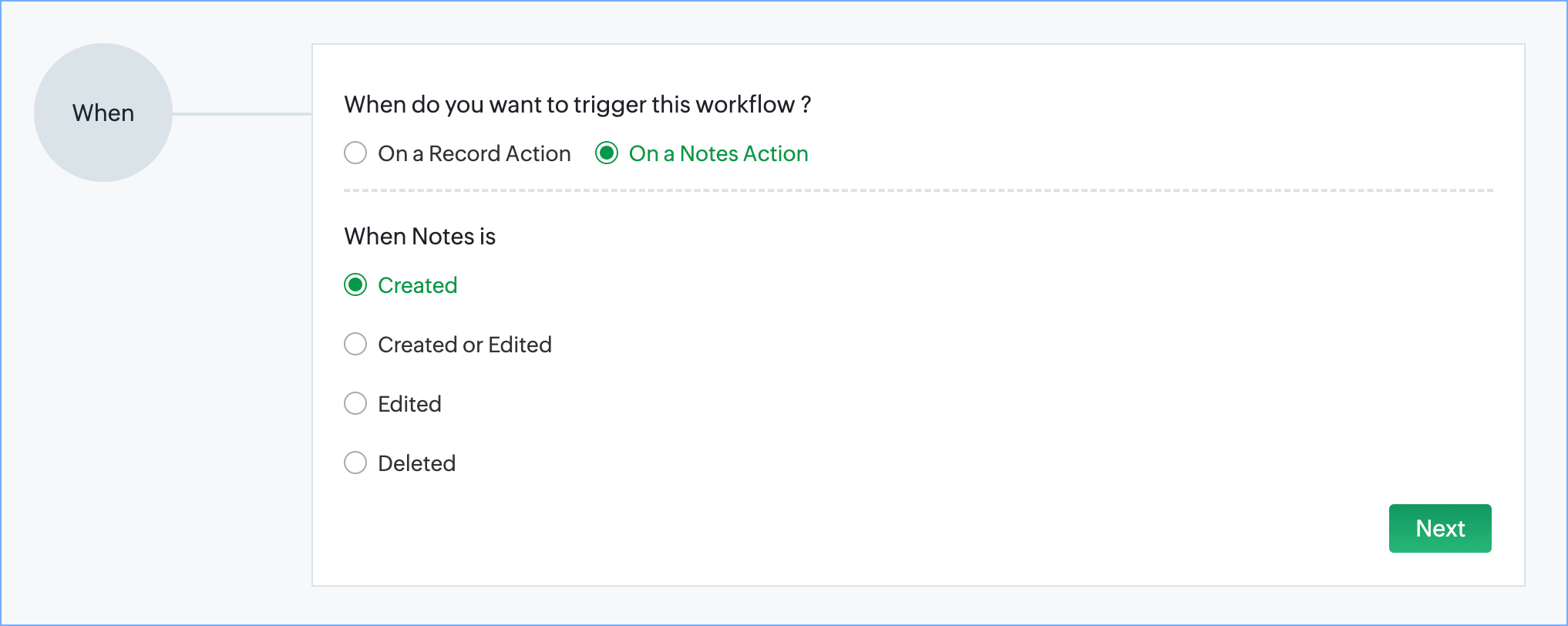 3. Select the rule trigger as On a Notes Action - Created and click Next.