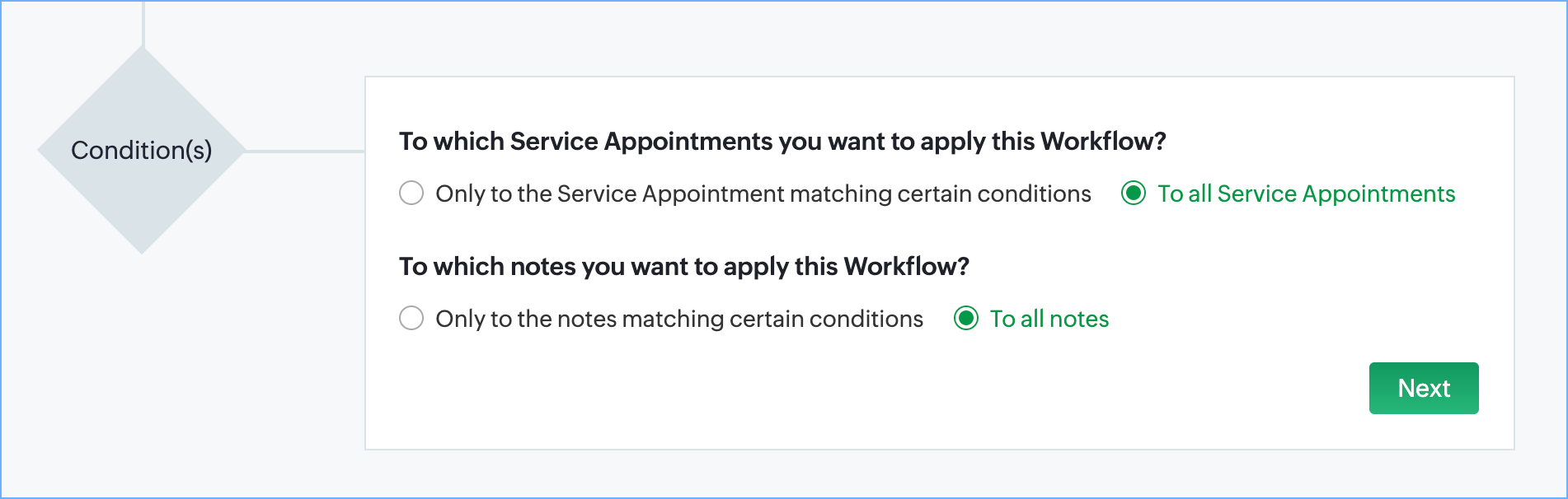 4. Select the rule criteria as To all Service Appointments and To all notes and click Next.