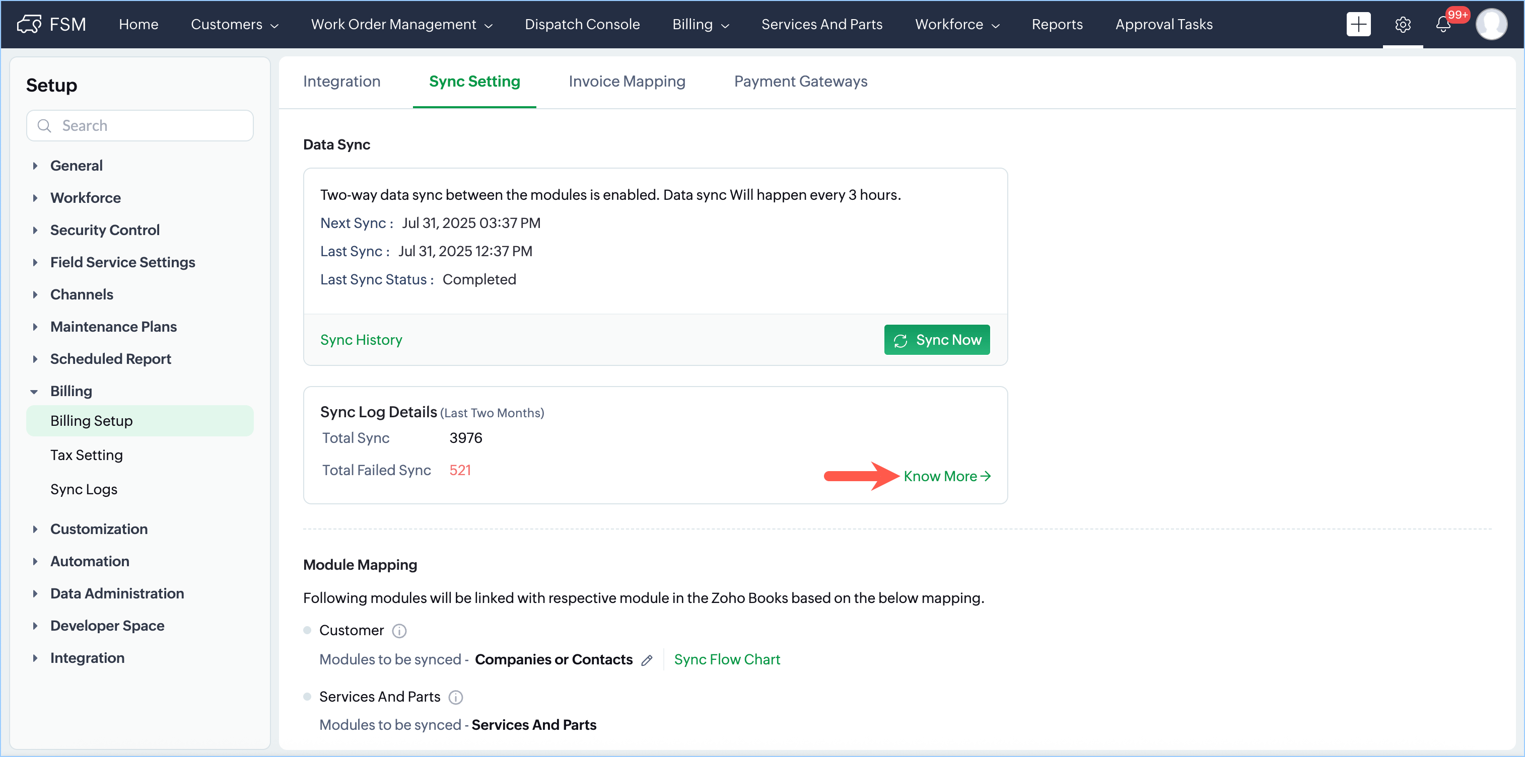 2. Zoho FSM to Zoho Books/Invoice: Shows the sync details of data that is pushed to Zoho Books/Invoice from Zoho FSM.