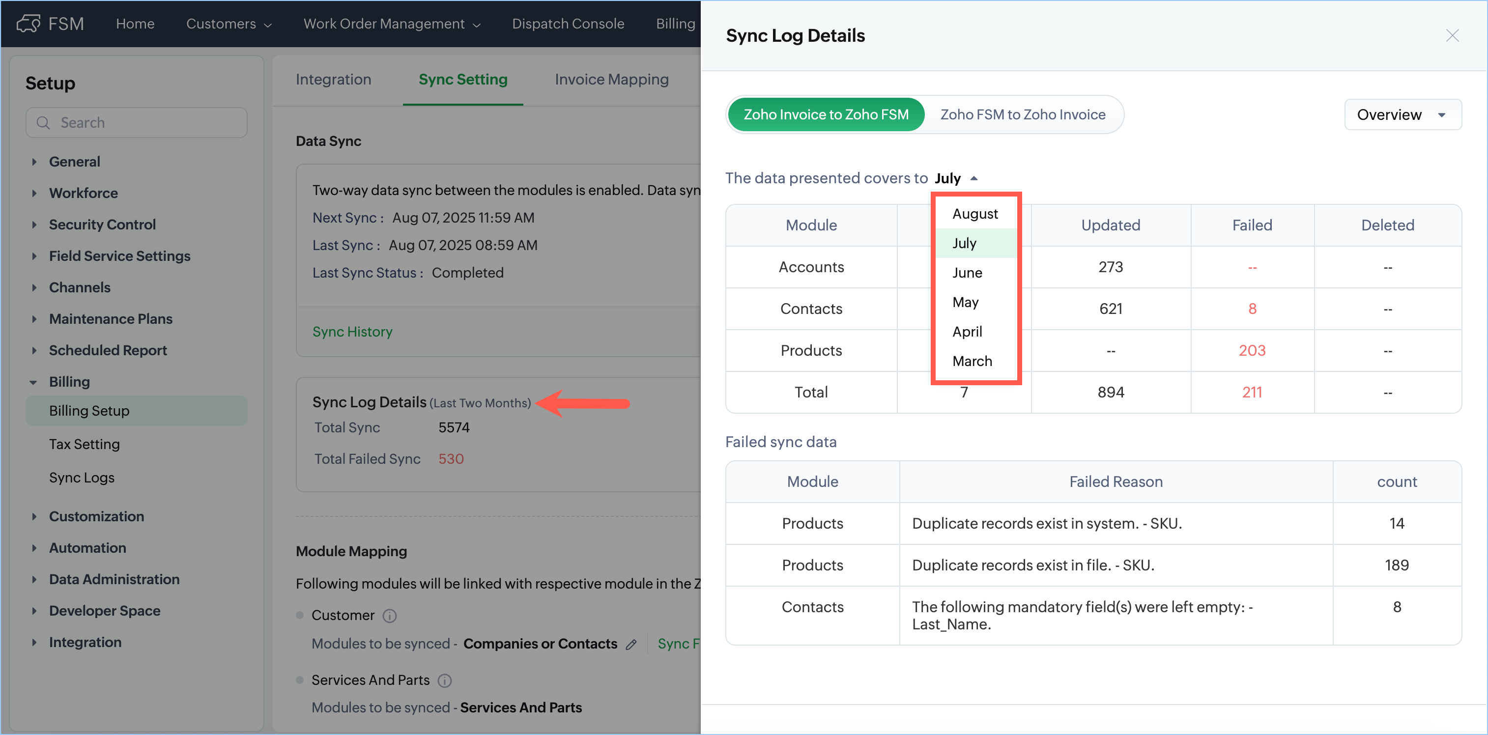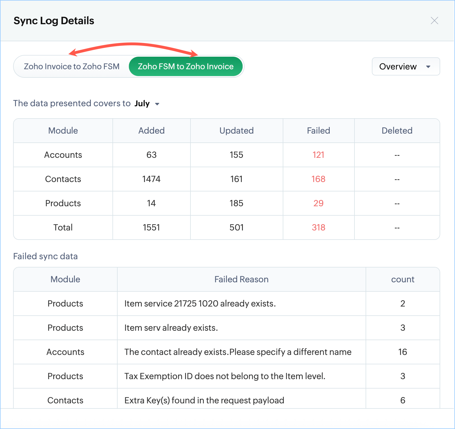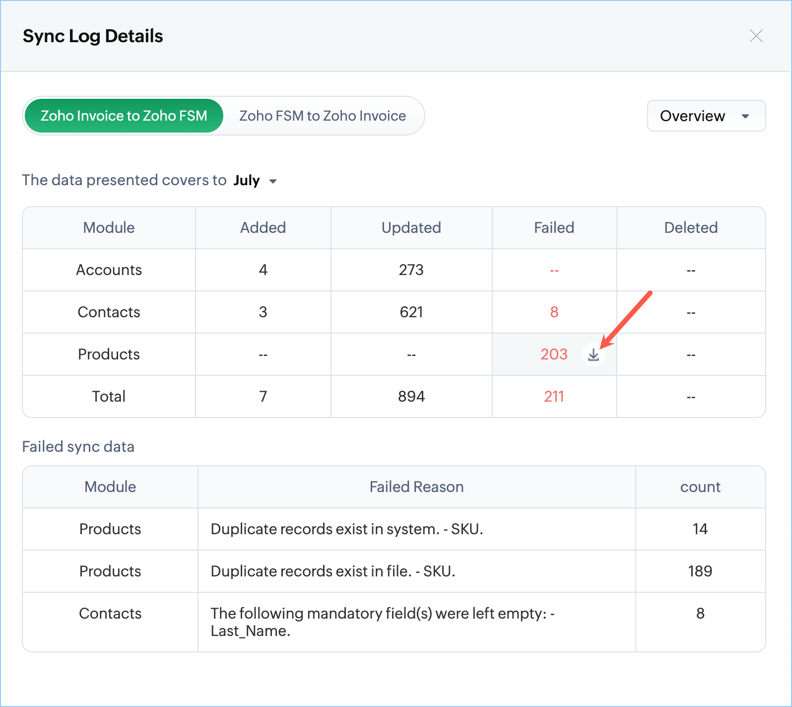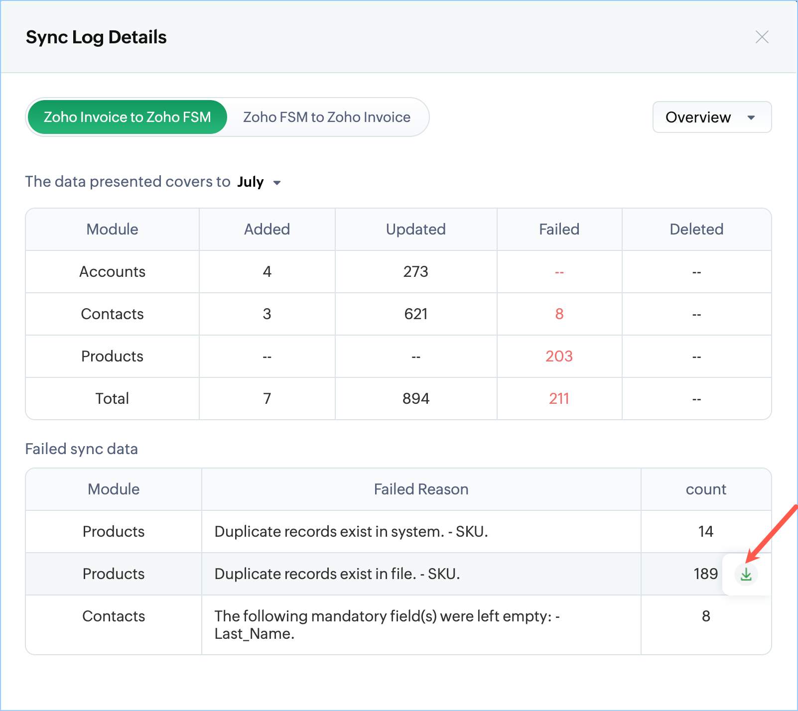 You can see the consolidated view of your sync history, showing the success and failure details of records synced between Zoho Books/Invoice and Zoho FSM.