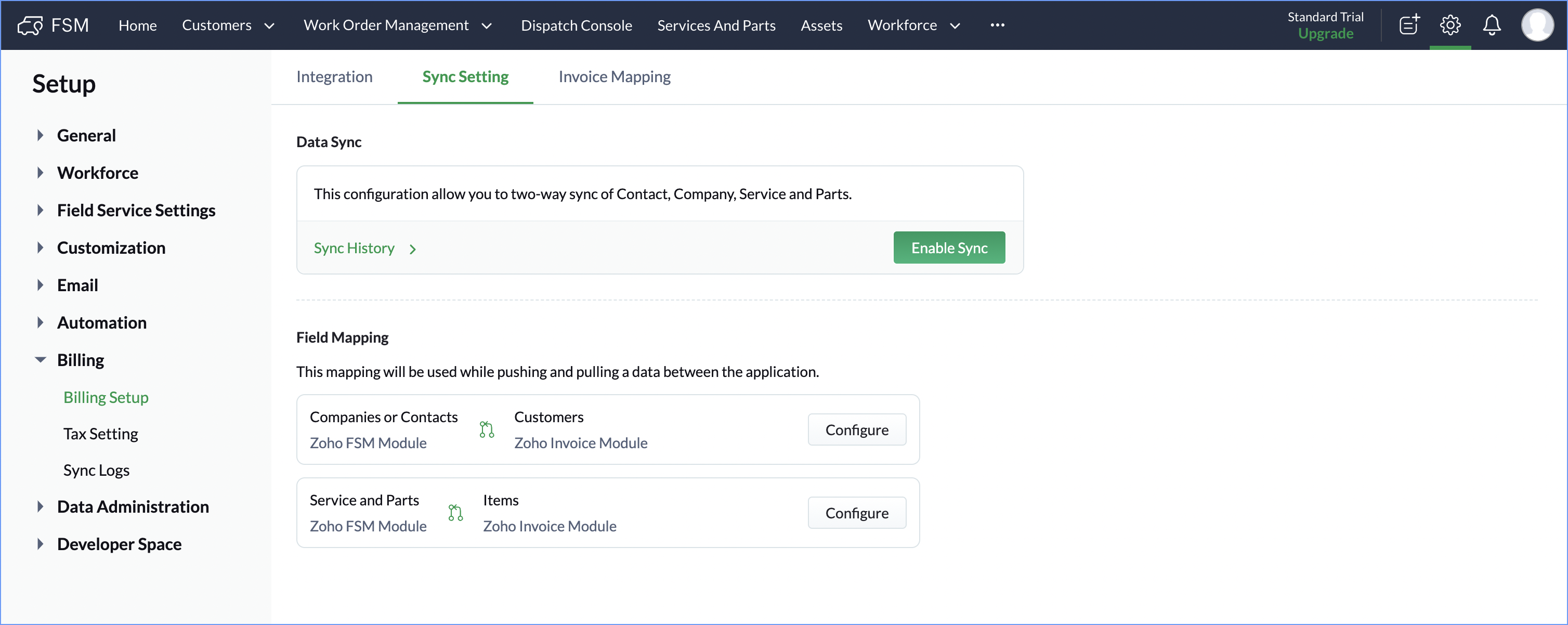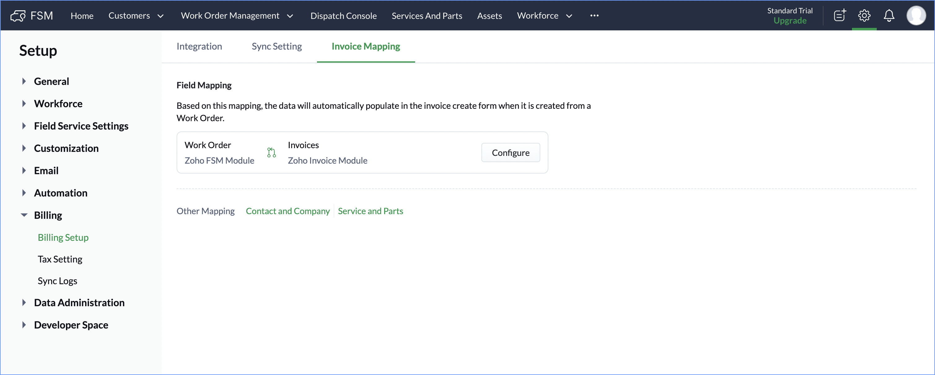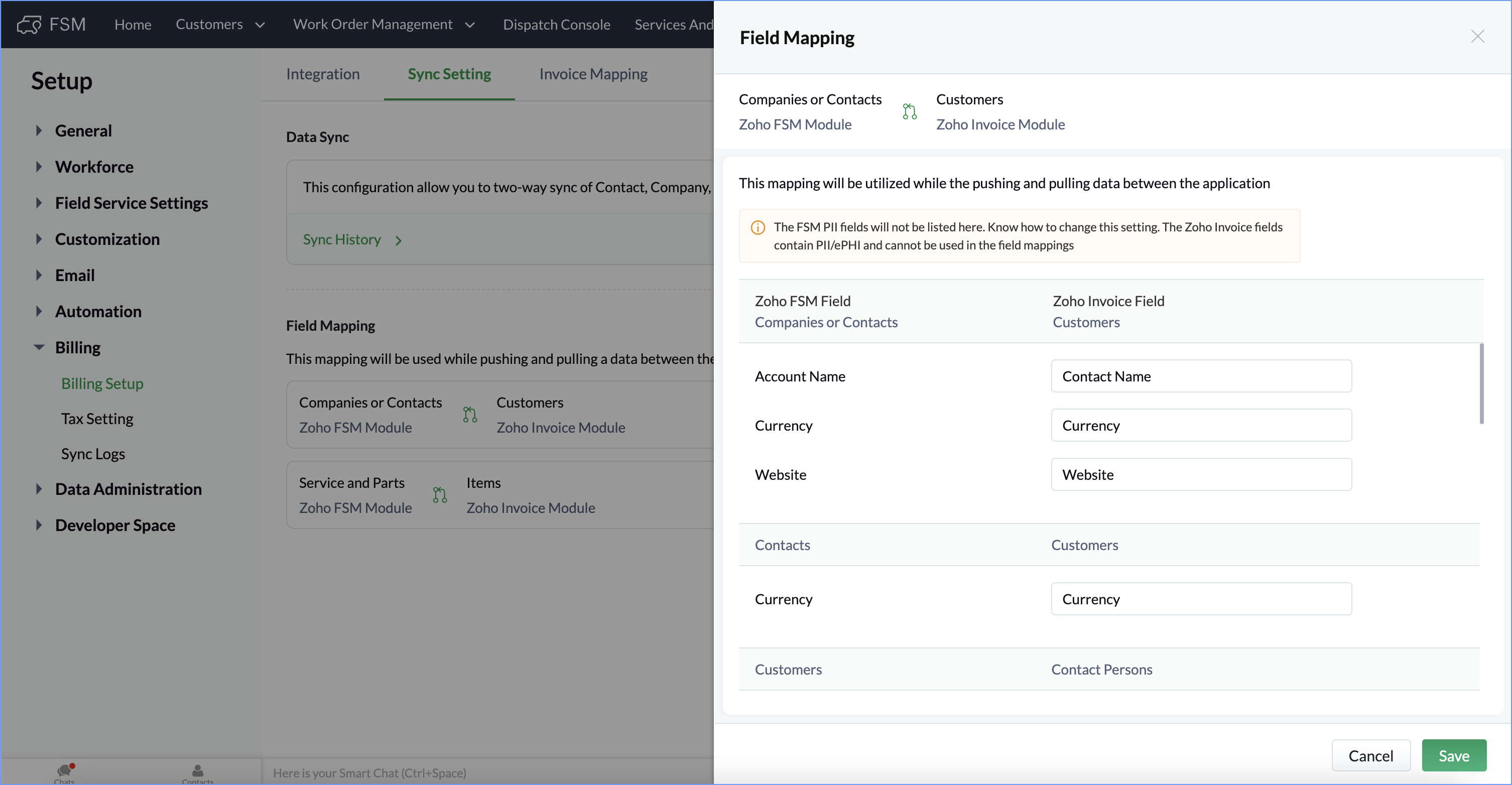 Type III | Map the Companies and Contacts module in Zoho FSM to the Customers module in Zoho Invoice/Books |