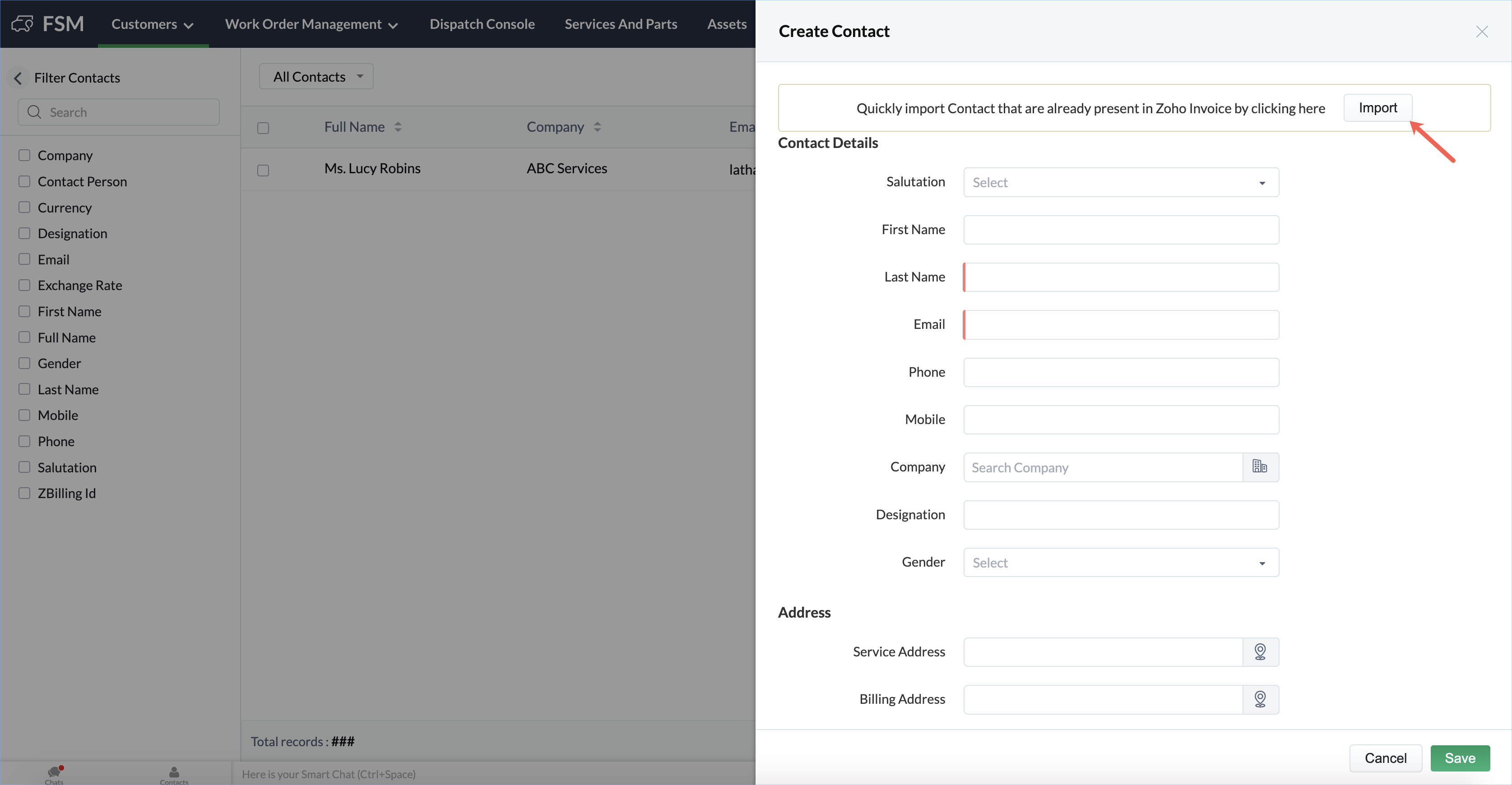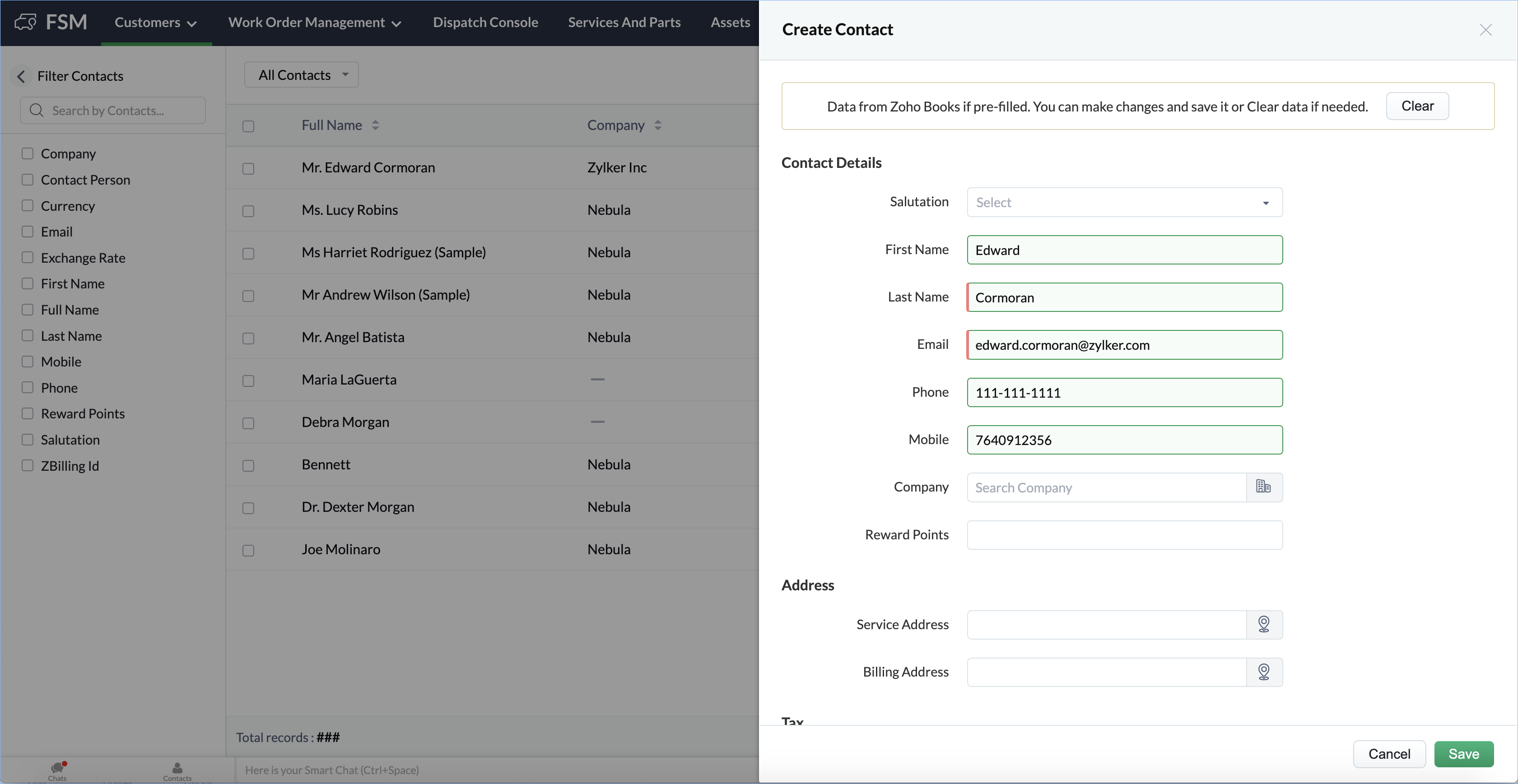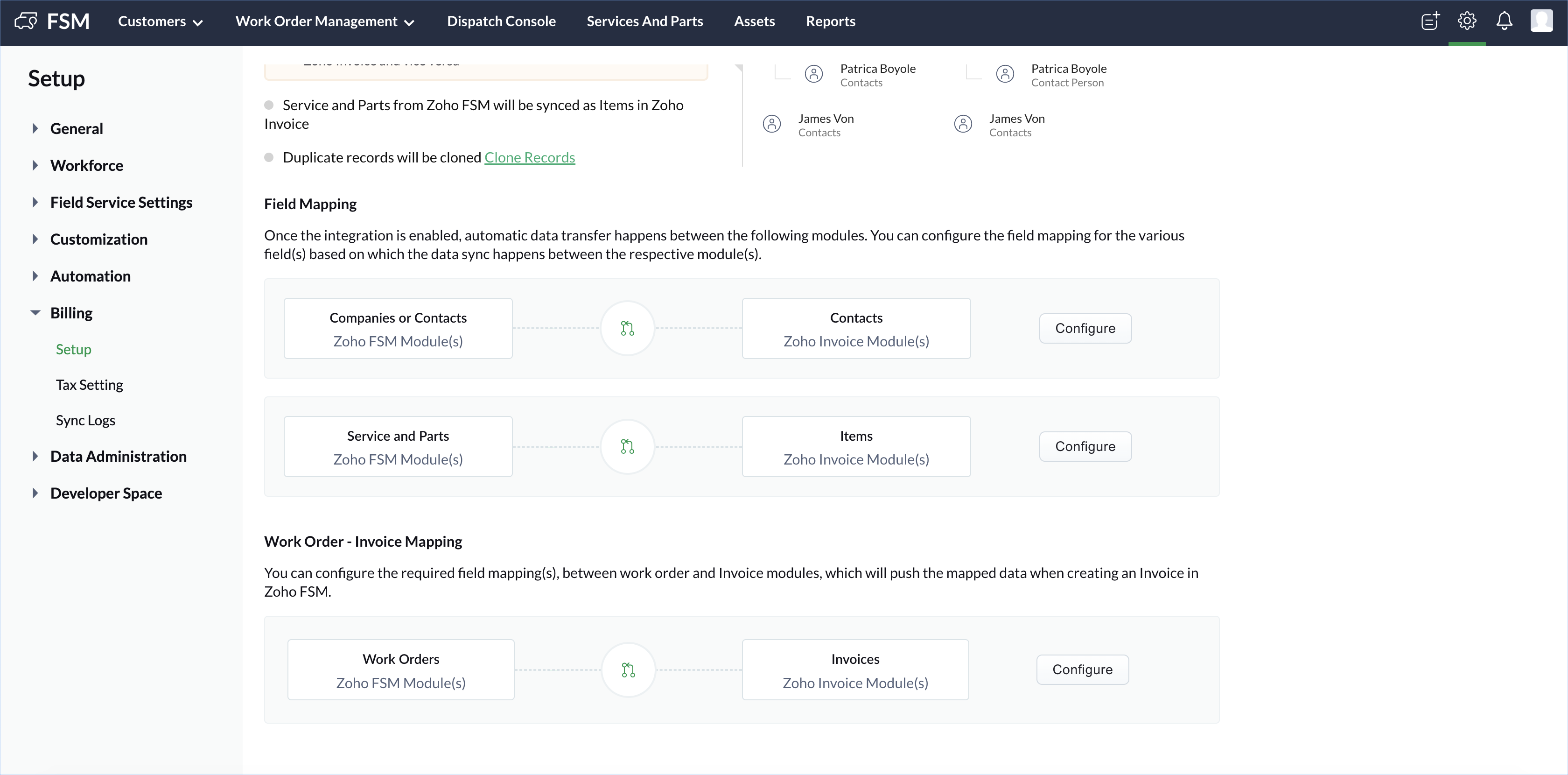 Type II | Map the Contacts module in Zoho FSM to the Customers module in Zoho Invoice/Books |