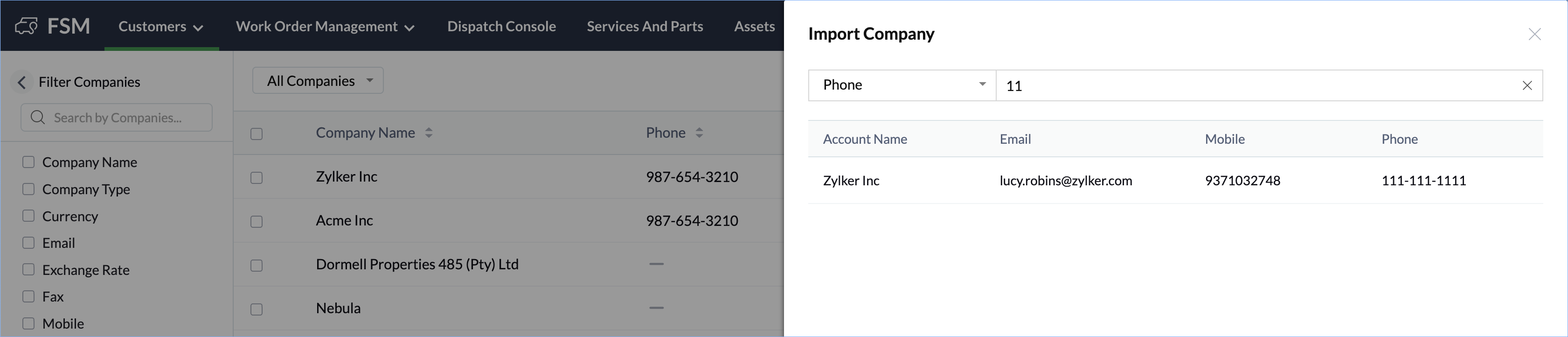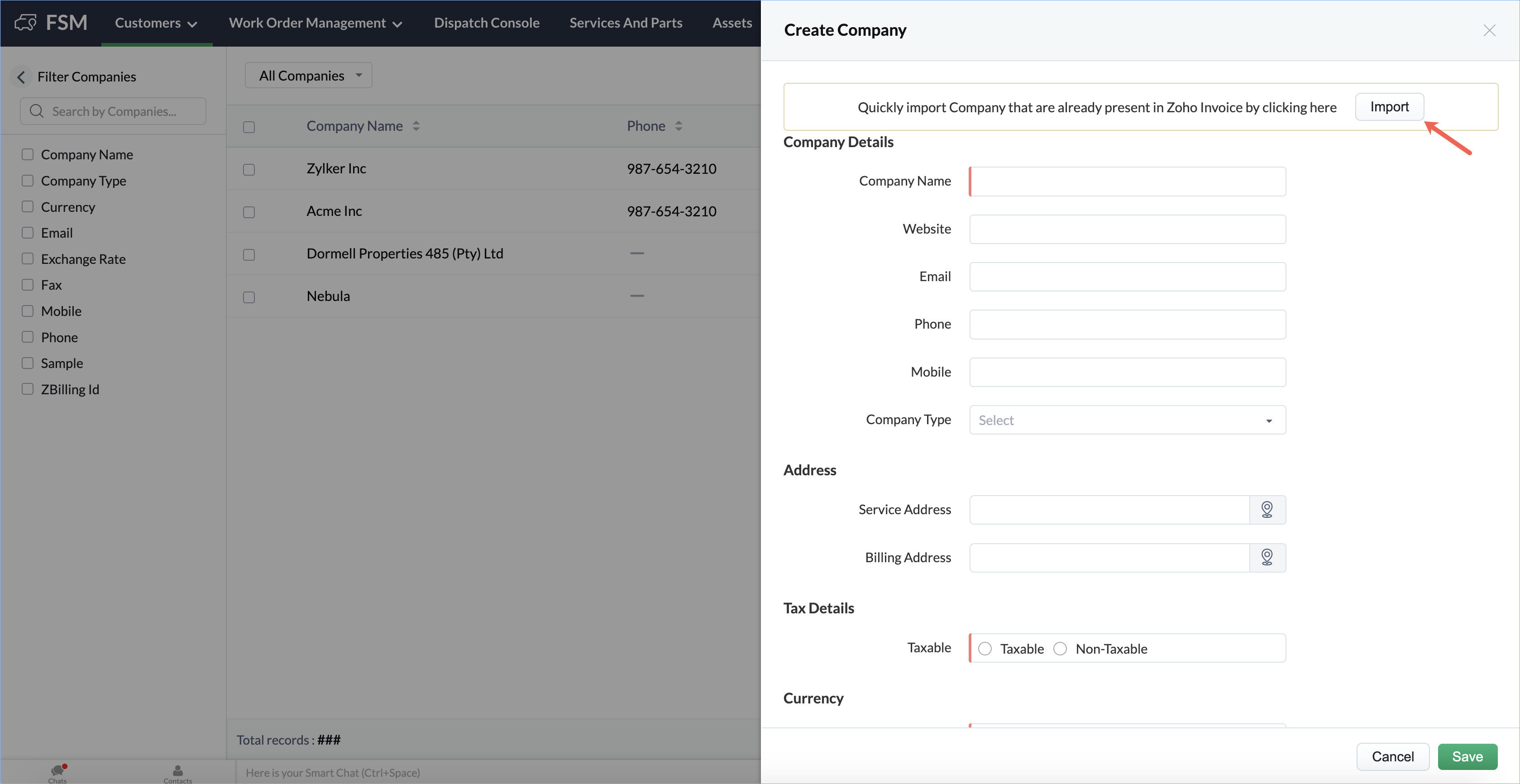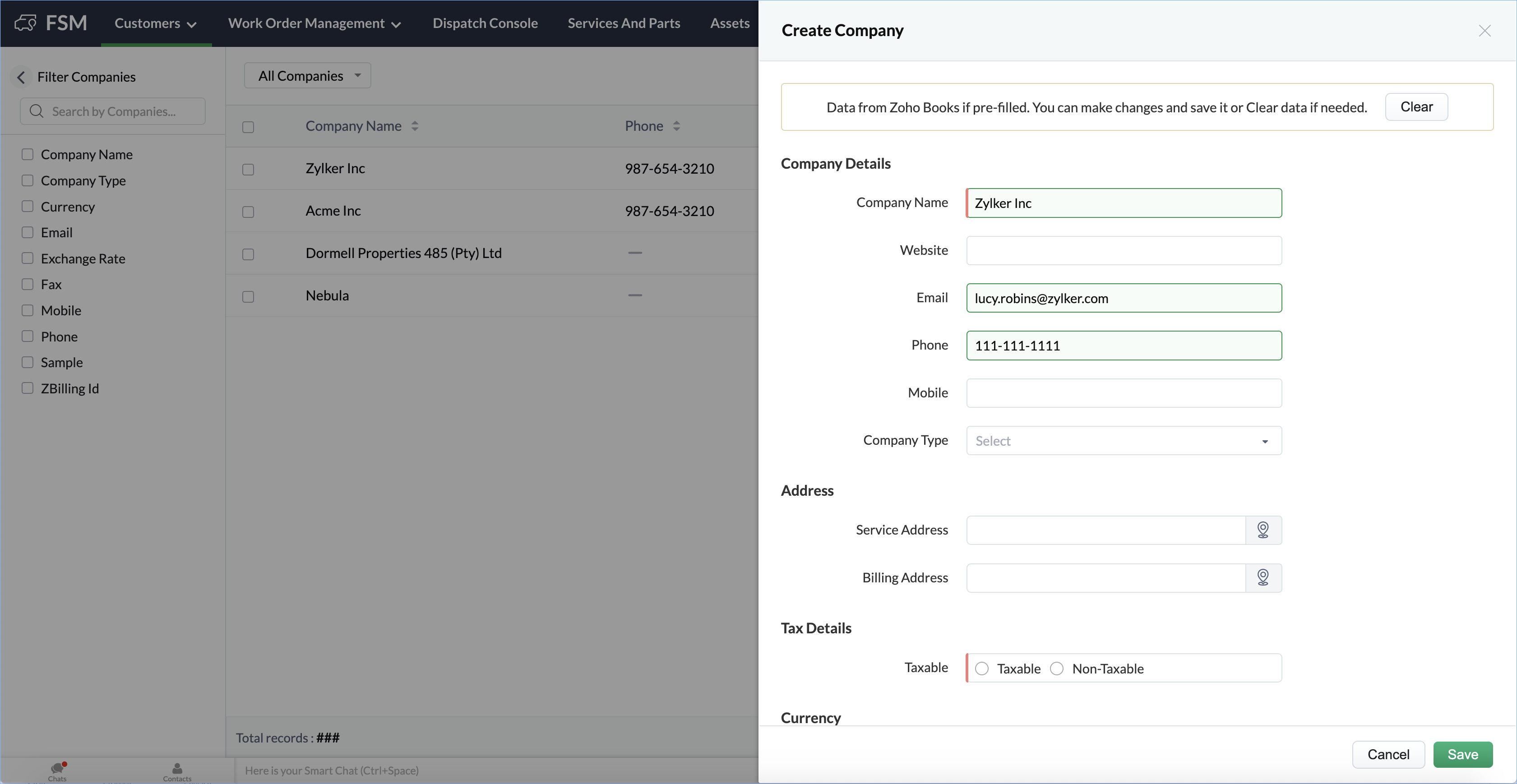 Type I | Map the Companies module in Zoho FSM to the Customers module in Zoho Invoice/Books |