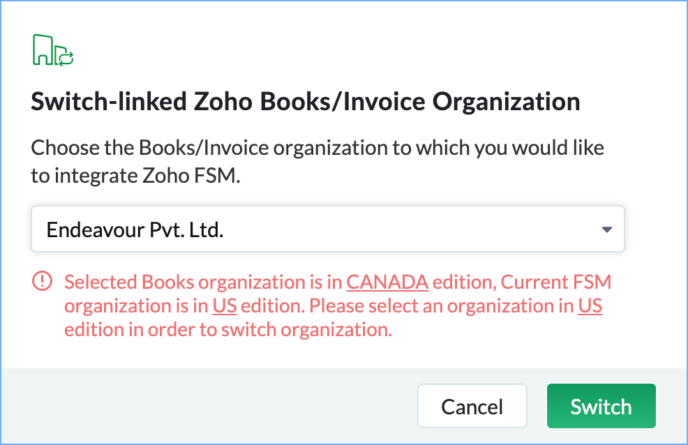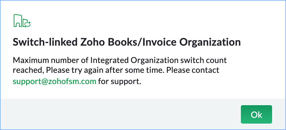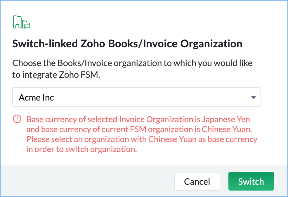 If the base currency of your Zoho FSM organization and the Zoho Books/Invoice organization to which you want to switch to differs, then you cannot switch to that organization.