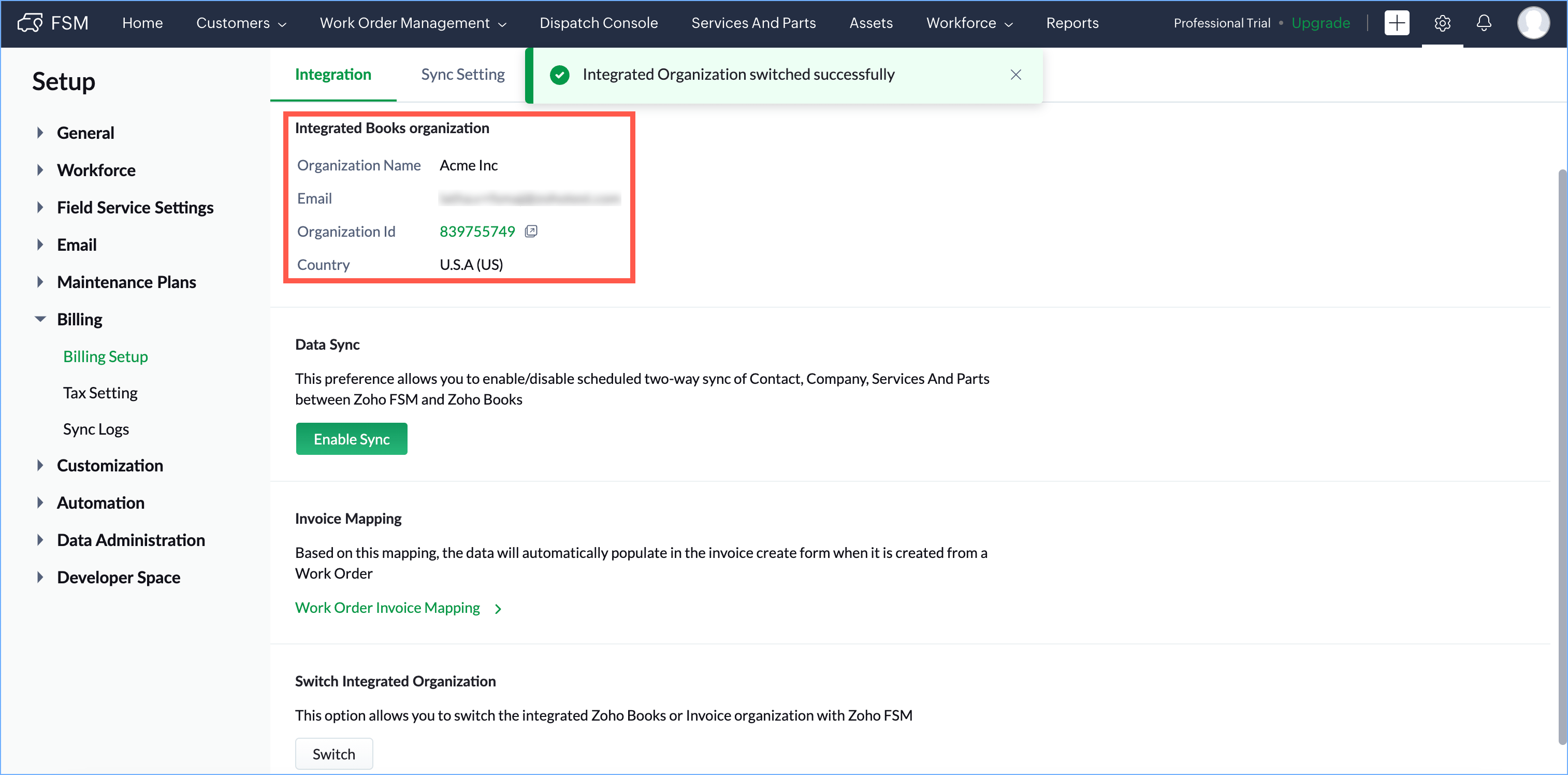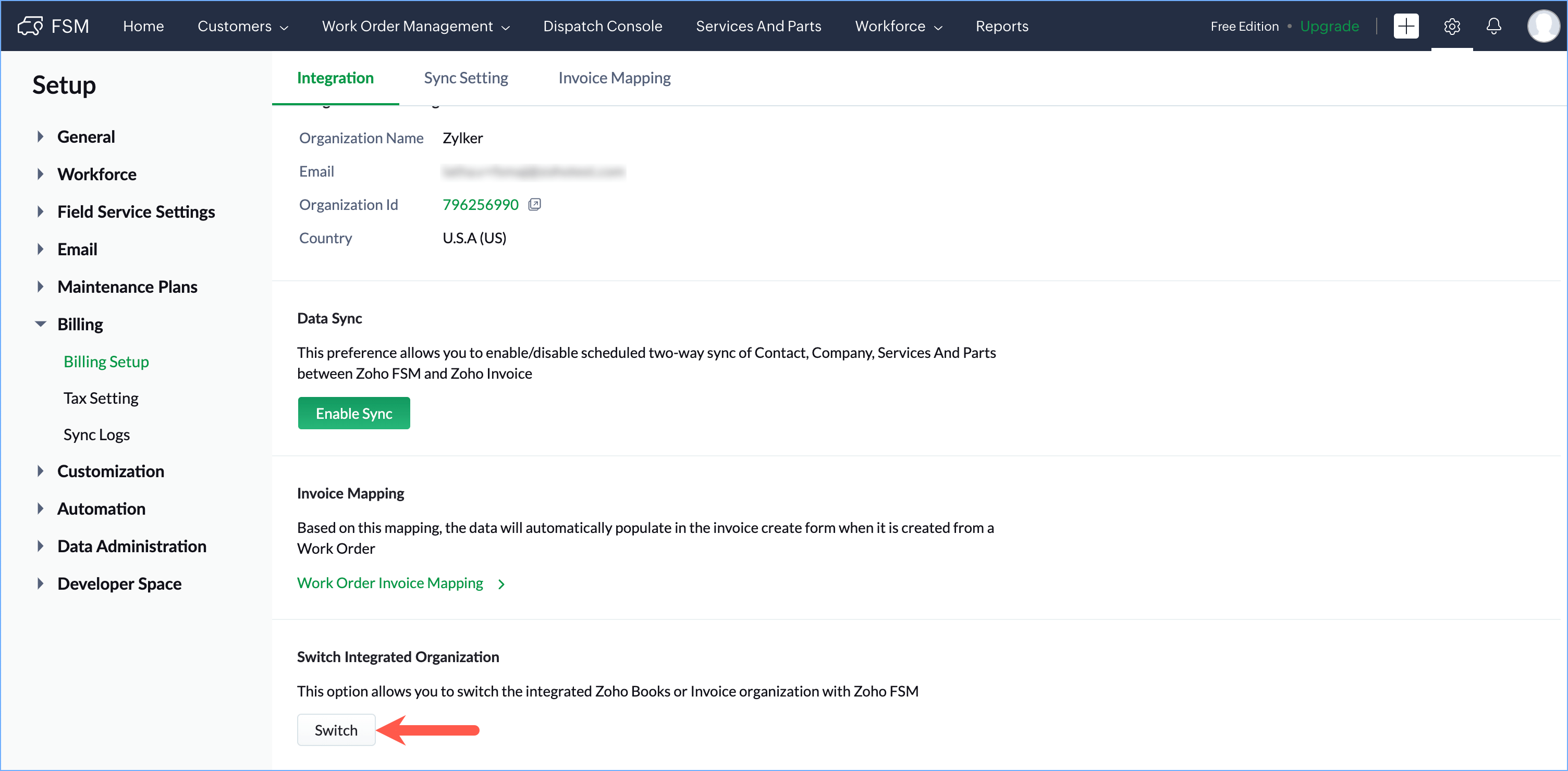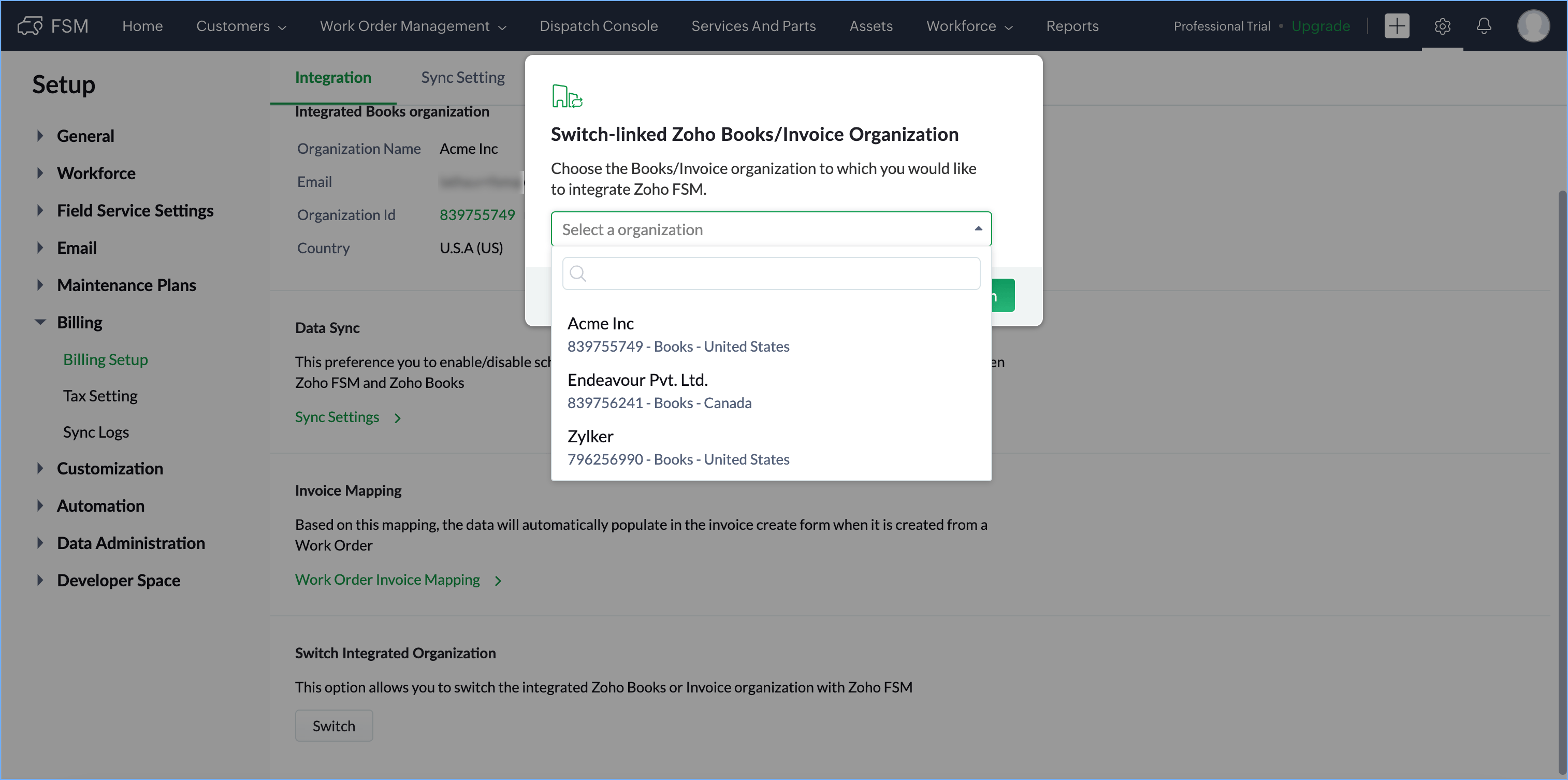 Users with the Administrator profile can change the Books/Invoice organization integrated with a Zoho FSM organization.