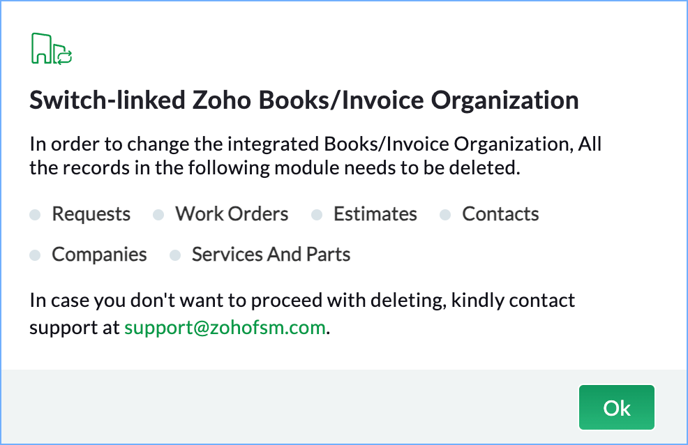 - If there are records in the Contacts, Companies, Requests, Estimates, Work Orders, or Services And Parts modules that are linked with the integrated Zoho Books/Invoice organization through tax configuration, data sync etc, you need to delete them to proceed.