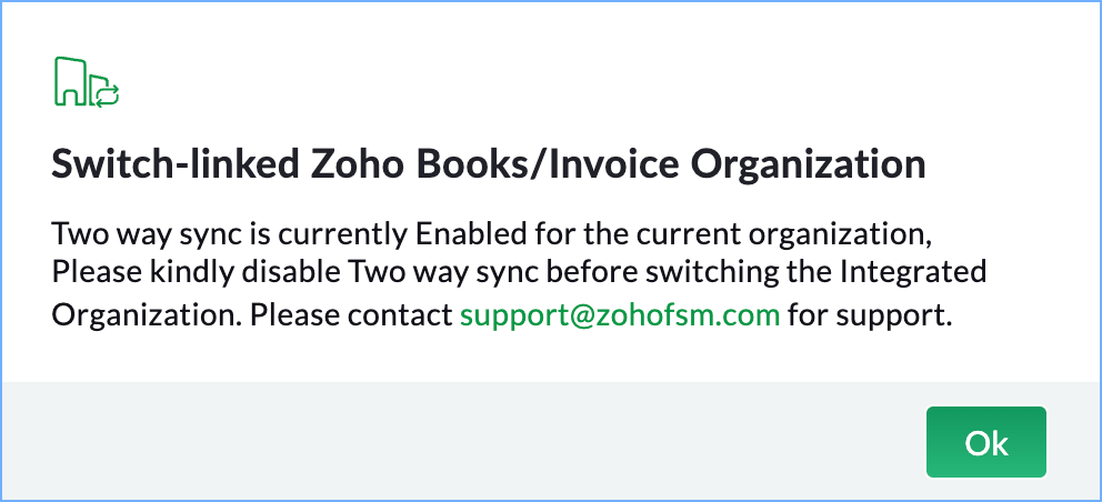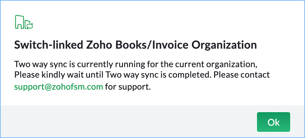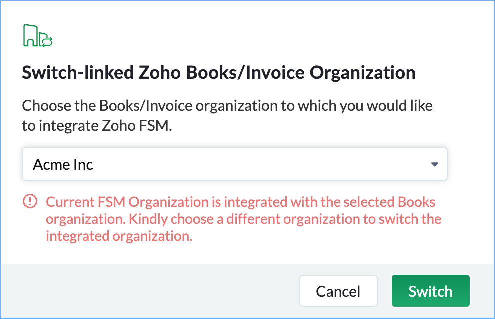 You will be unable to perform the organization switch if the two-way data sync between the Zoho FSM organization and the Zoho Books/Invoice organization is in progress. Try performing the switch once the two-way sync is completed.