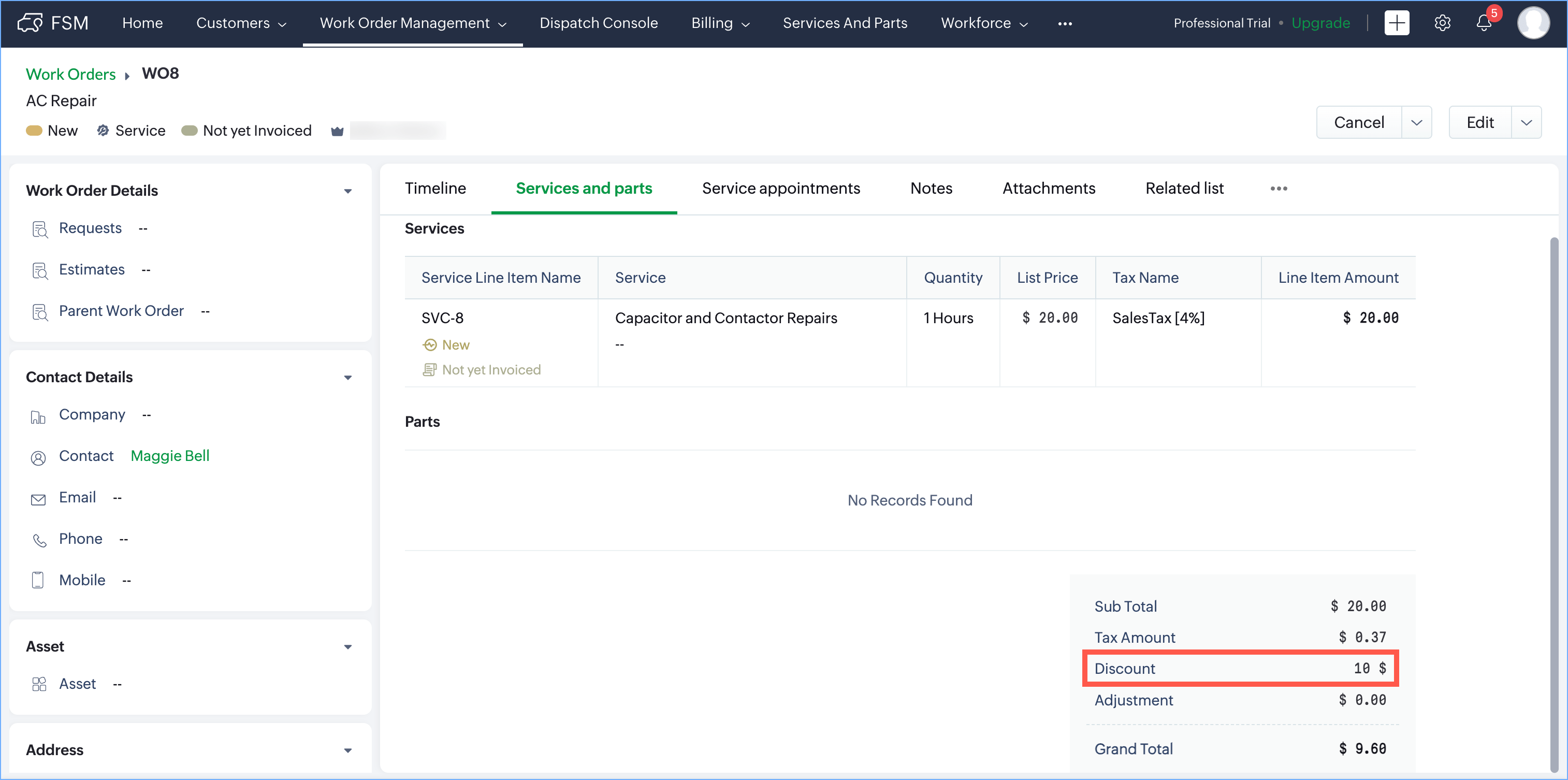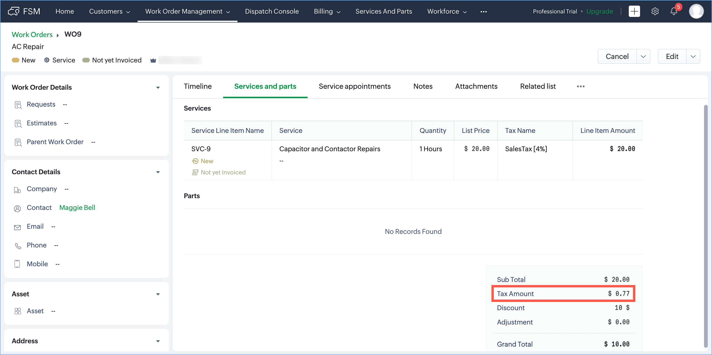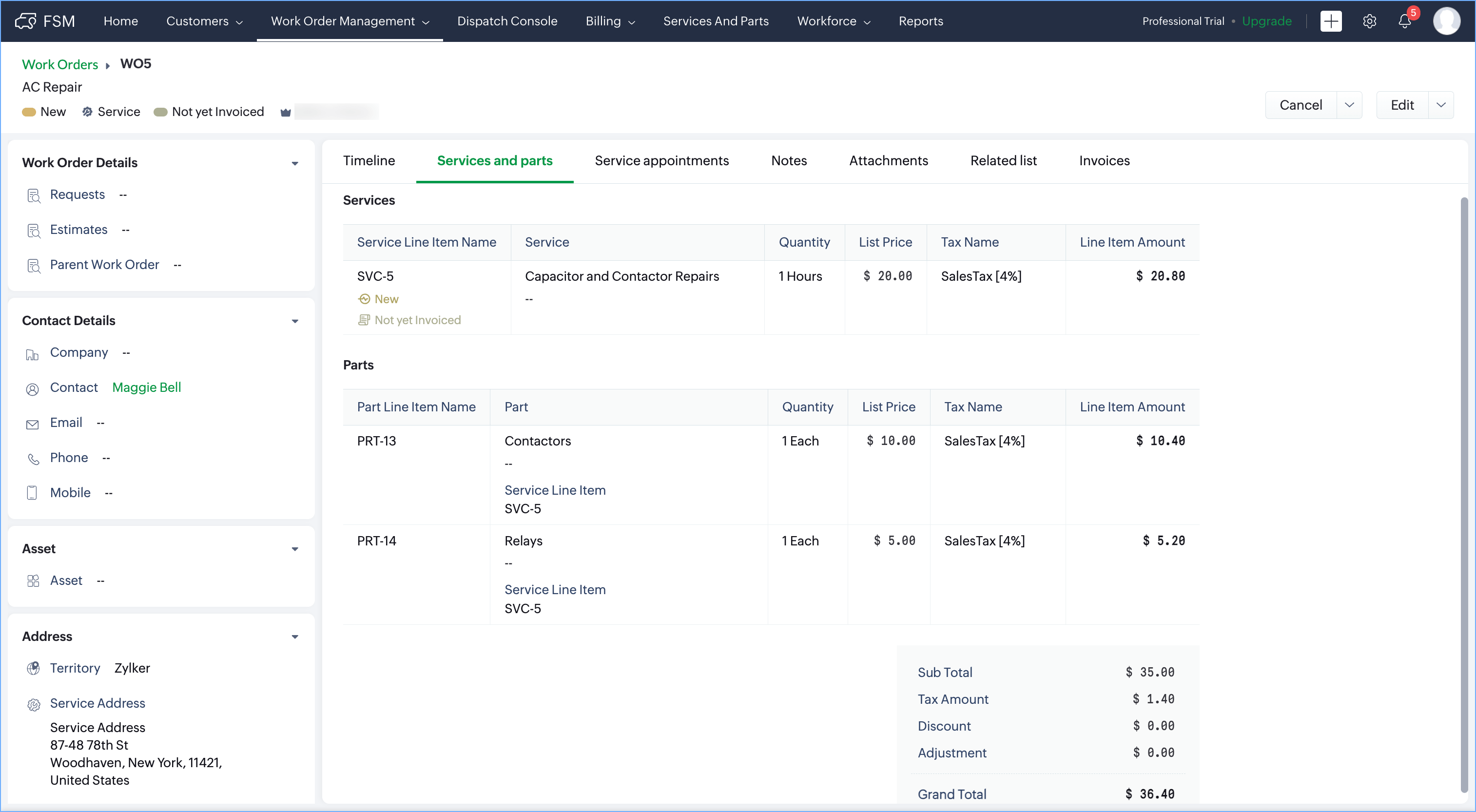 Example: The List Price for the service Capacitor and Contactor Repairs is $20, for the part Contactors is $10, and for the part Relays is $5. When the taxes are applied, the Line Item Amount for each line items will be $20.80, $10.40, and $5.20 respectively. Thus, the Sub Total is $35 ($20 + $10 + $5), Tax Amount is $1.4 ($0.80 + $0.40 + $0.20) and the Grand Total (Sub Total + Tax Amount) is $36.5 ($35 + $1.4). Here, the Discount and Adjustment are zero.