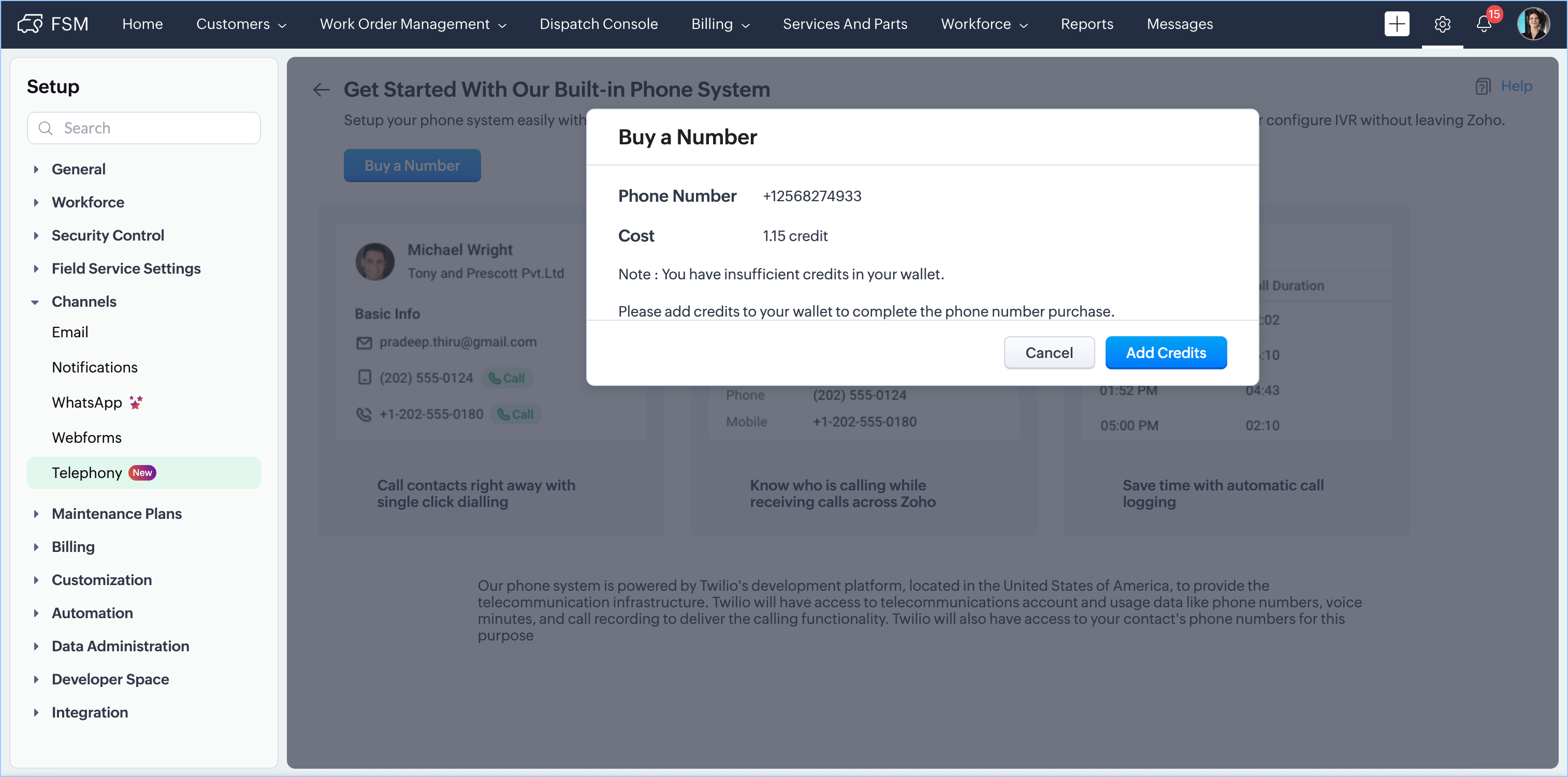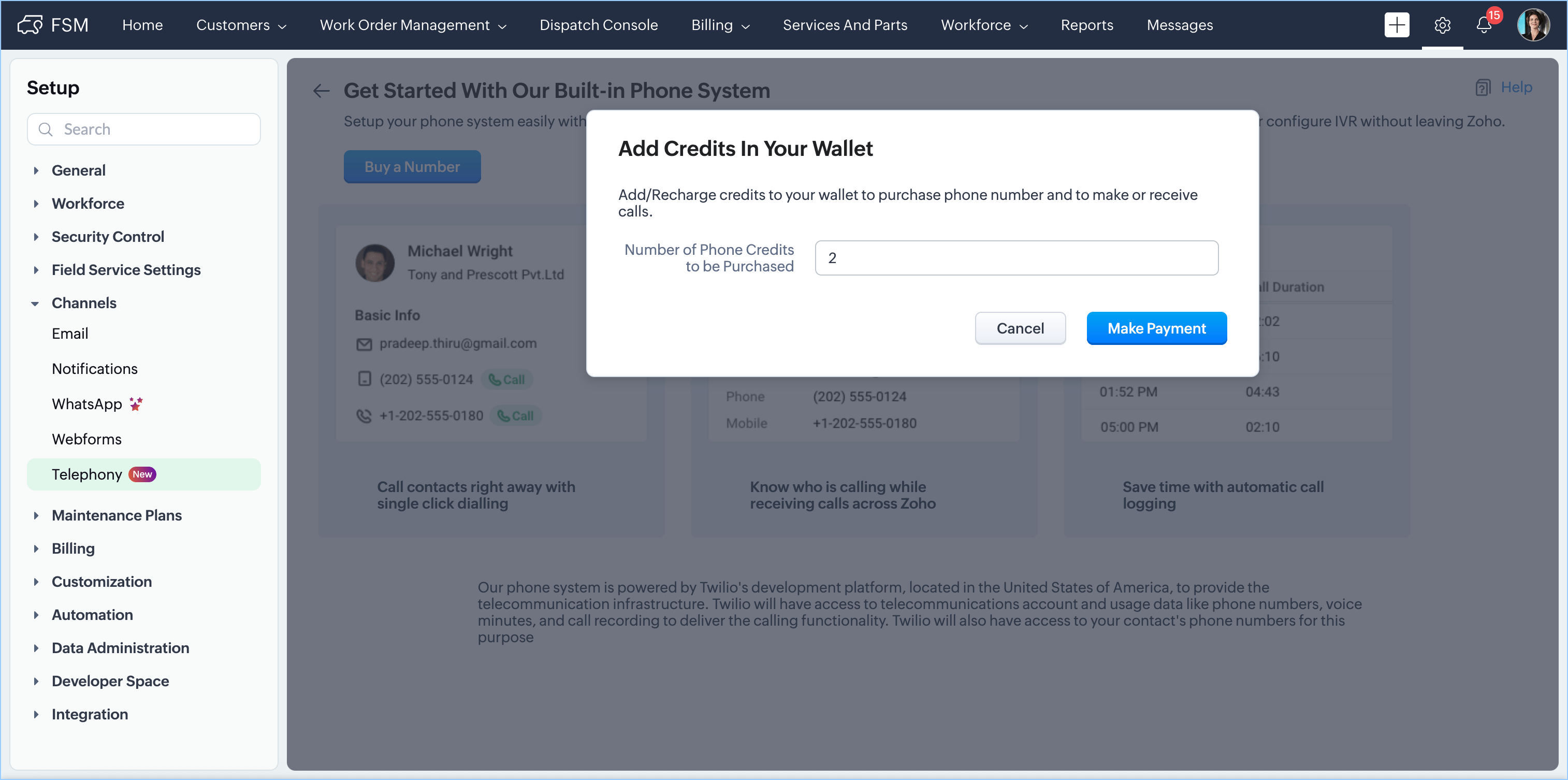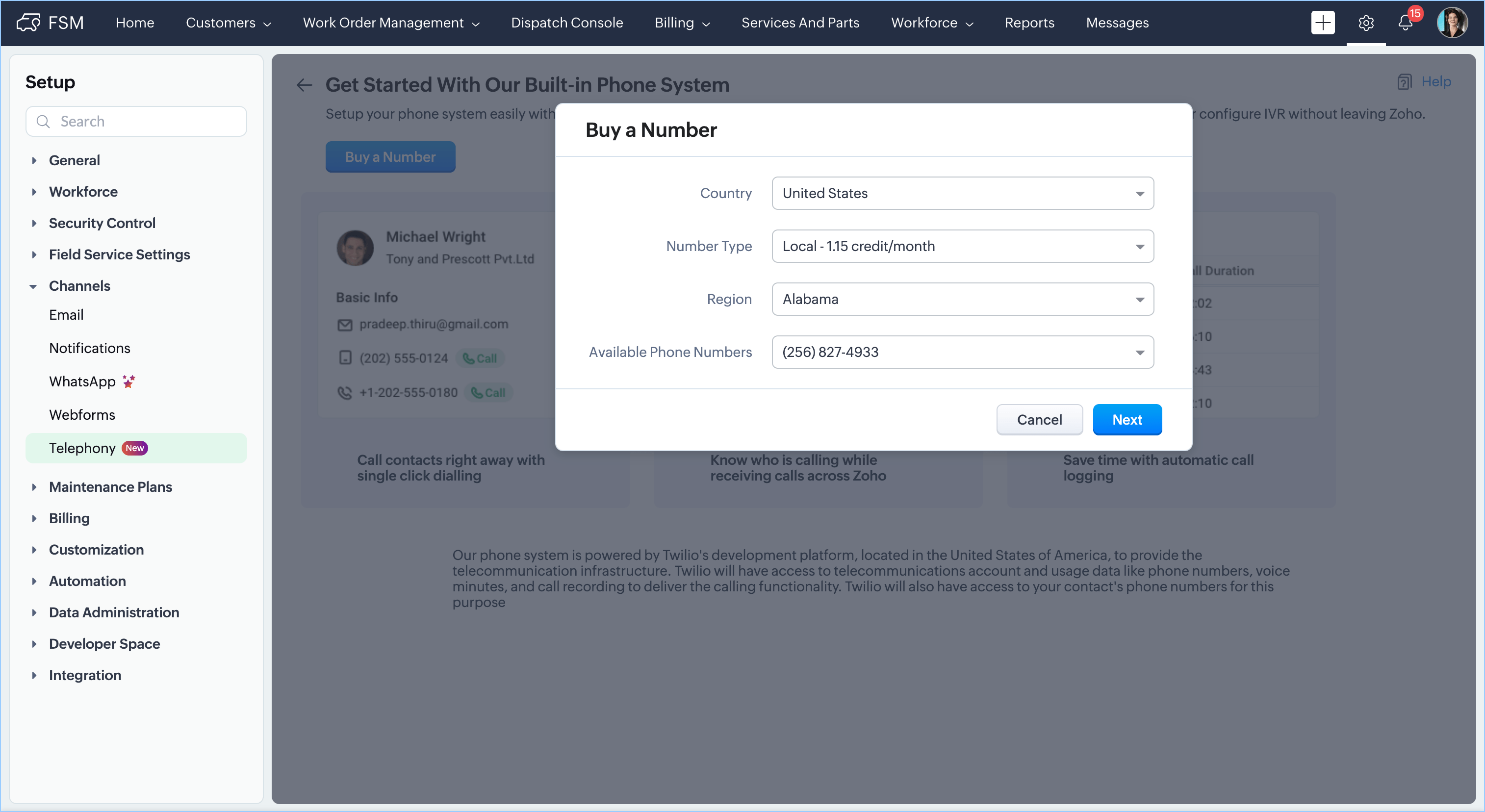 1. Purchase and manage phone numbers directly within Zoho FSM.