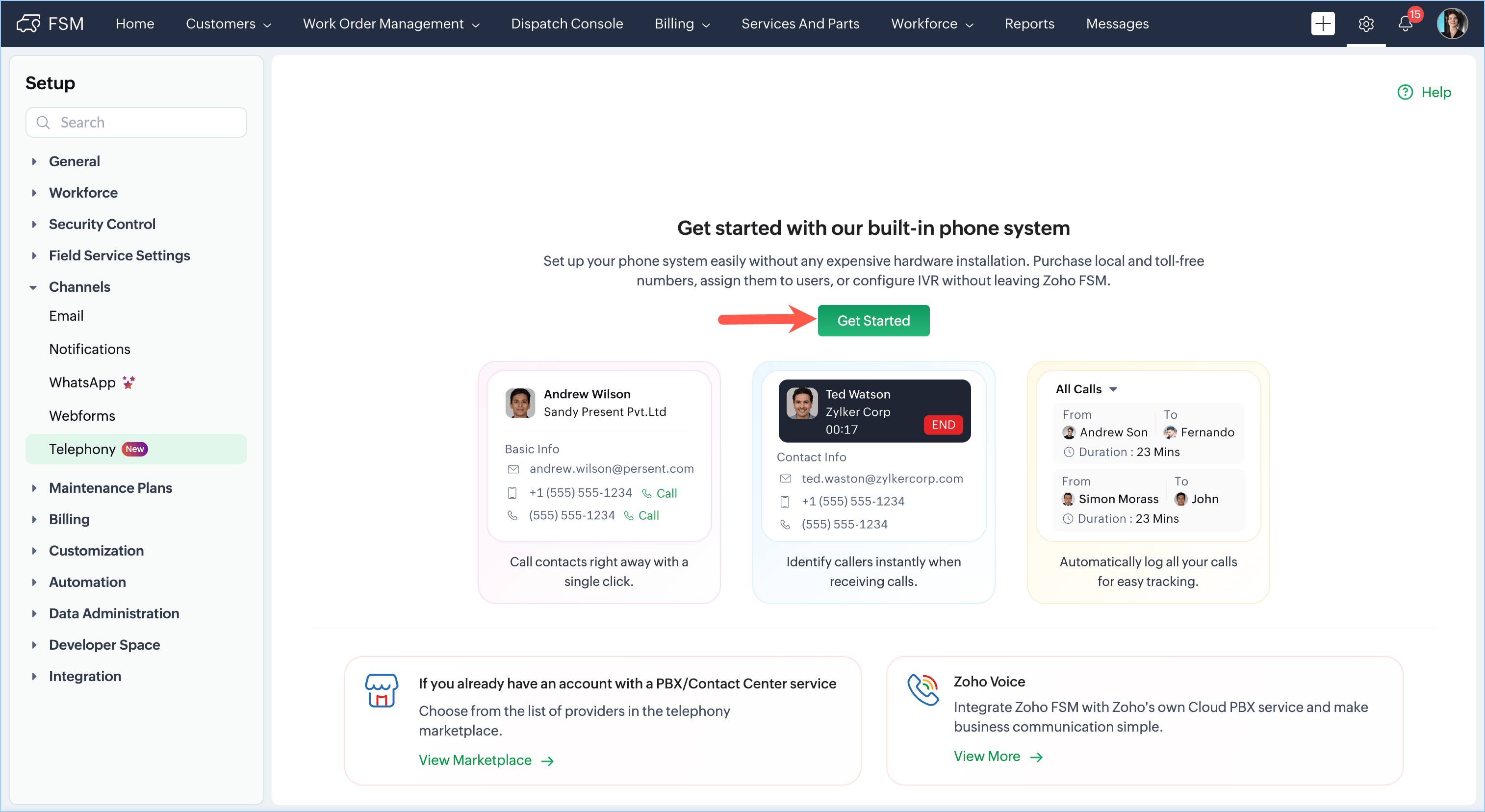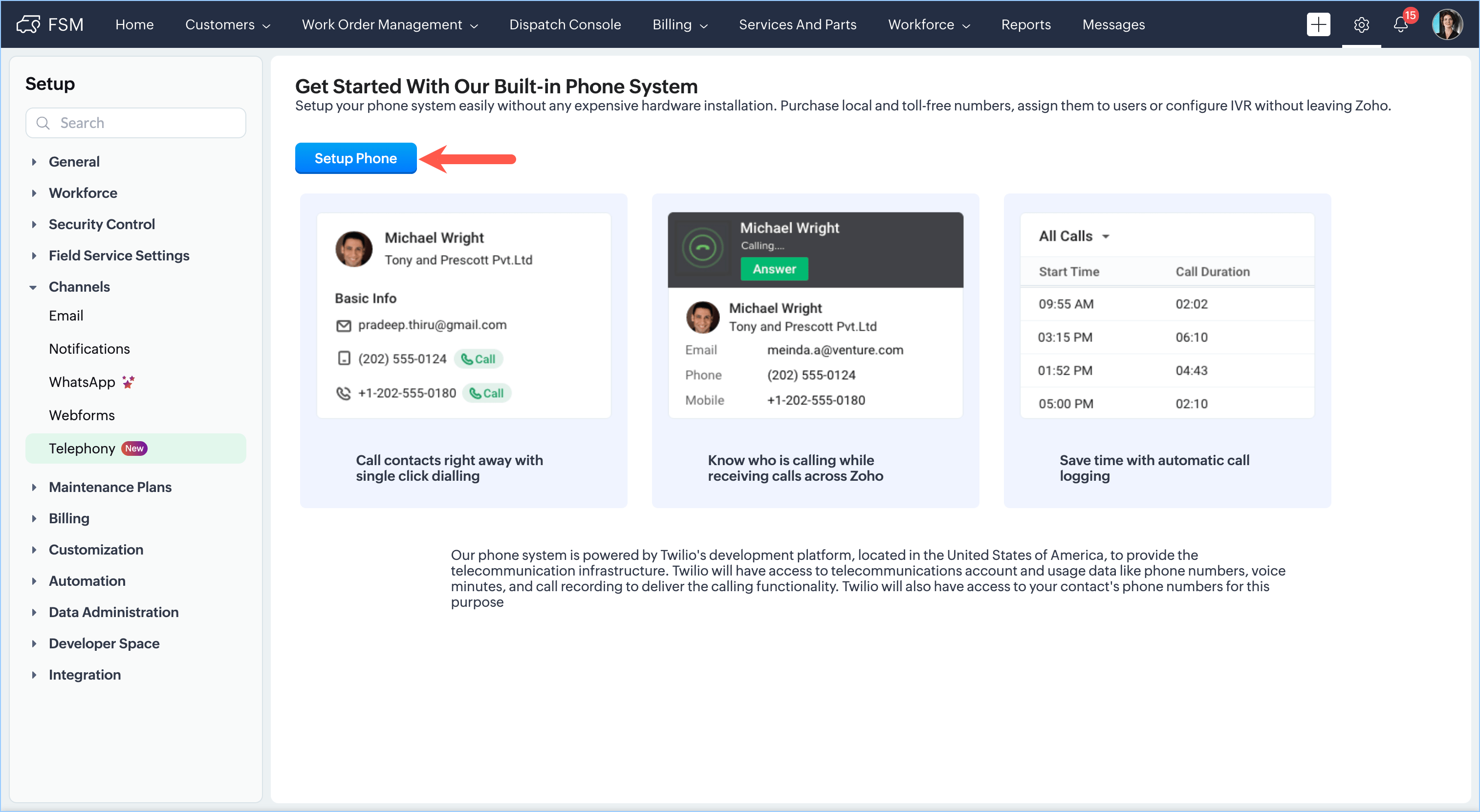 Once the Built-In telephony is enabled in Zoho FSM, you will be able to: