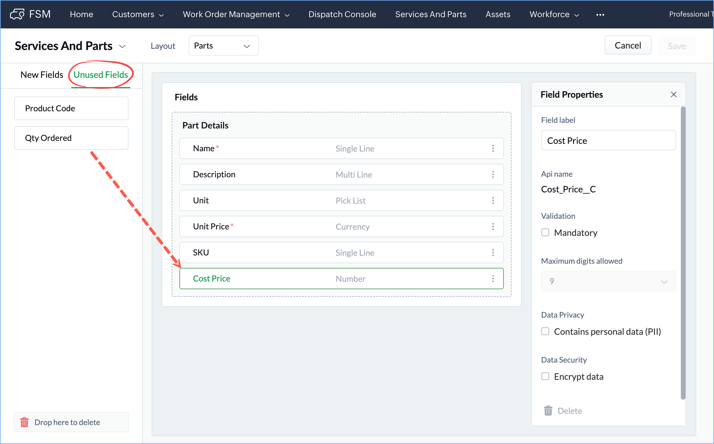 Services And Parts (Parts layout) | Cost Price | Decimal | For a part, enter the cost/purchase price of the part in this field. |