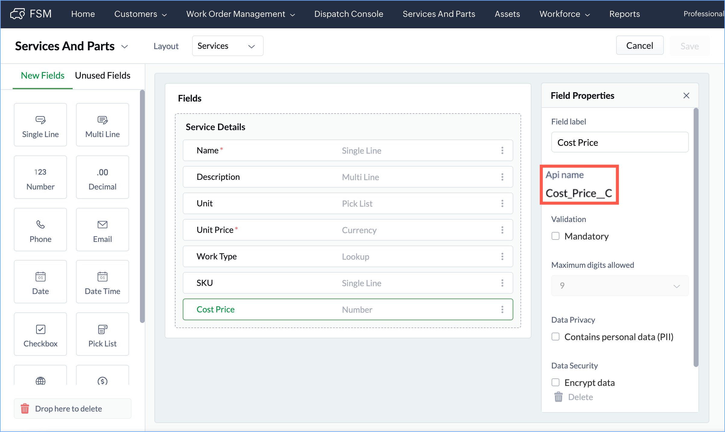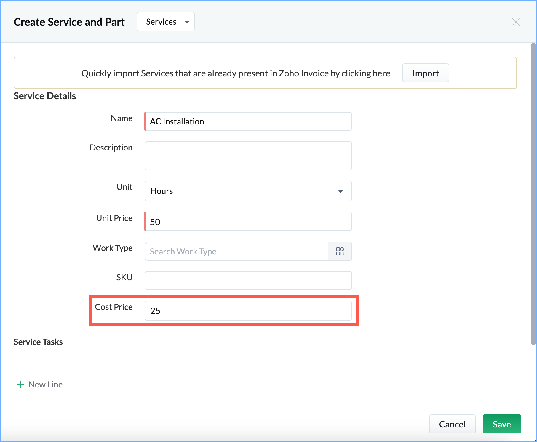 Services And Parts (Services layout) | Cost Price | Decimal | For a service, enter the cost/purchase price of the service in this field. |