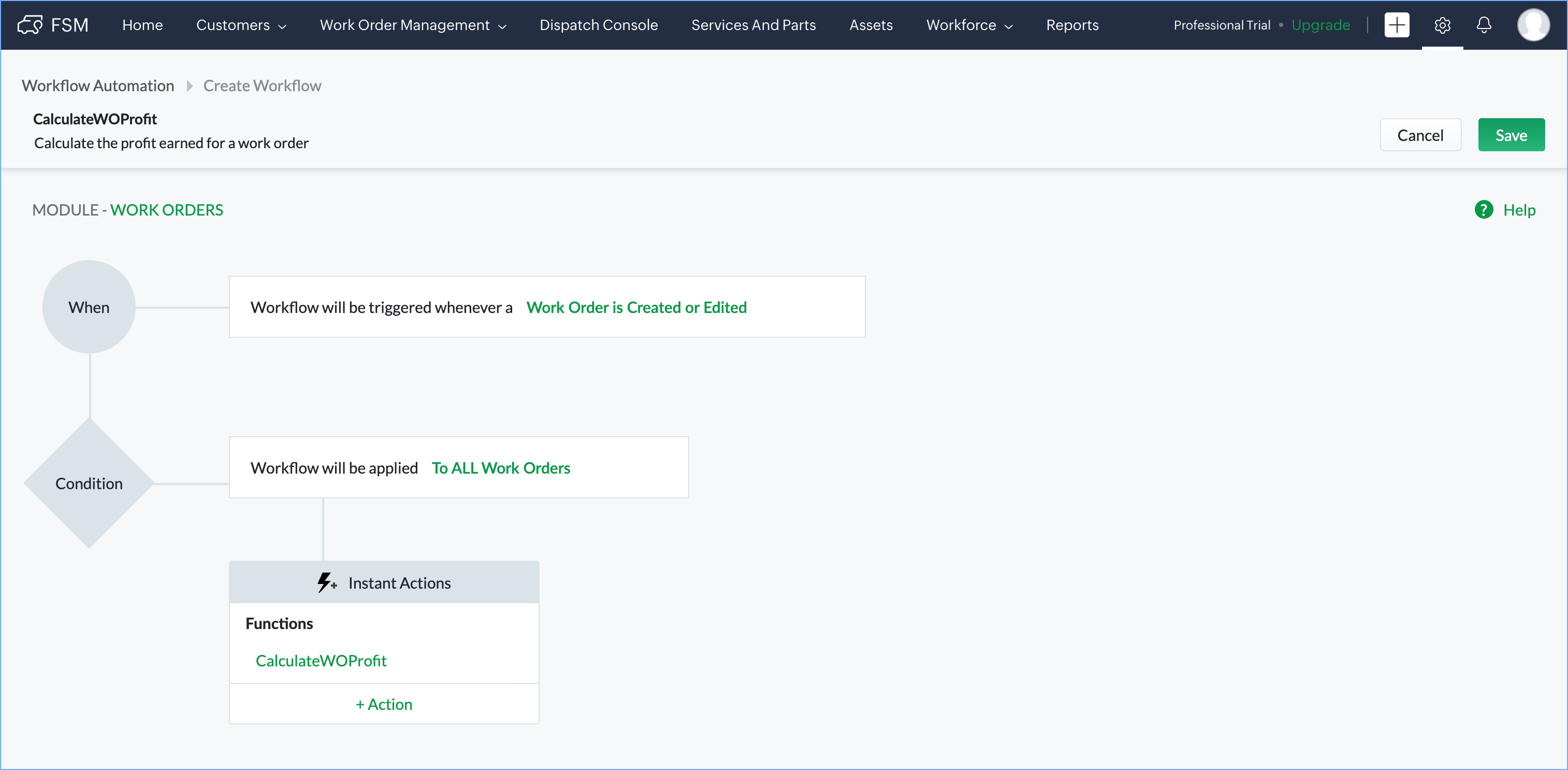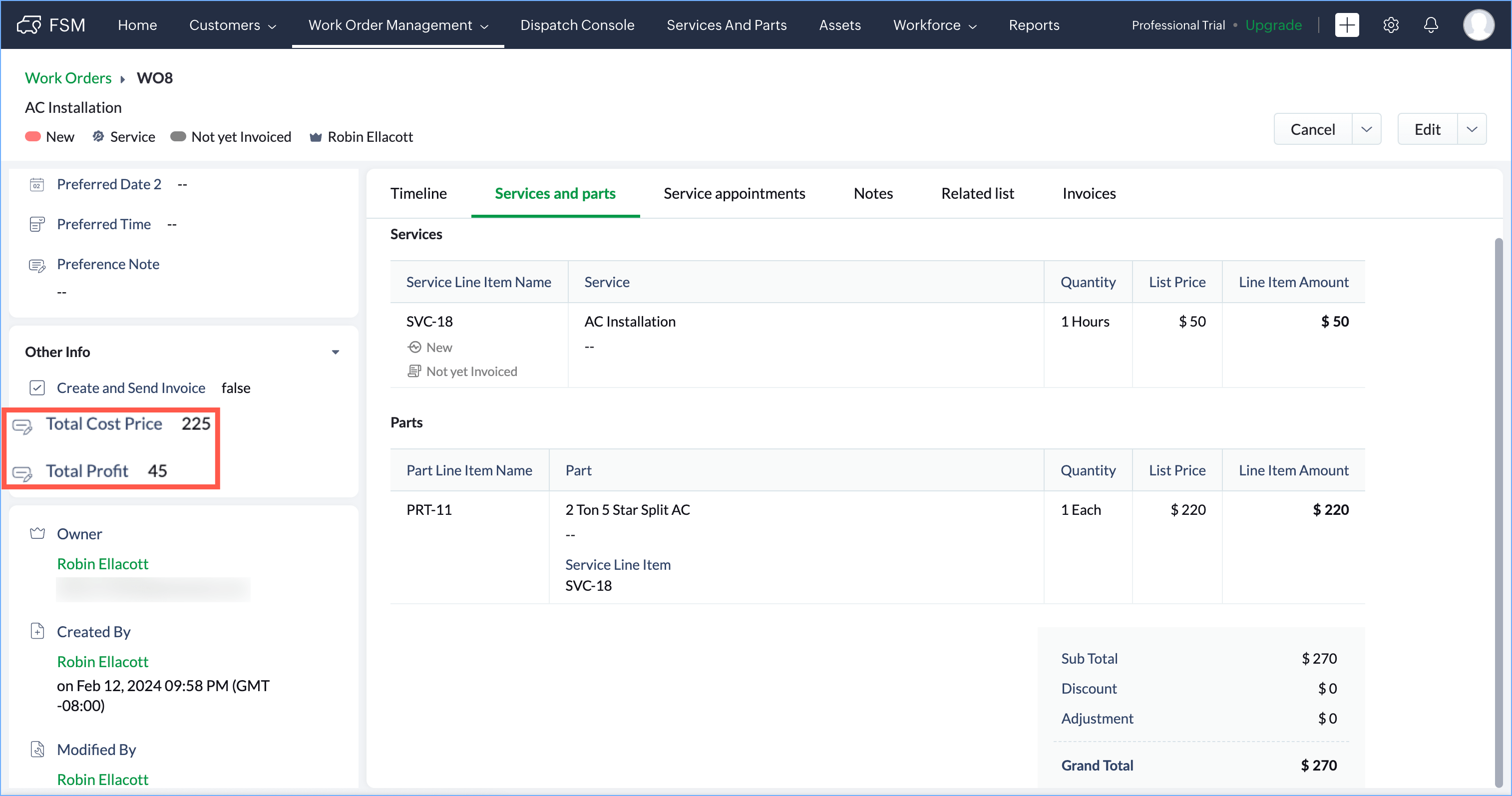 Work Orders | Total Profit | Decimal | Whenever the workflow is triggered, this field will be populated with the profit earned for the work order. |